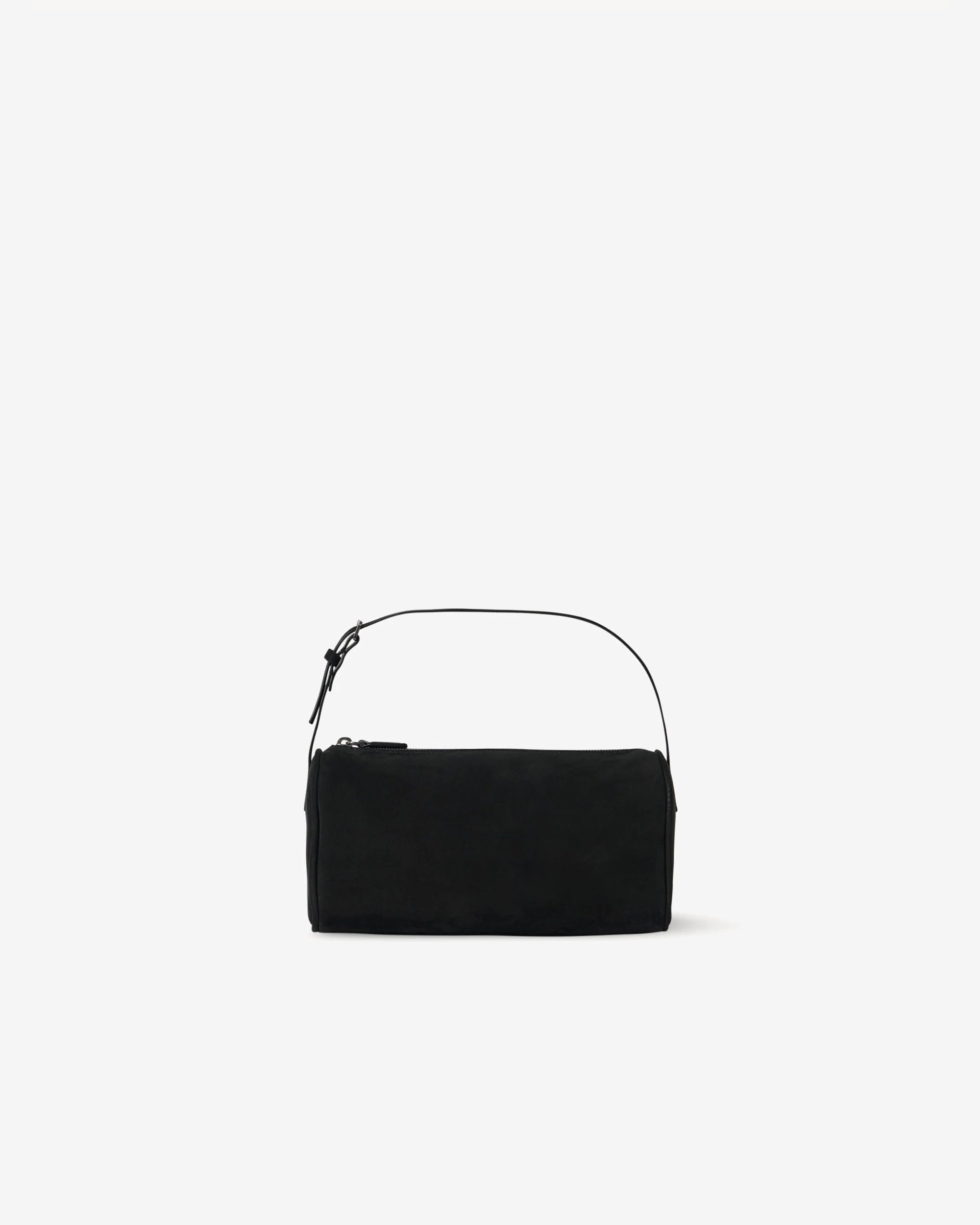 Top handle bag in soft nubuck leather with rounded edges, leather piping, and an adjustable slim strap. The natural grain surface is lightly buffed for a refined suede-like finish.