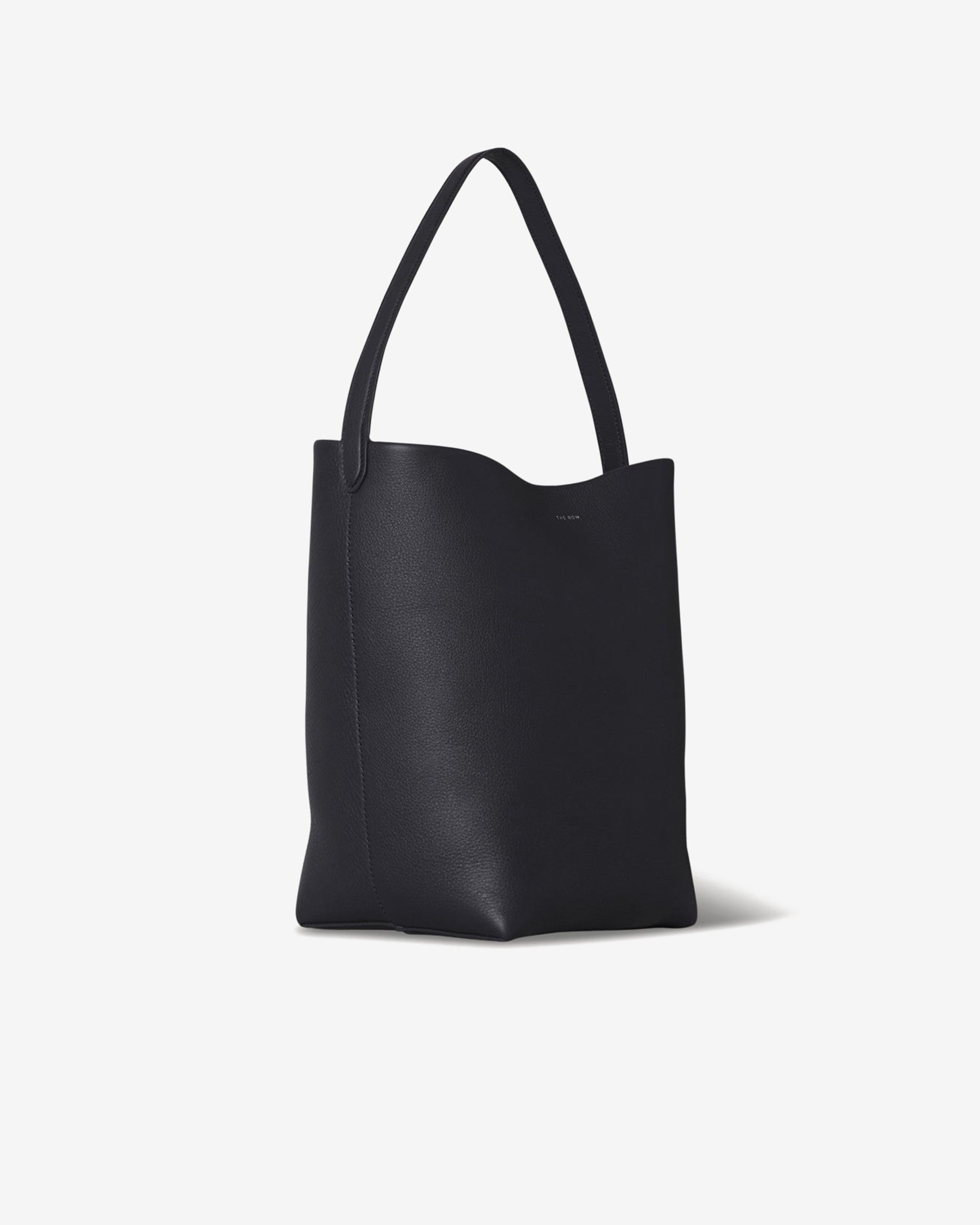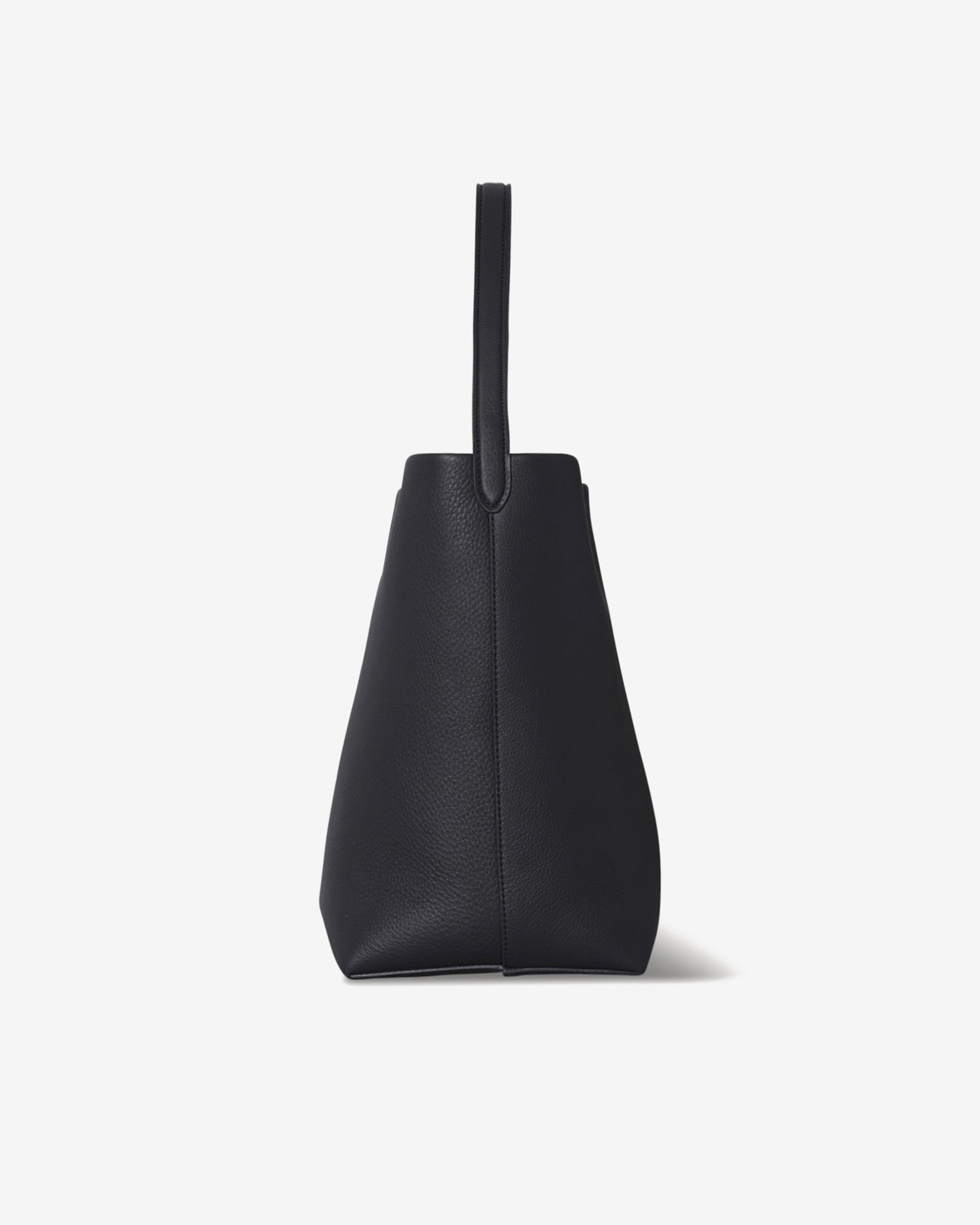 Classic tote bag in grained calfskin leather with interior toggle closure and flat handle.