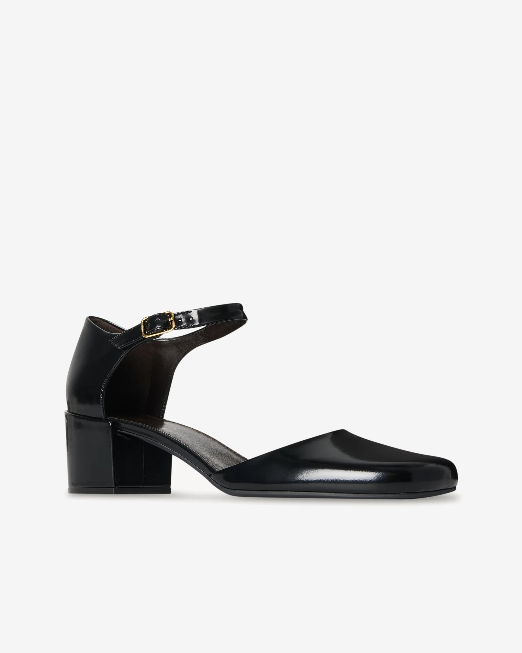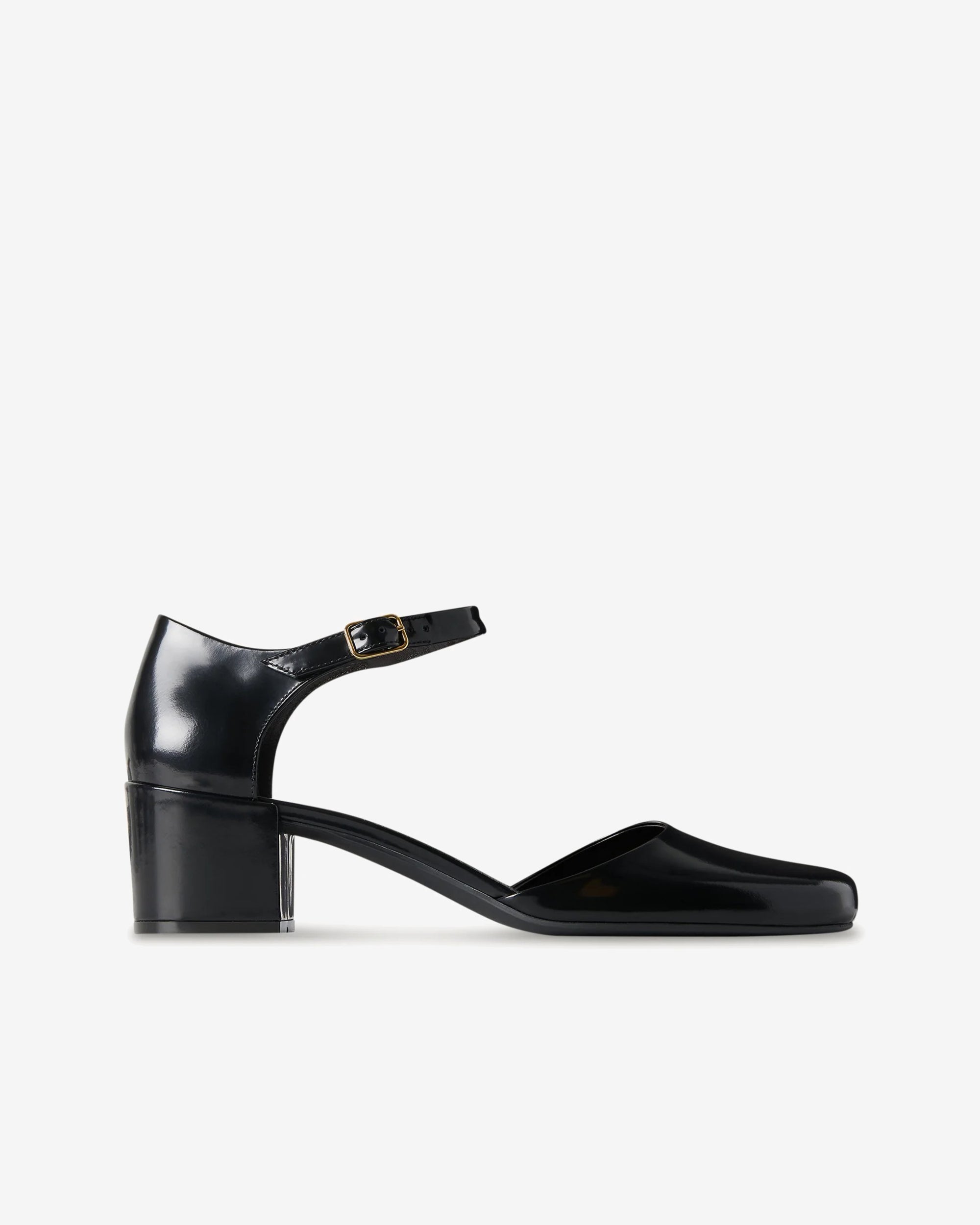 Low-heeled shoe in glossy patent leather with square toe, adjustable buckled ankle strap, and rubber sole.