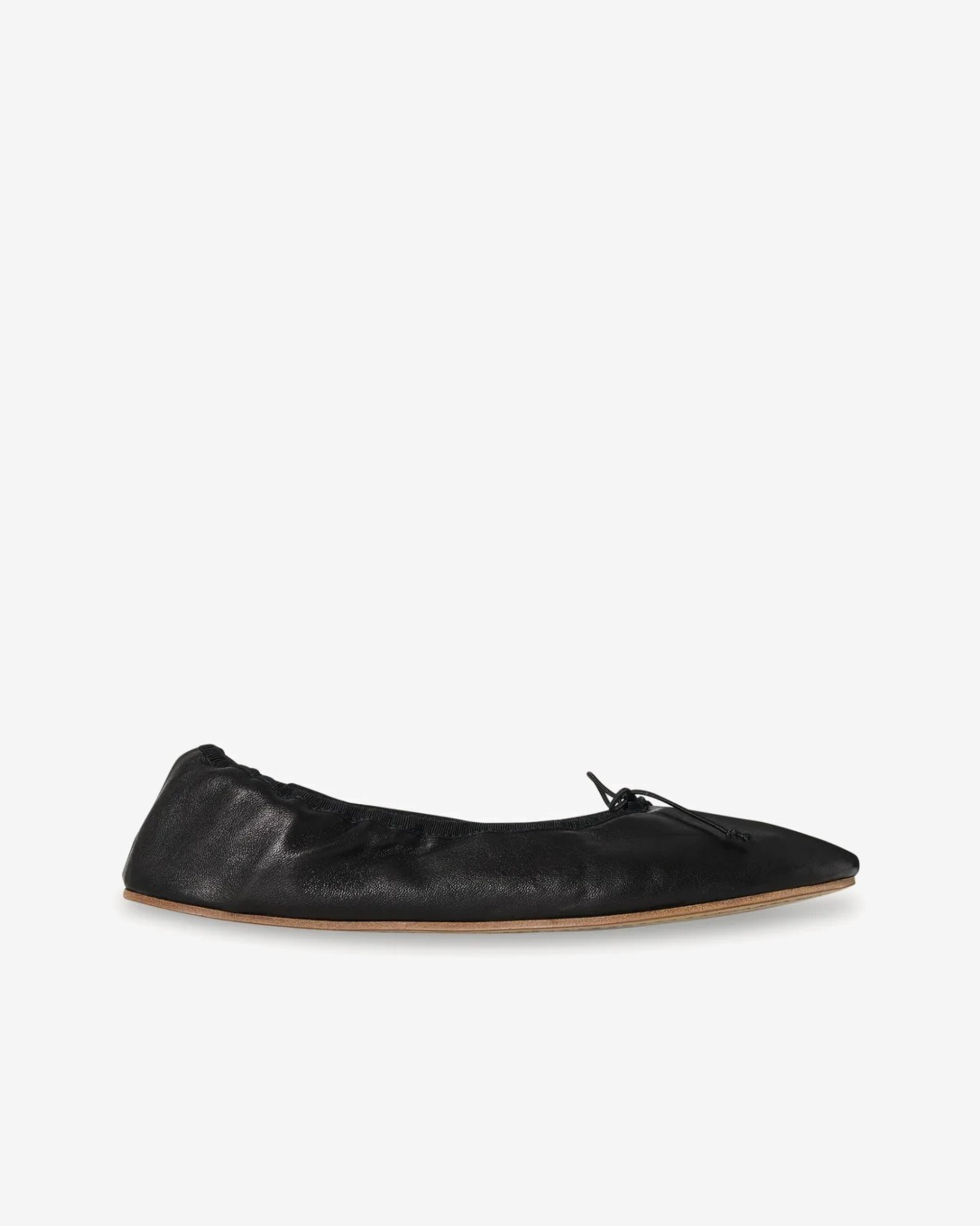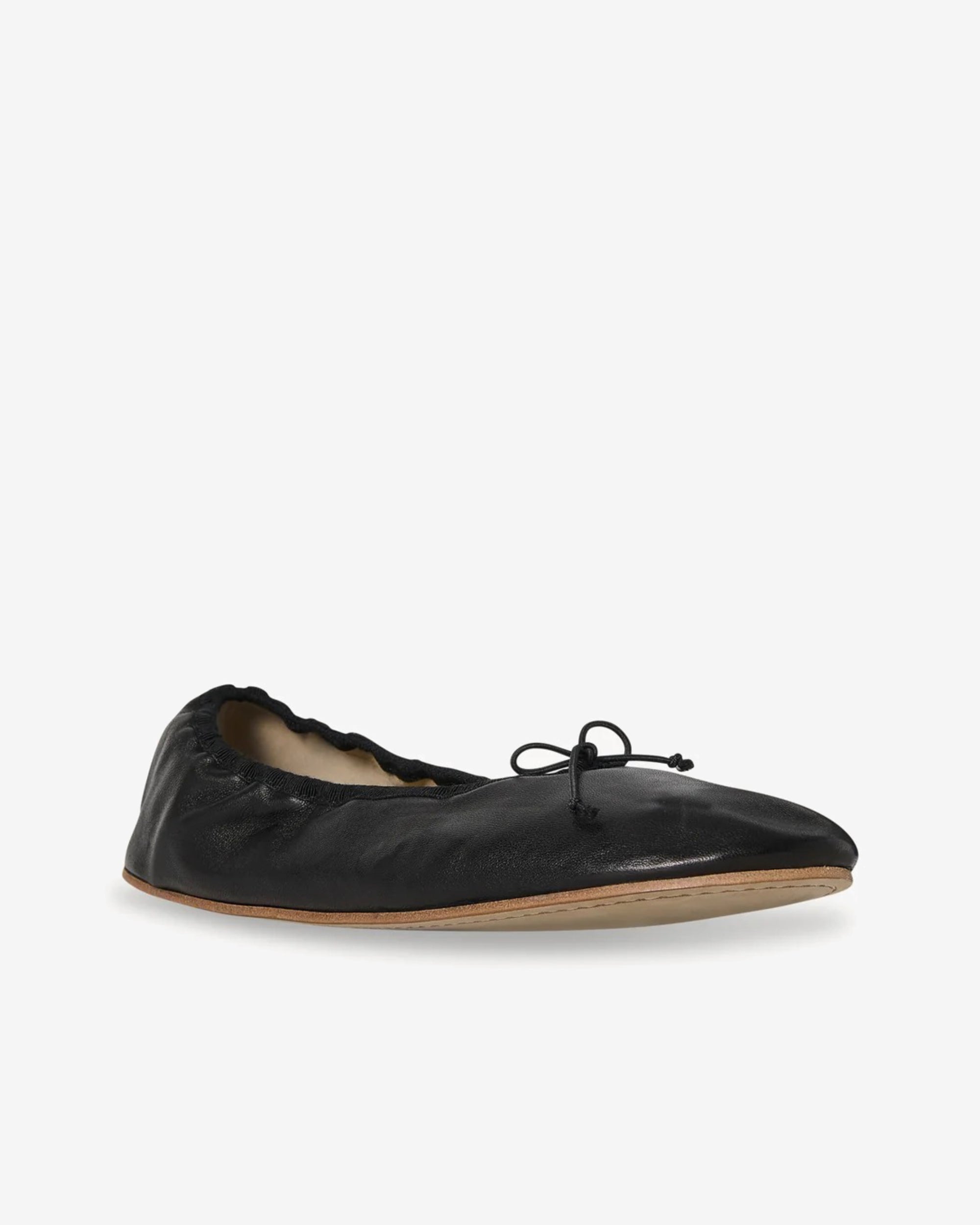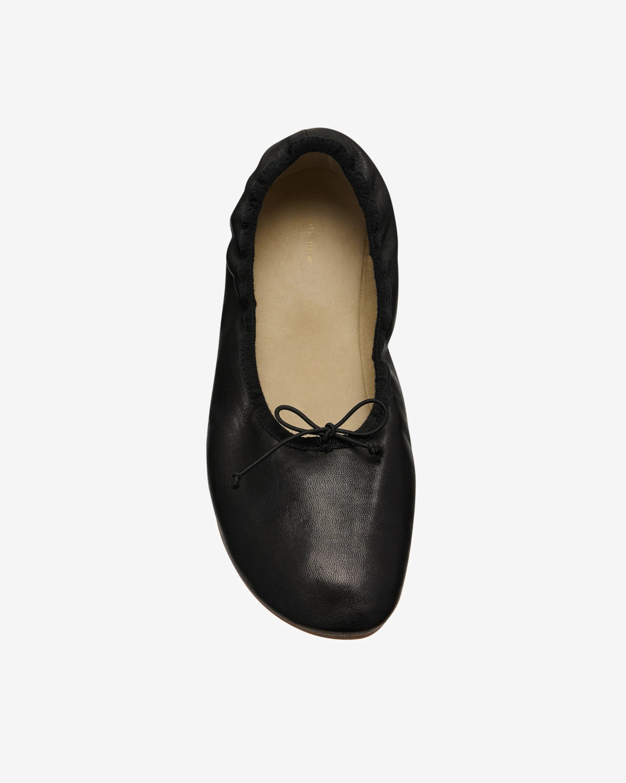 Classic ballet flat in smooth nappa leather with grosgrain piping, adjustable elastic tie, and flexible leather sole.