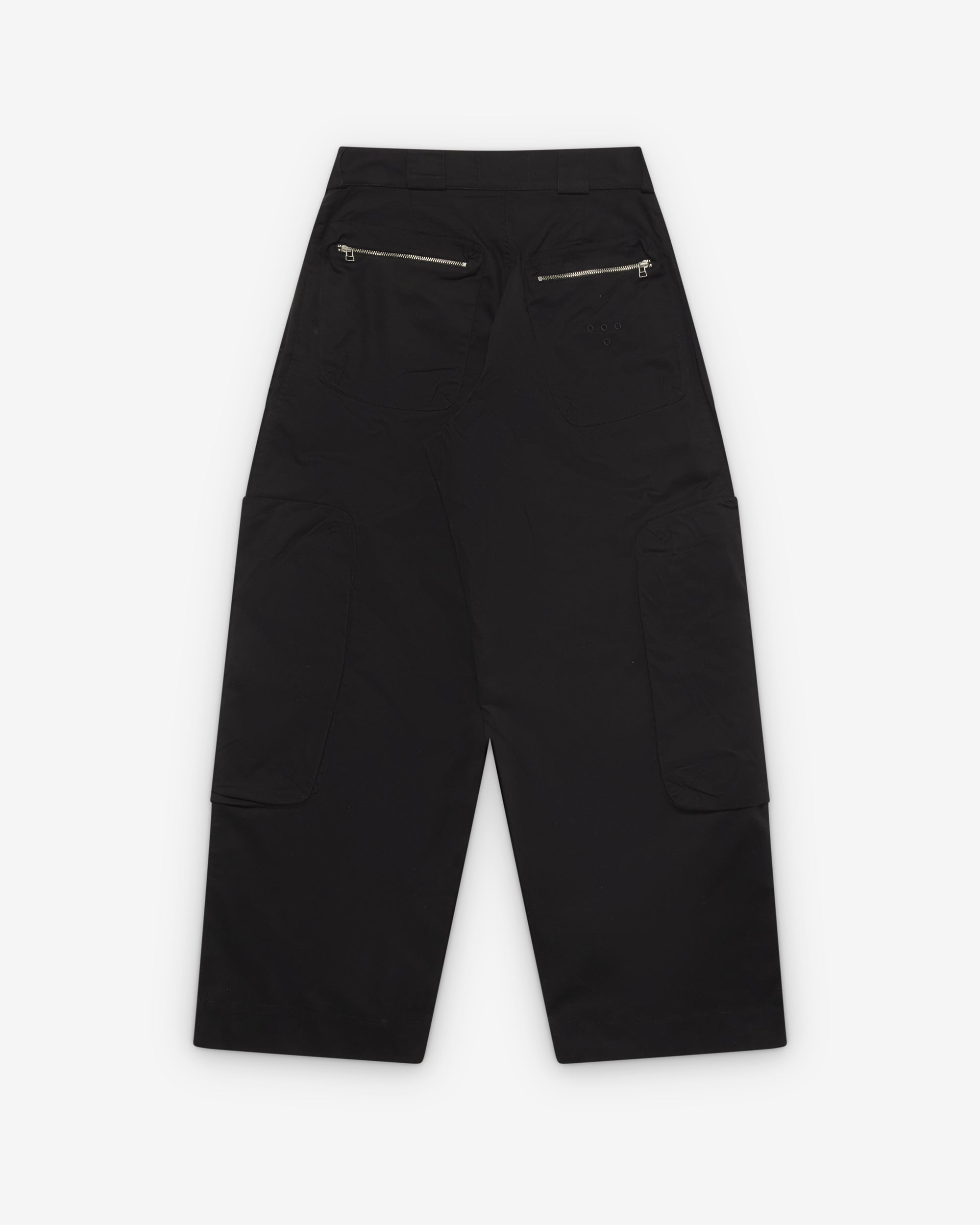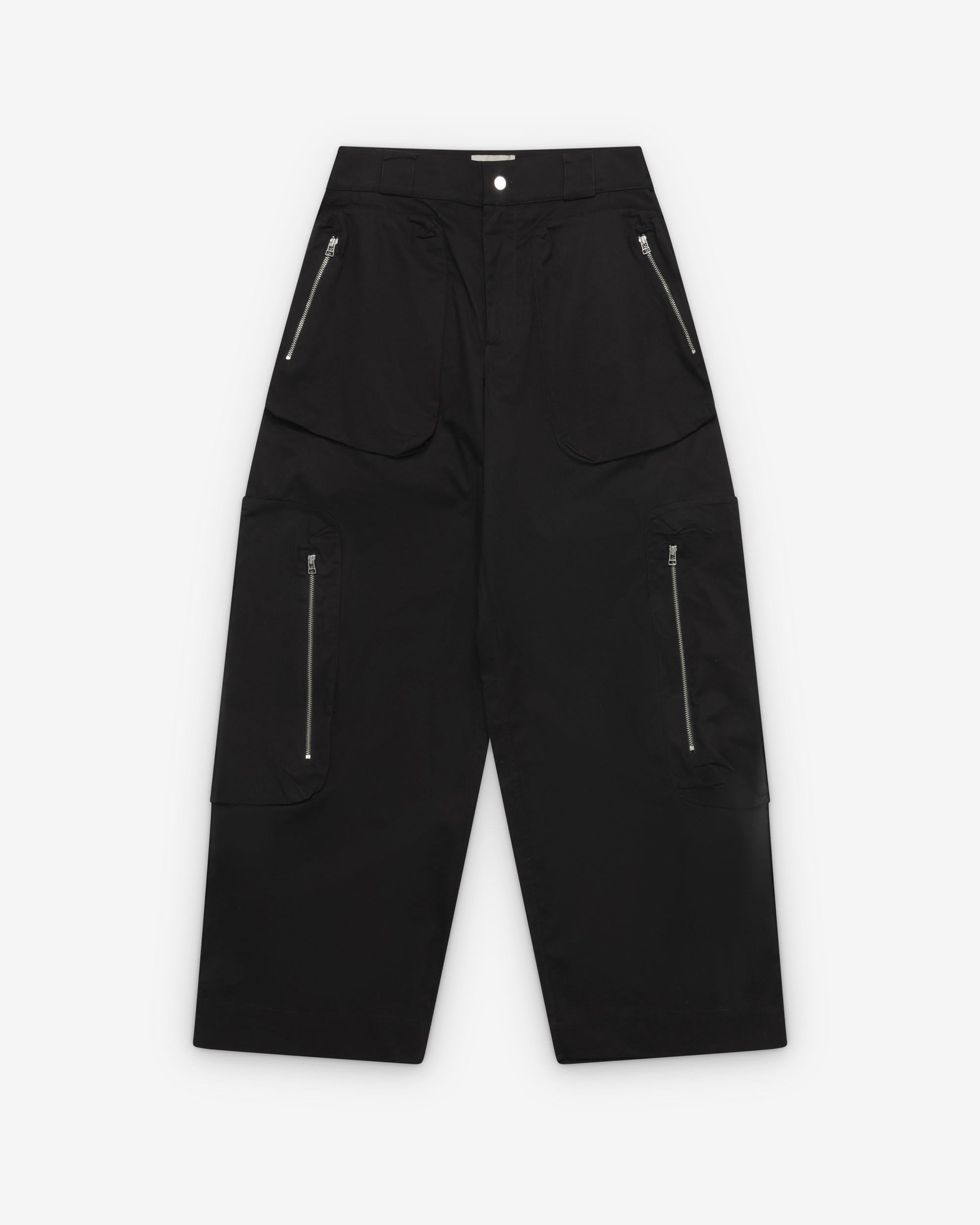 Button waist, zip flyFront zip pocketsLoose fitZip leg cargo pocketsZip back pockets