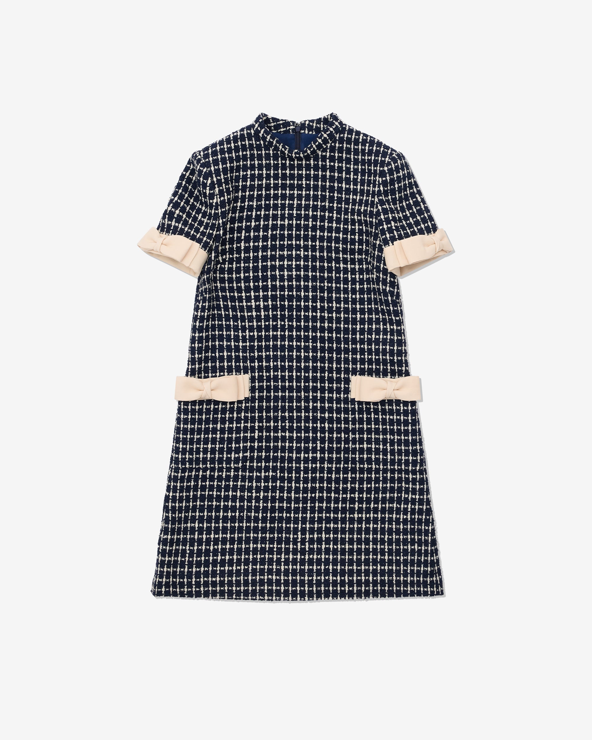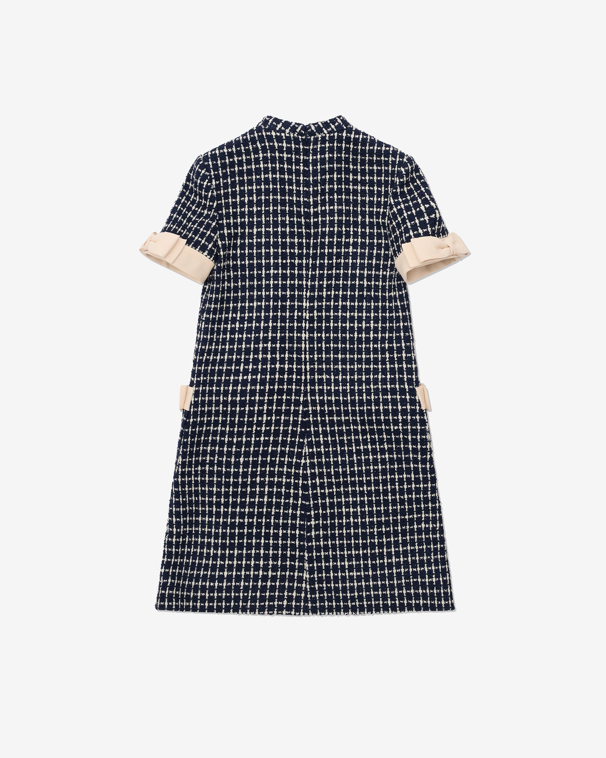 Short Bouclé dress with satin bowsPocket detailsRear zip closureBouclé squareJacquard Flower VLogo lining