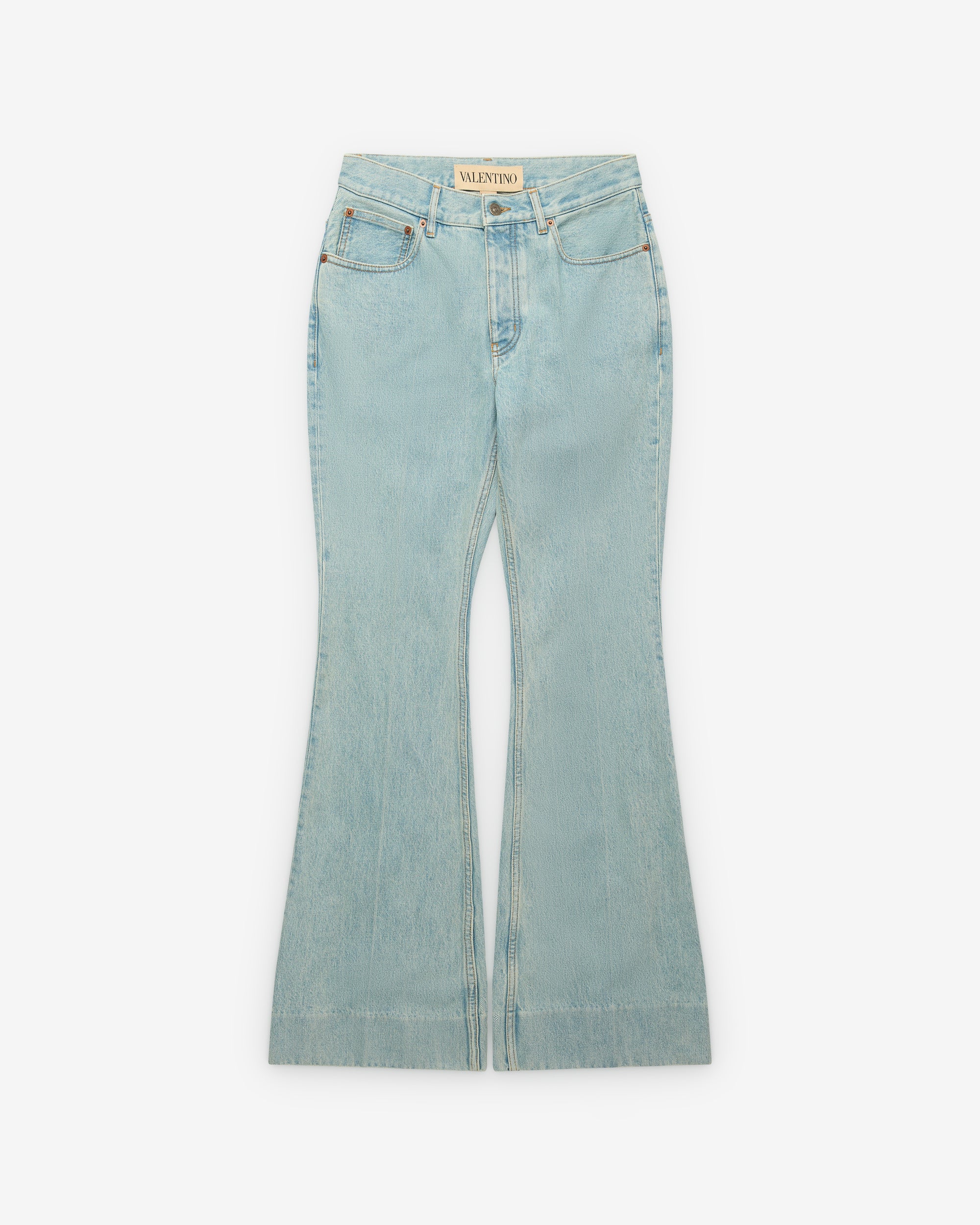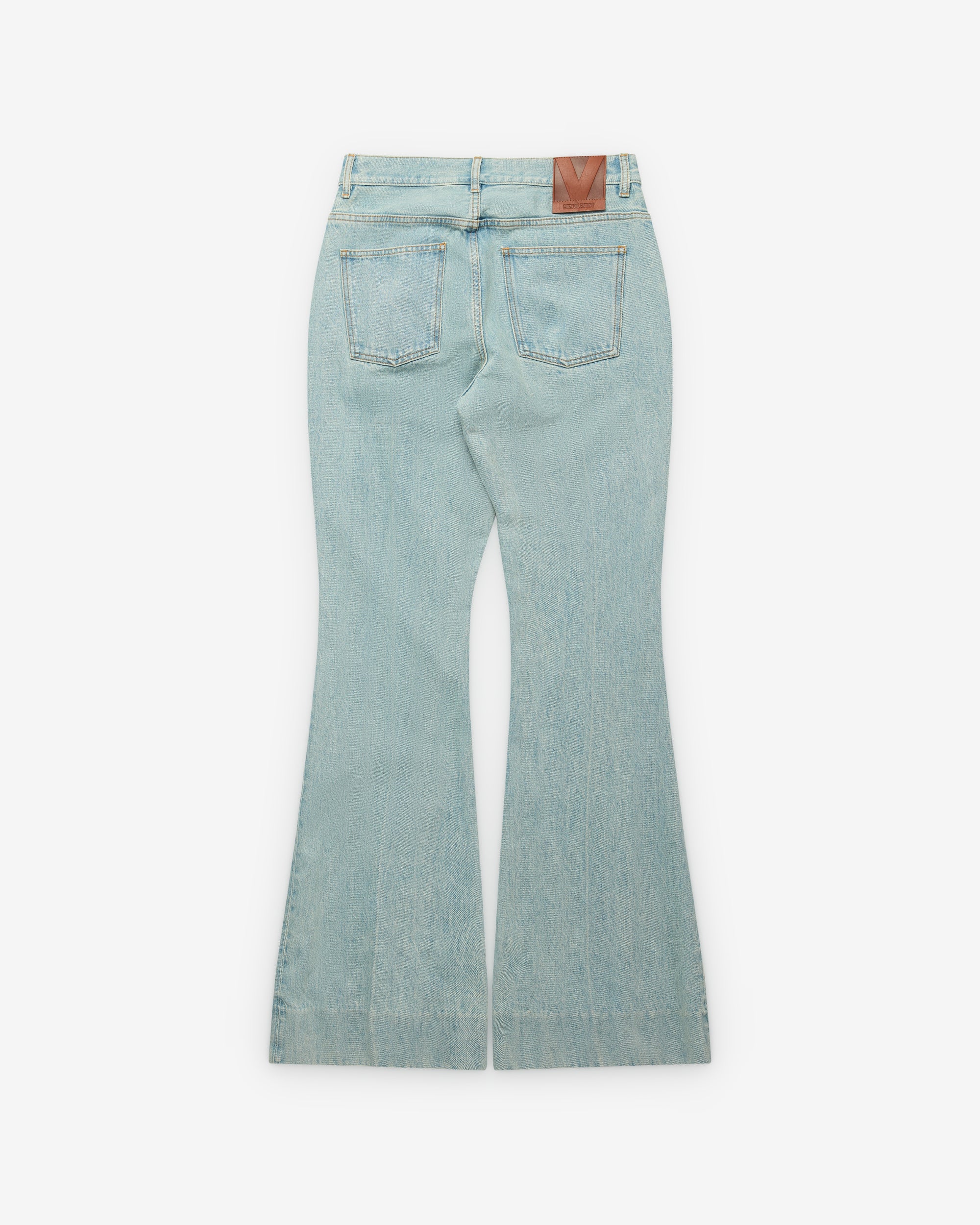 Flared fitButton waist, zip flyFront and back pocketsGraphic leather patch at waist