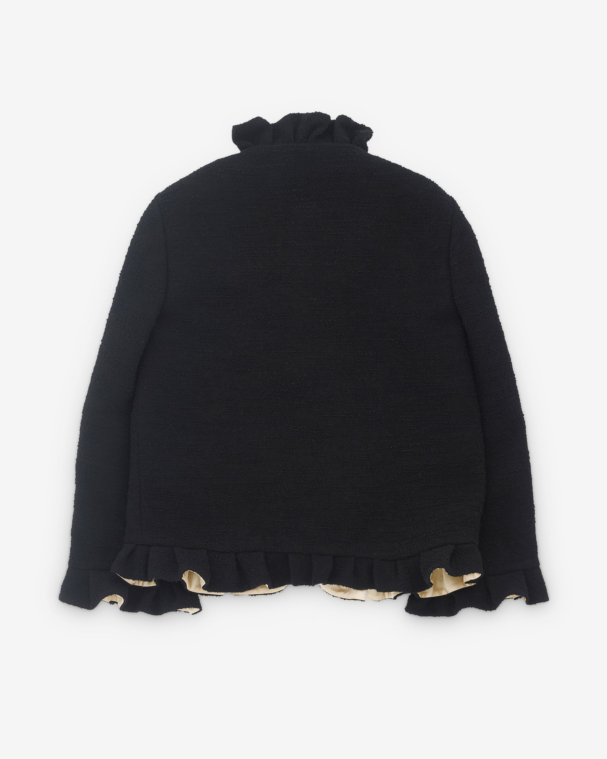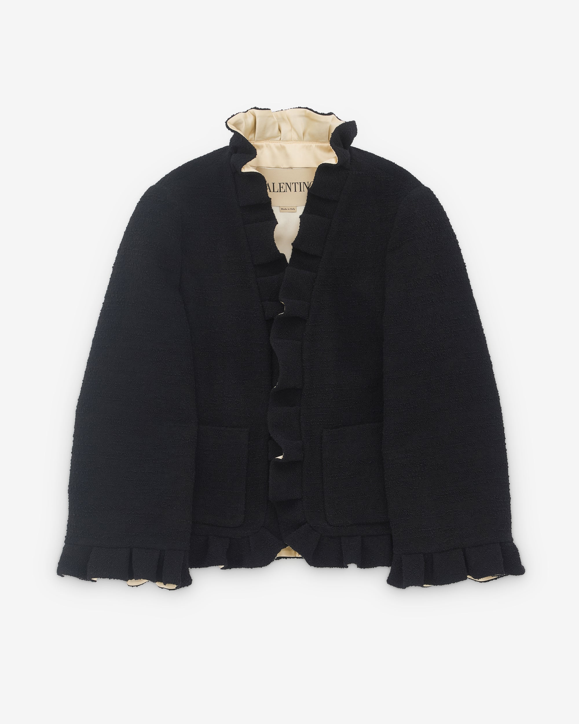 Ruffle necklineConcealed button closureFull internal satin liningRuffle cuffs and hem