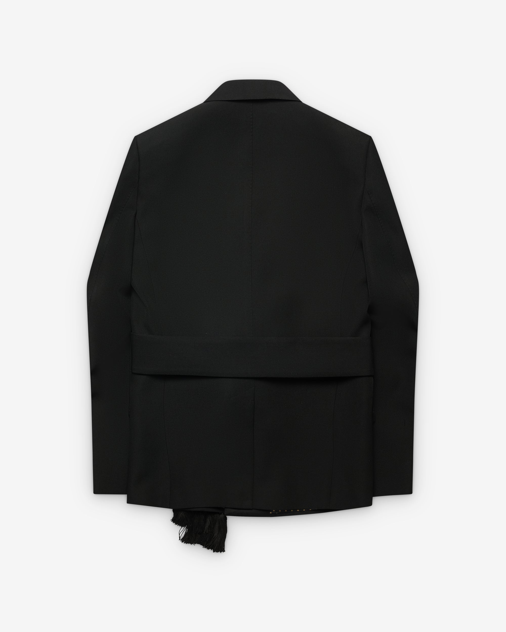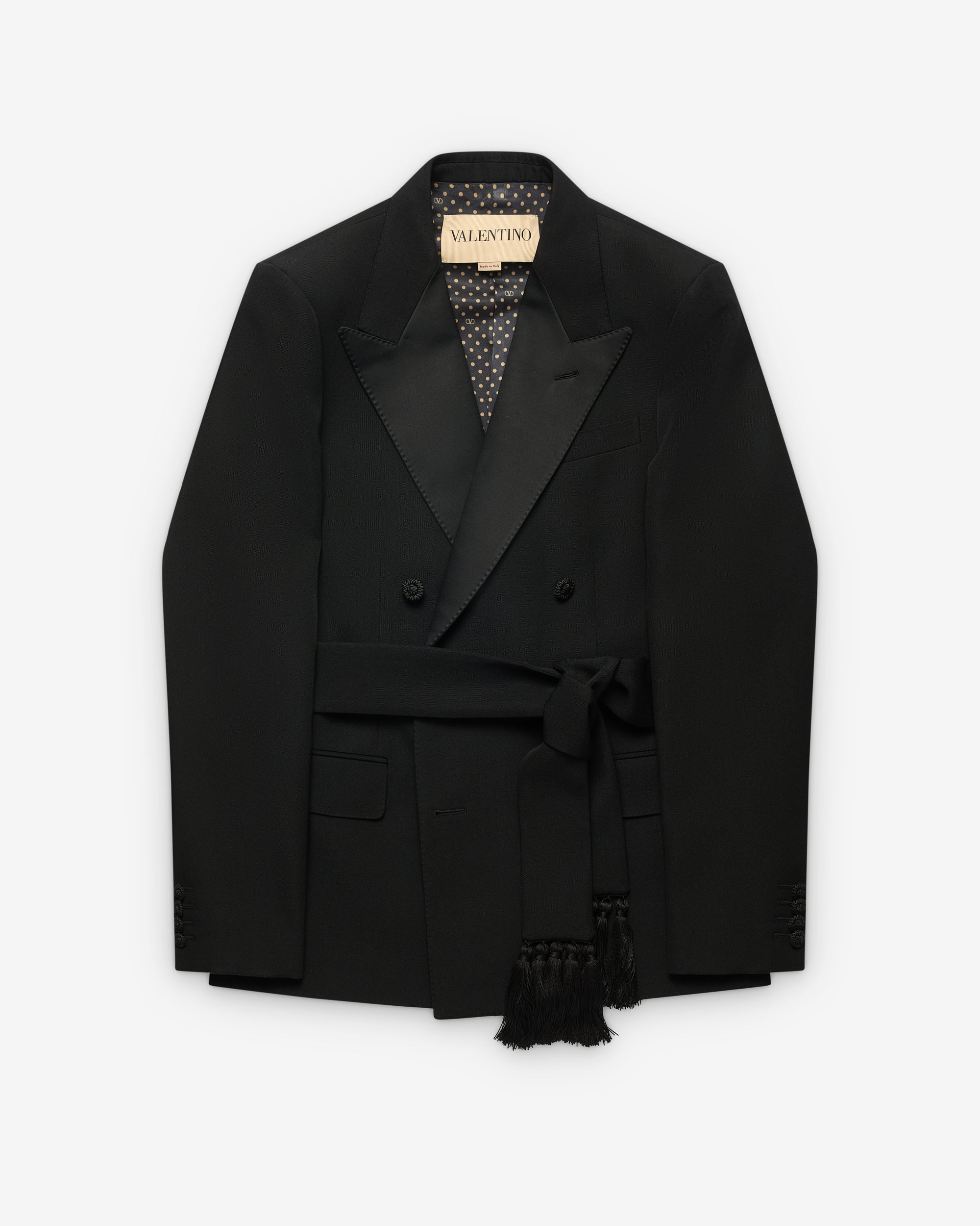 Double breasted closureFull internal satin liningOversized peak lapelTie at waistStructured shoulderFront flap close pocketsTassel detail at tie