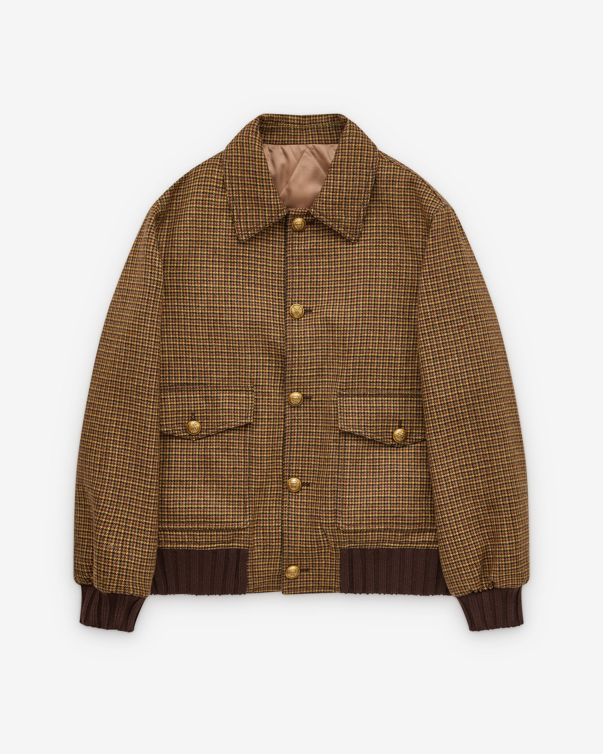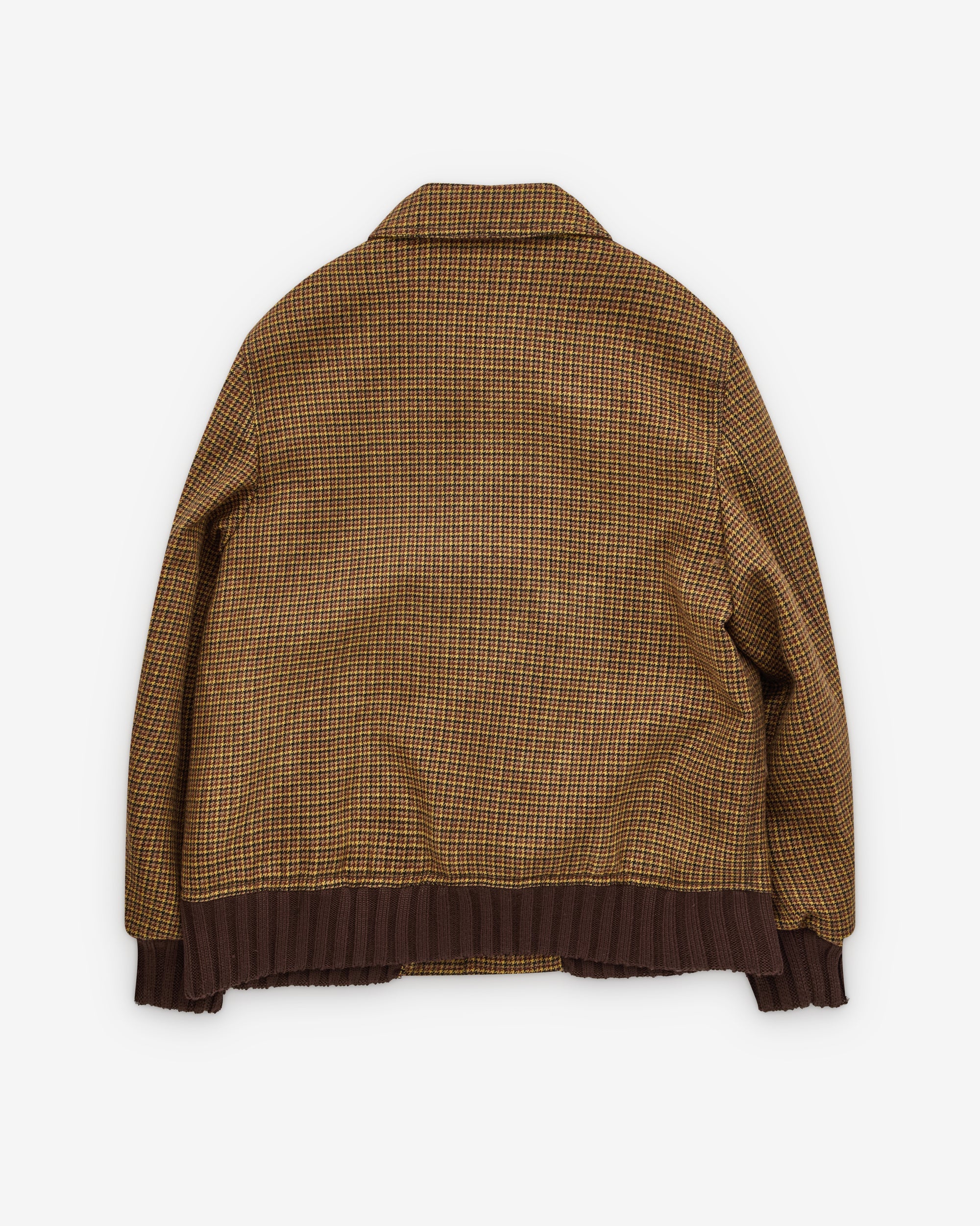 Classic jacket collarWool check outer fabricInternal liningTwo front flap pocketsEngraved button closureElasticated cuffs and hem