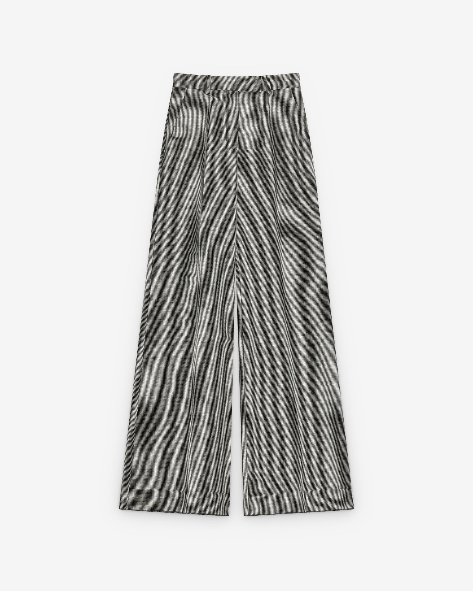 Hook and eye close waistPleated frontSide seam slip pocketsStraight leg Dogtooth check fabric