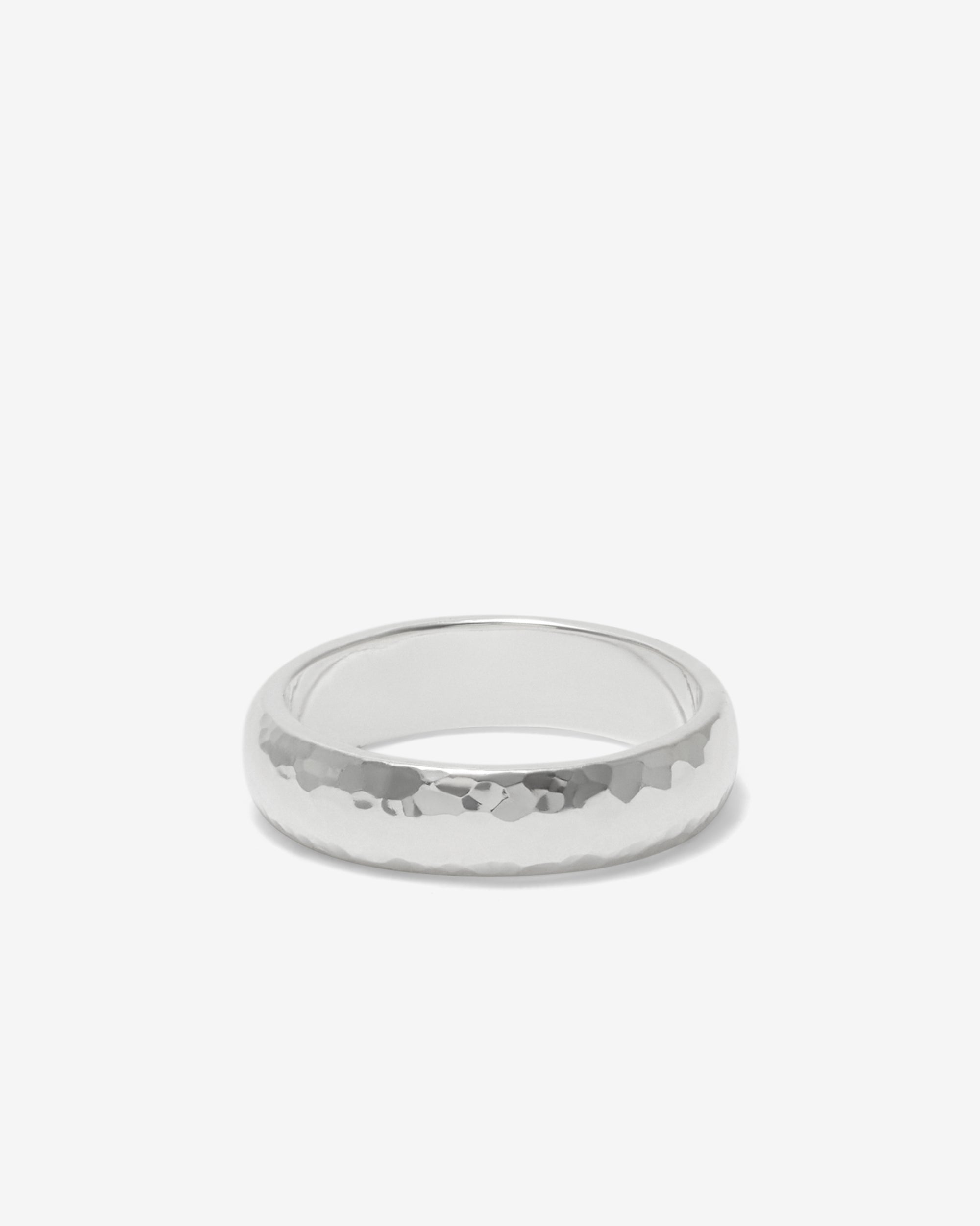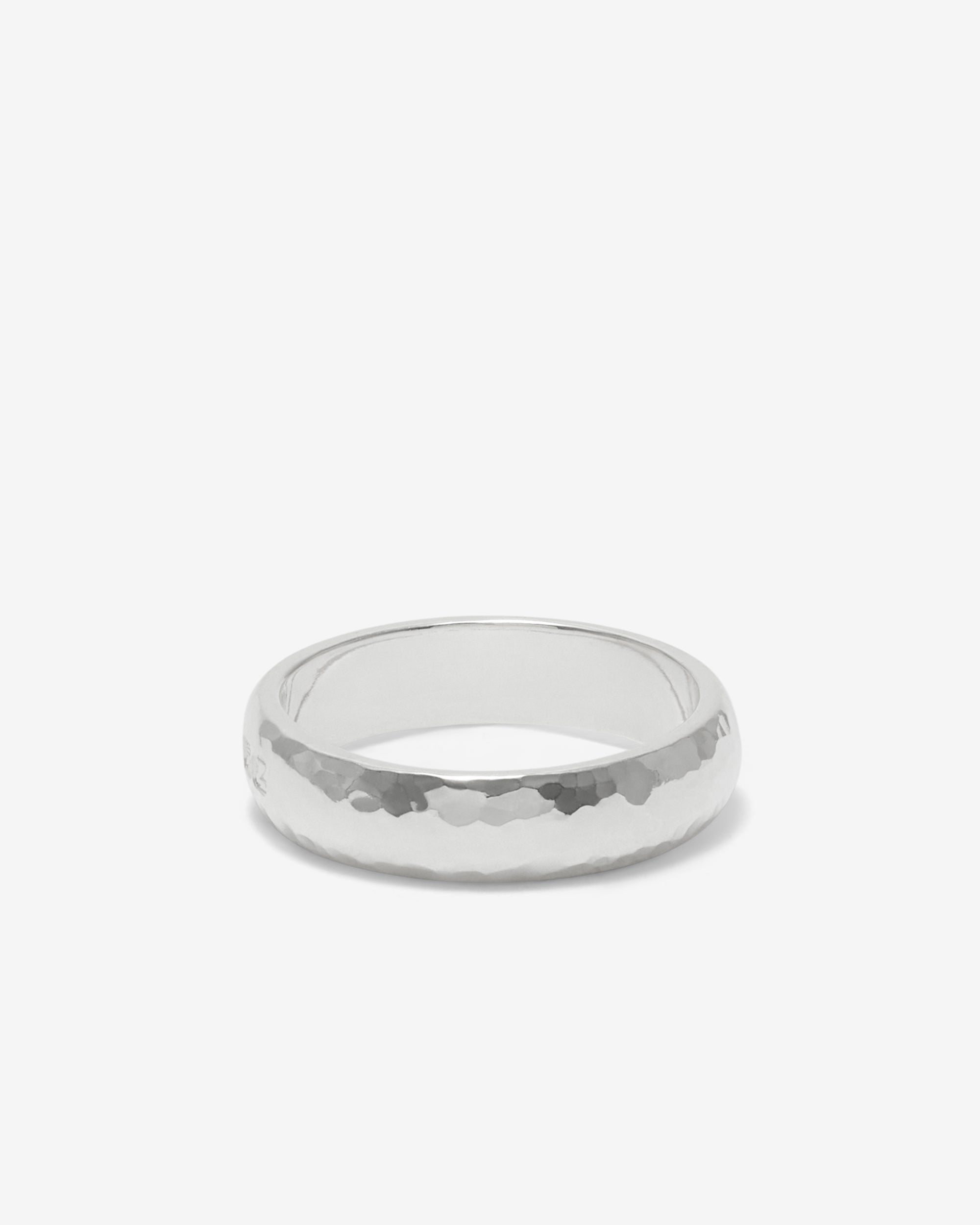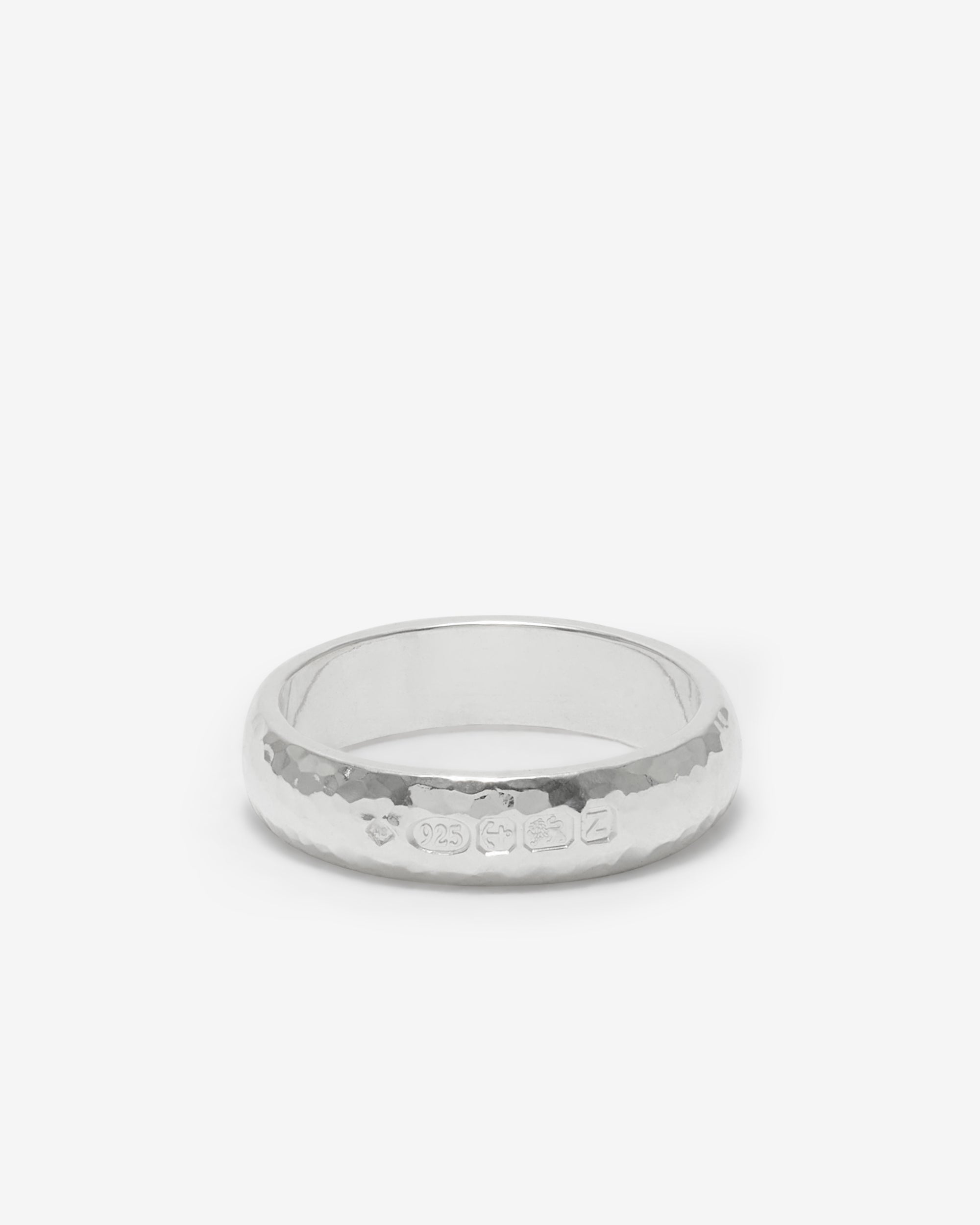 Simple band with hammered finish. Logo to back, with prominent hallmark to the side of the band. 5mm width.
