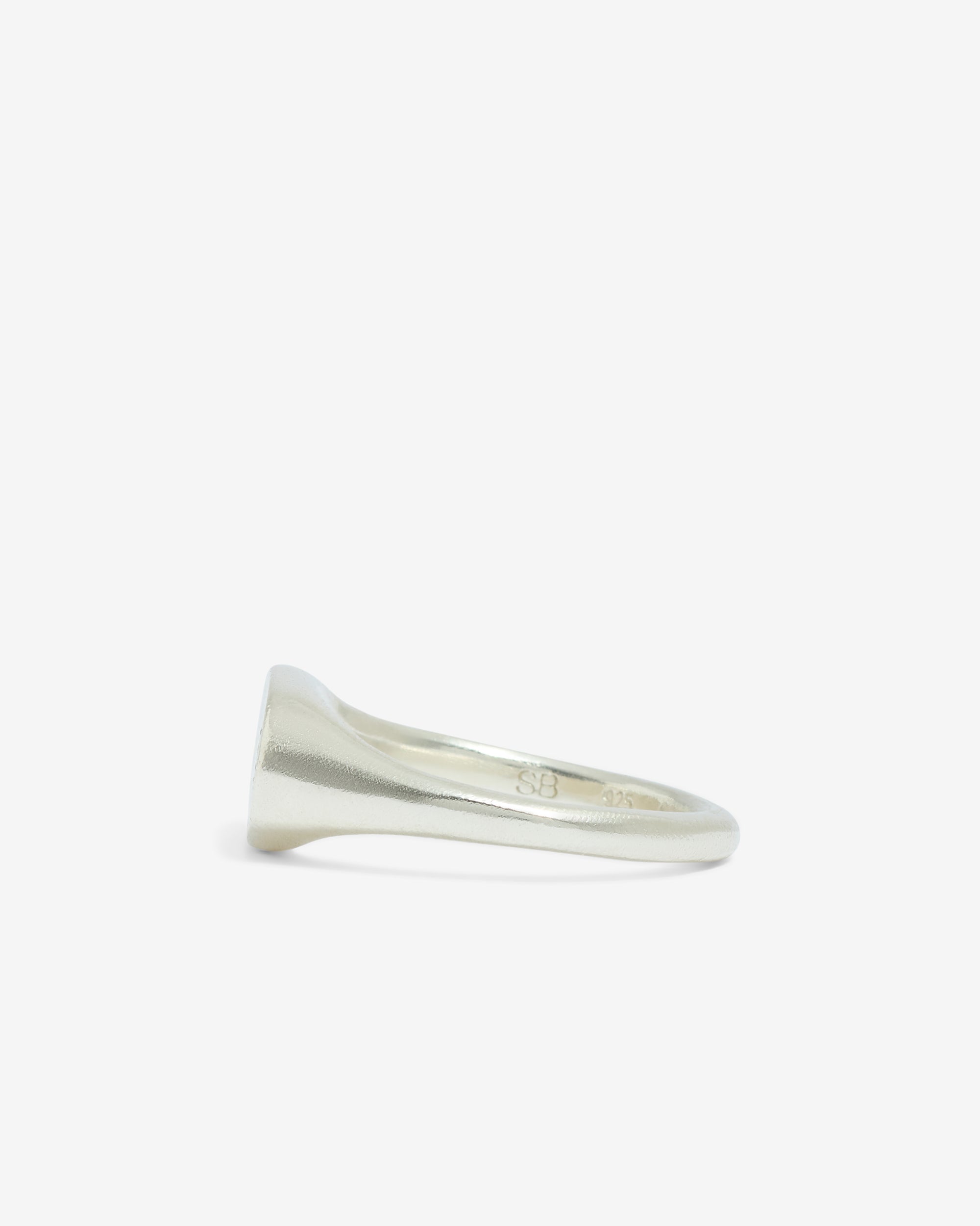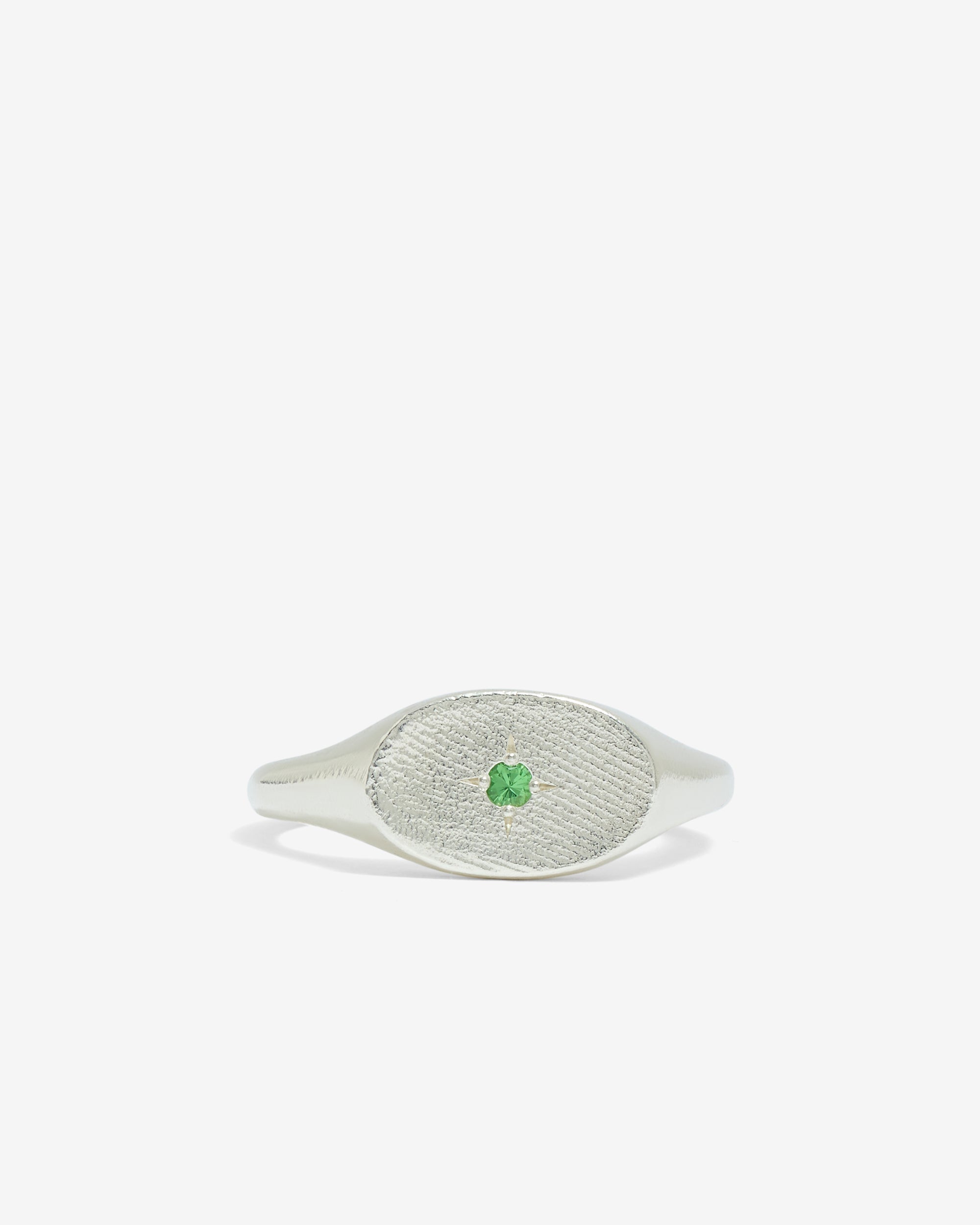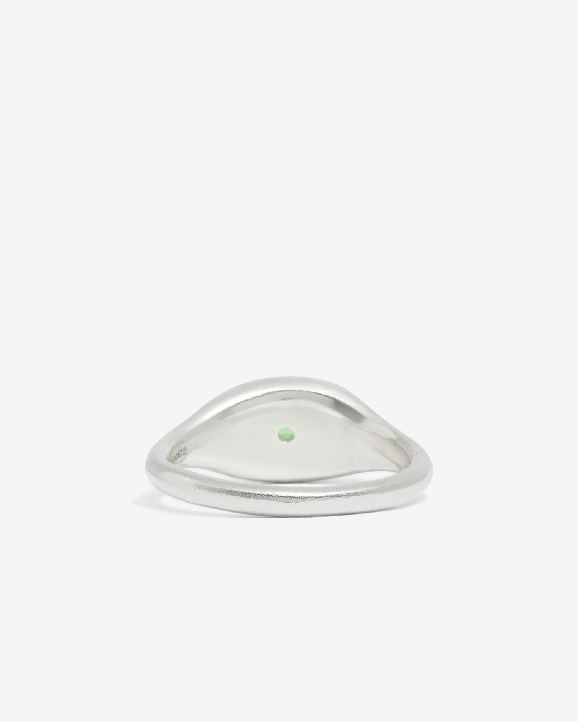 Rounded Sterling silver signet ring with tsavorite garnet. The ring face measures 13 x 8 mm. The band width is 2mm. Please contact if you would like more information or to receive images of how this item can be worn.