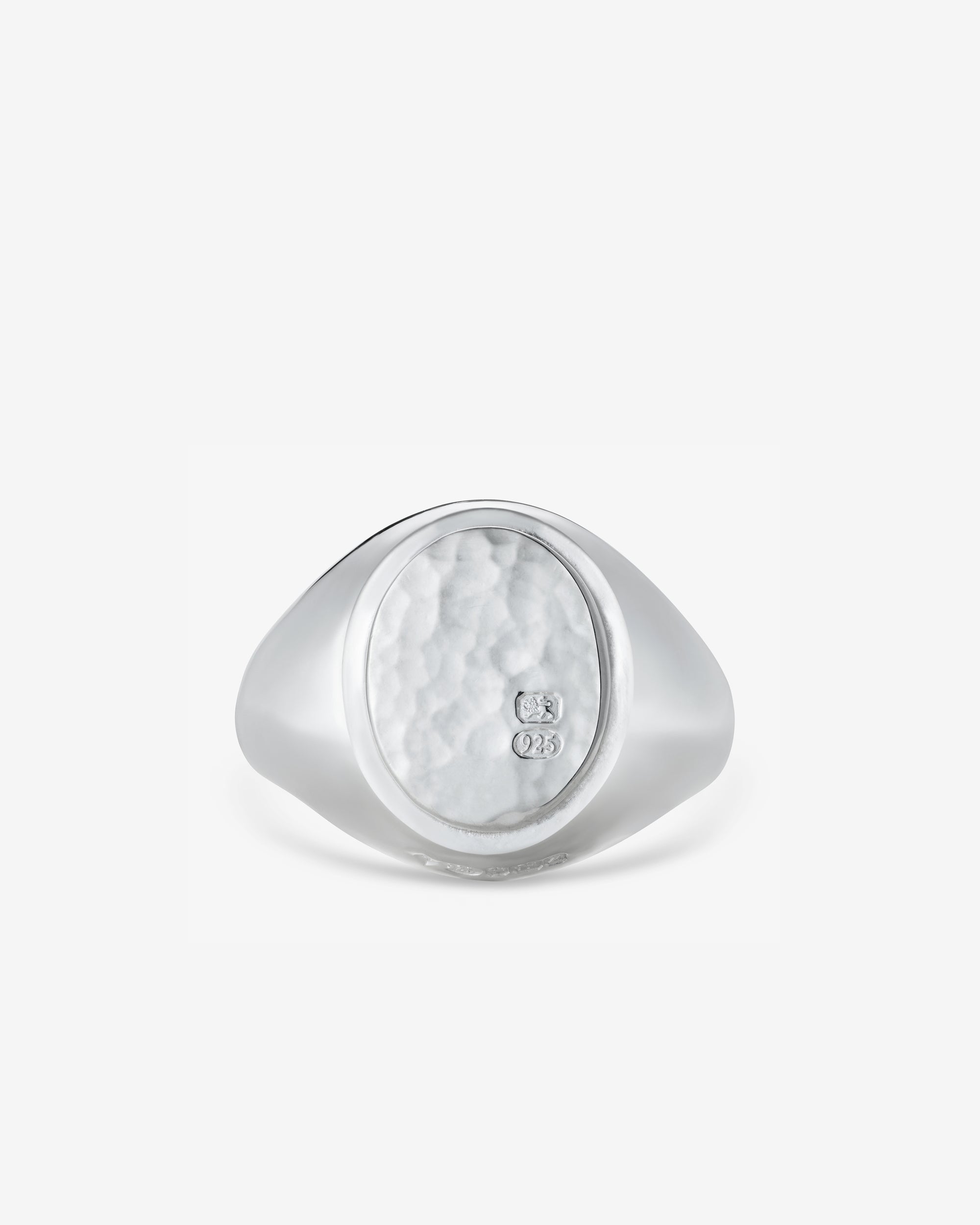 Classic oval signet ring with hallmark detail, with a hammered finish