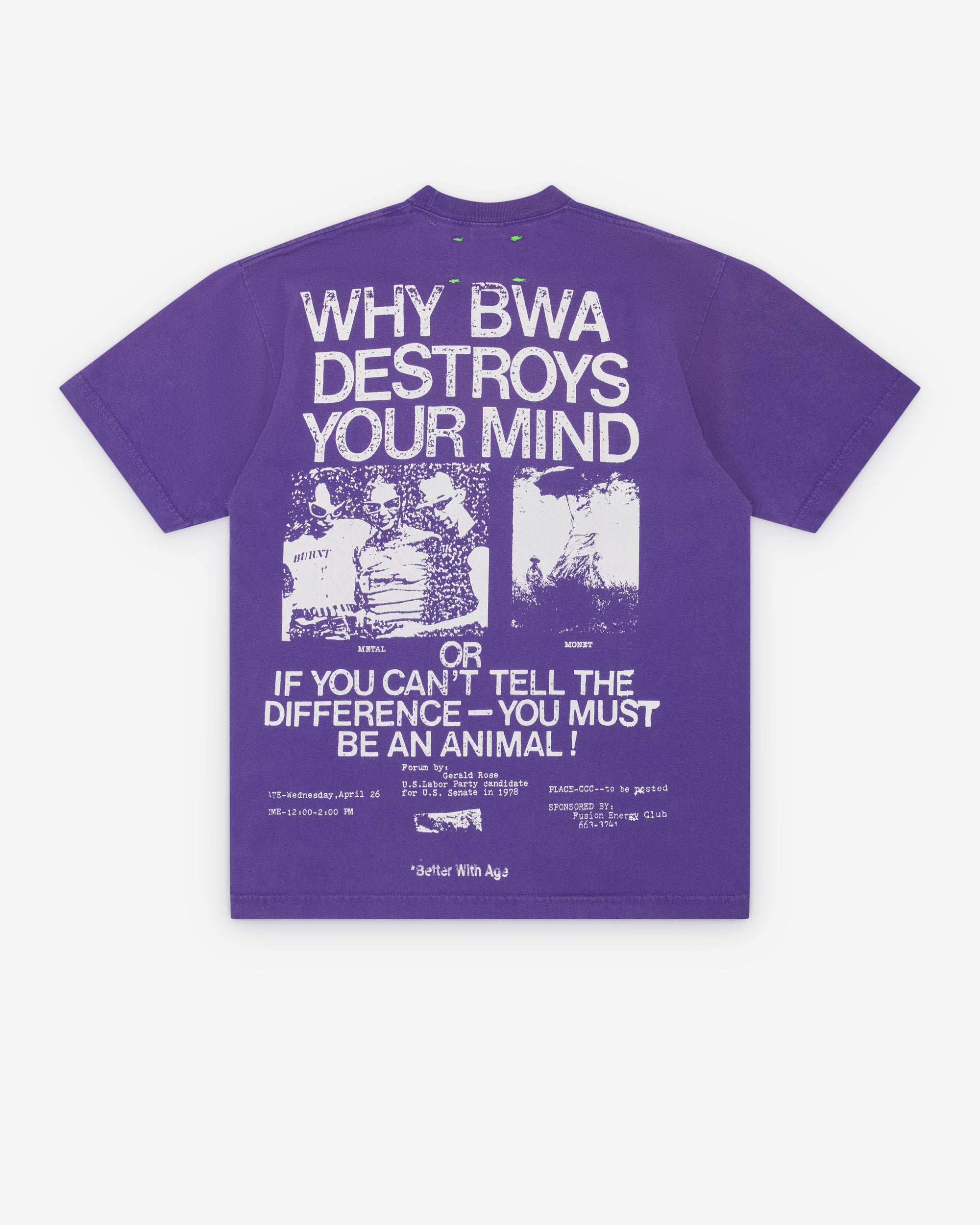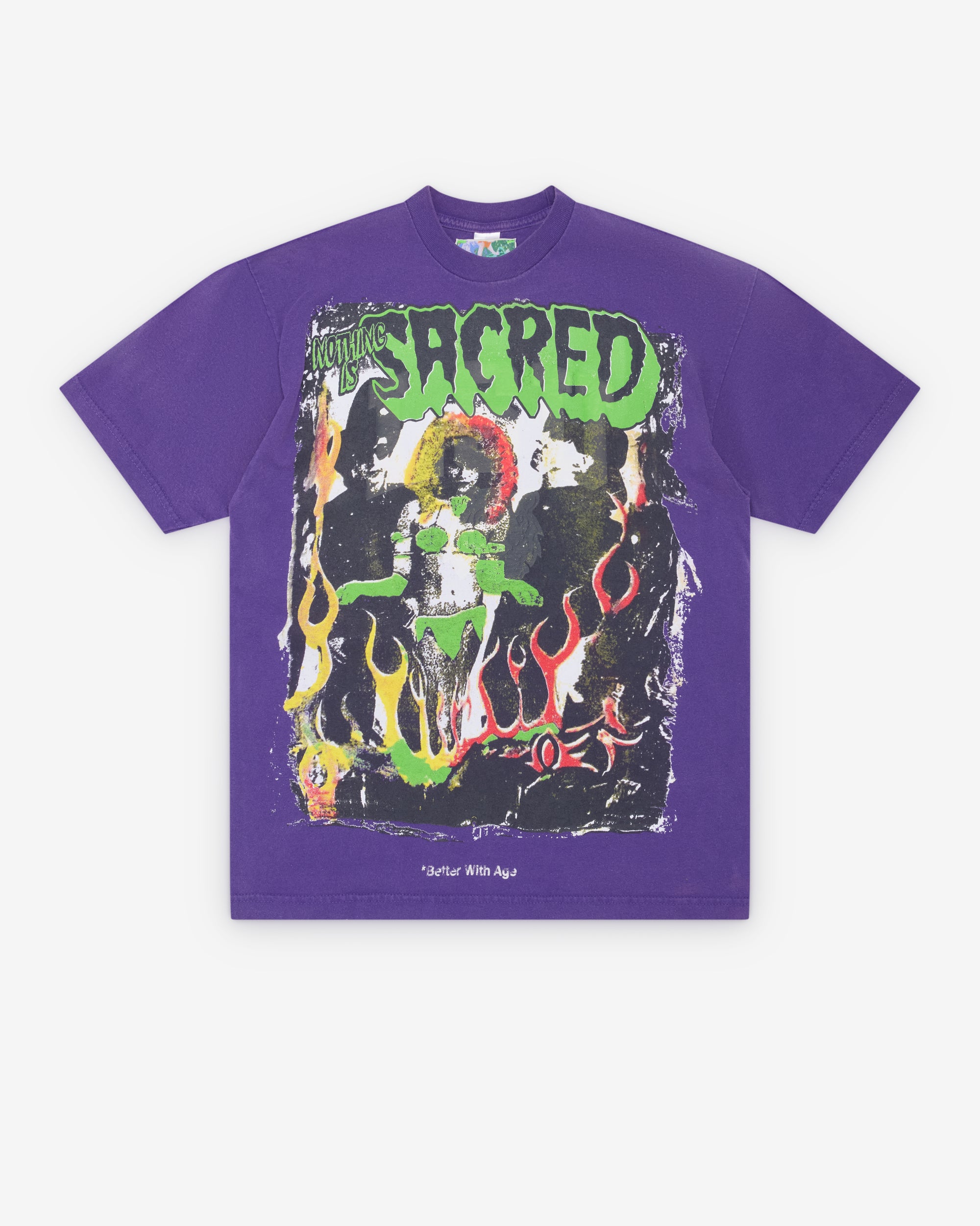 Crew neckShort sleevesPrinted graphic on front and backStraight hem100% CottonMade in The USAThis garment may display stains, blemishes, wear, or general signs of age.