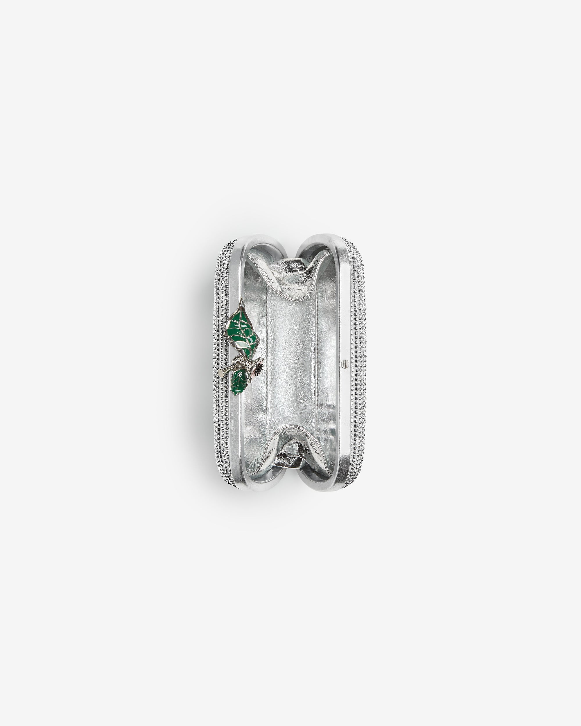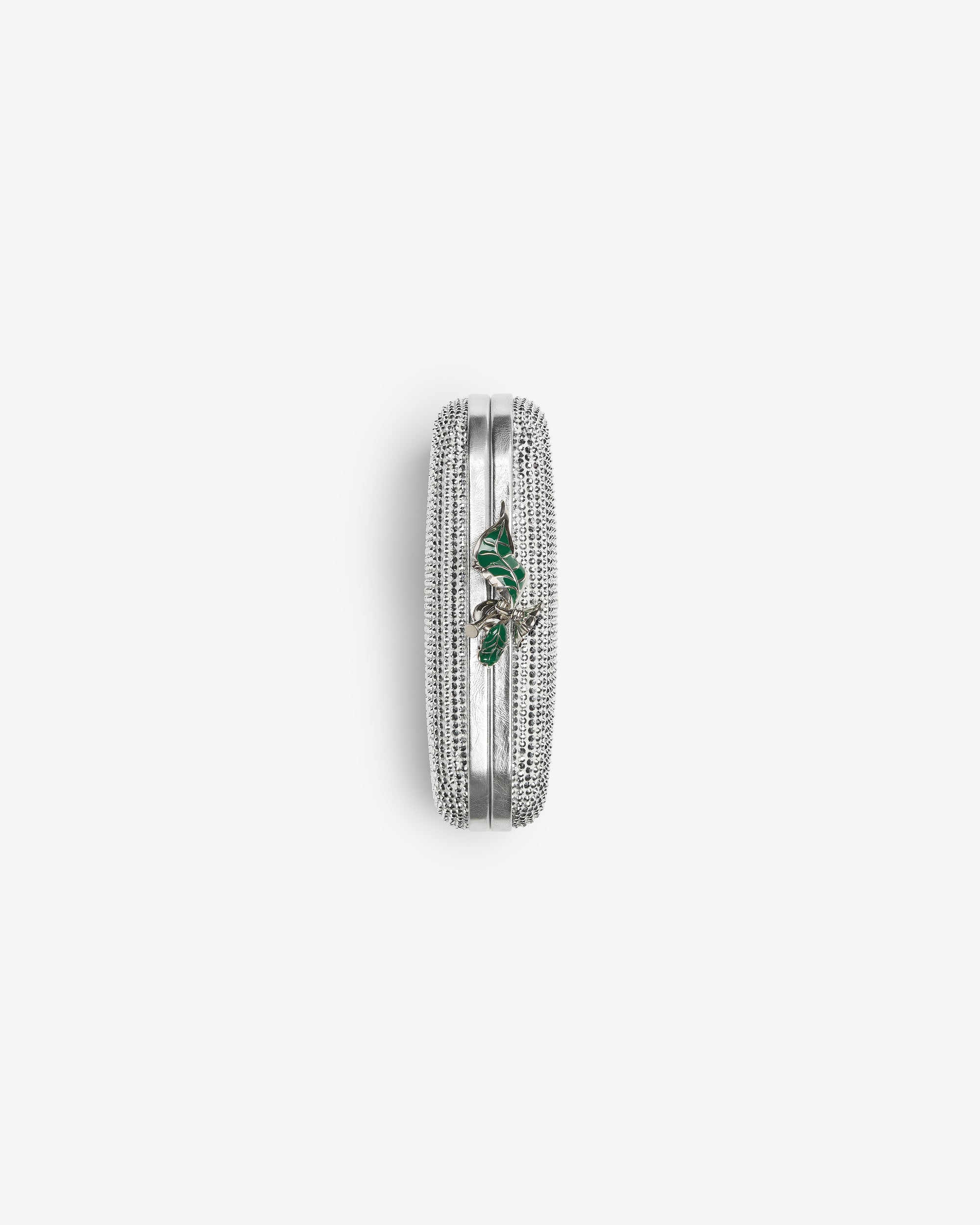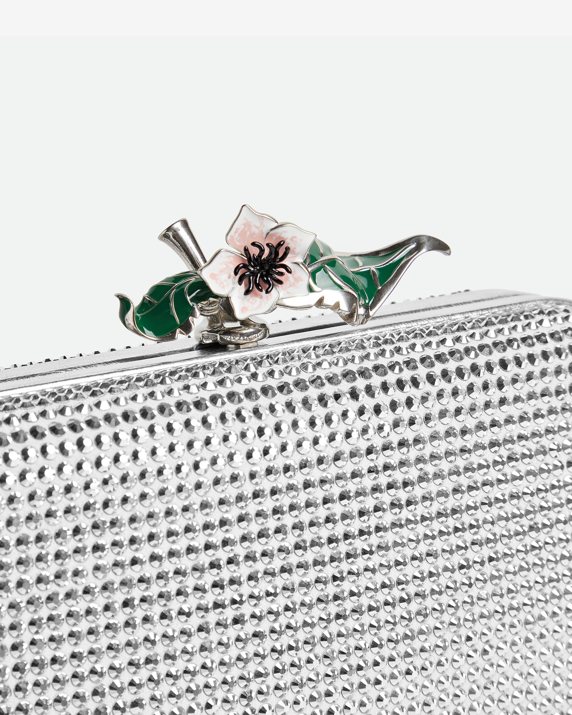 Minaudière clutch in supple leather with all-over crystal detailing and enamelled flower closure.