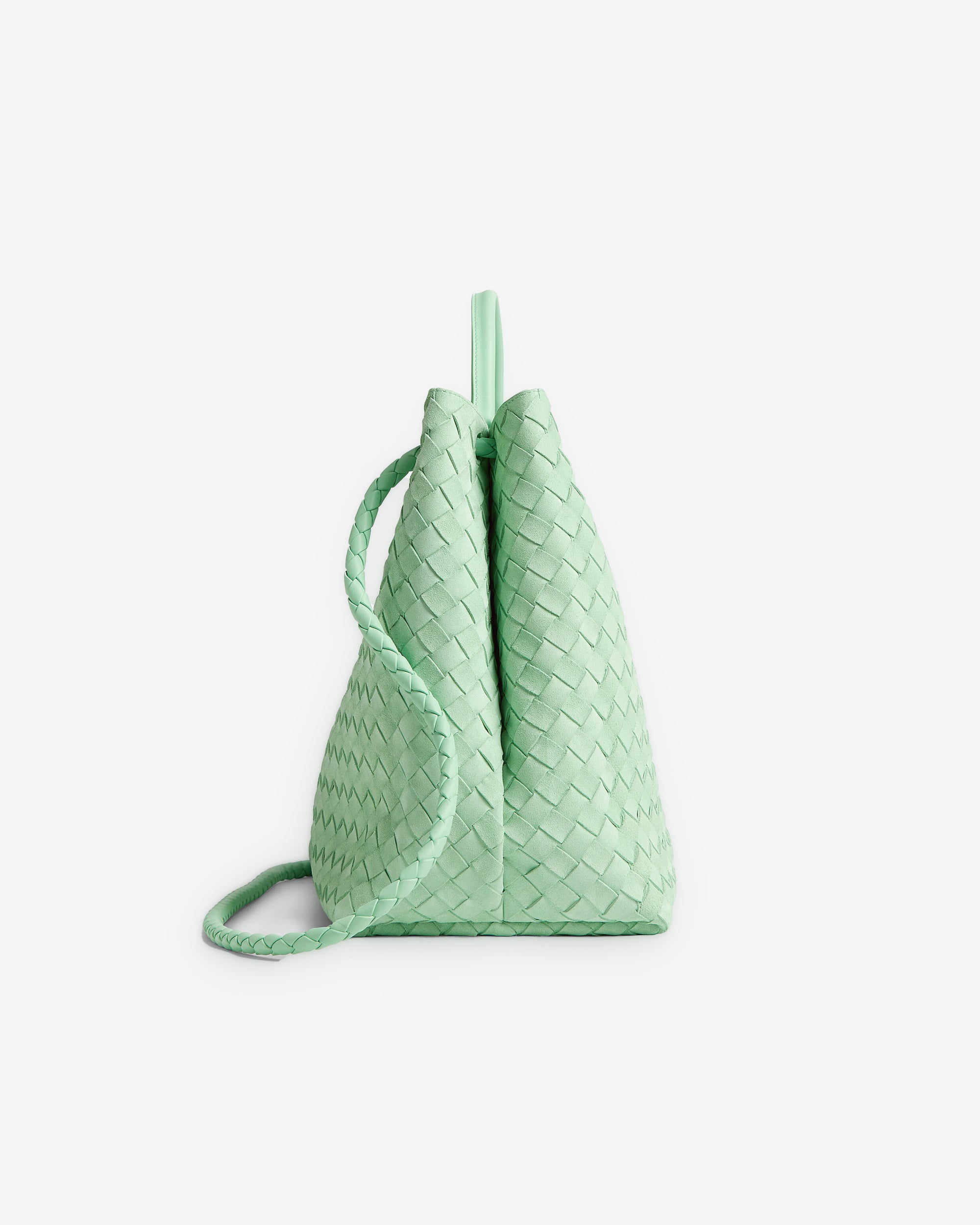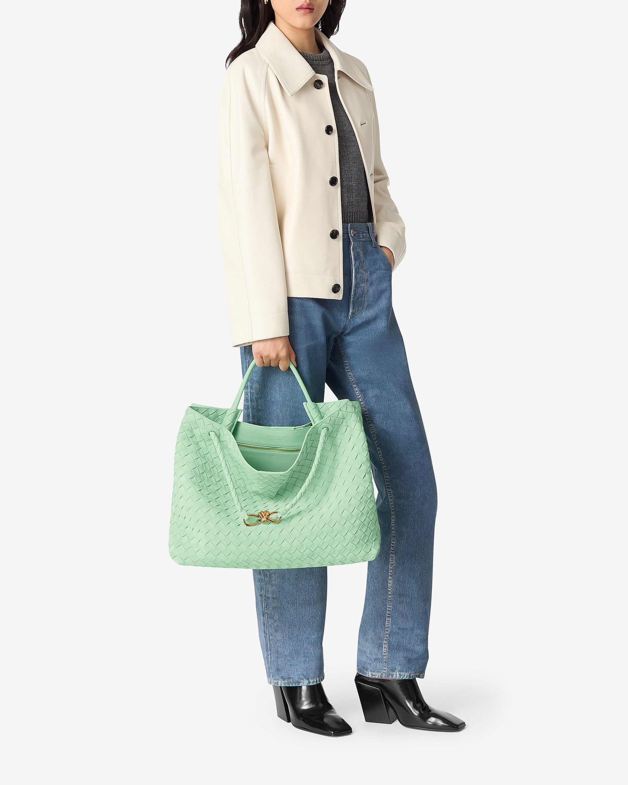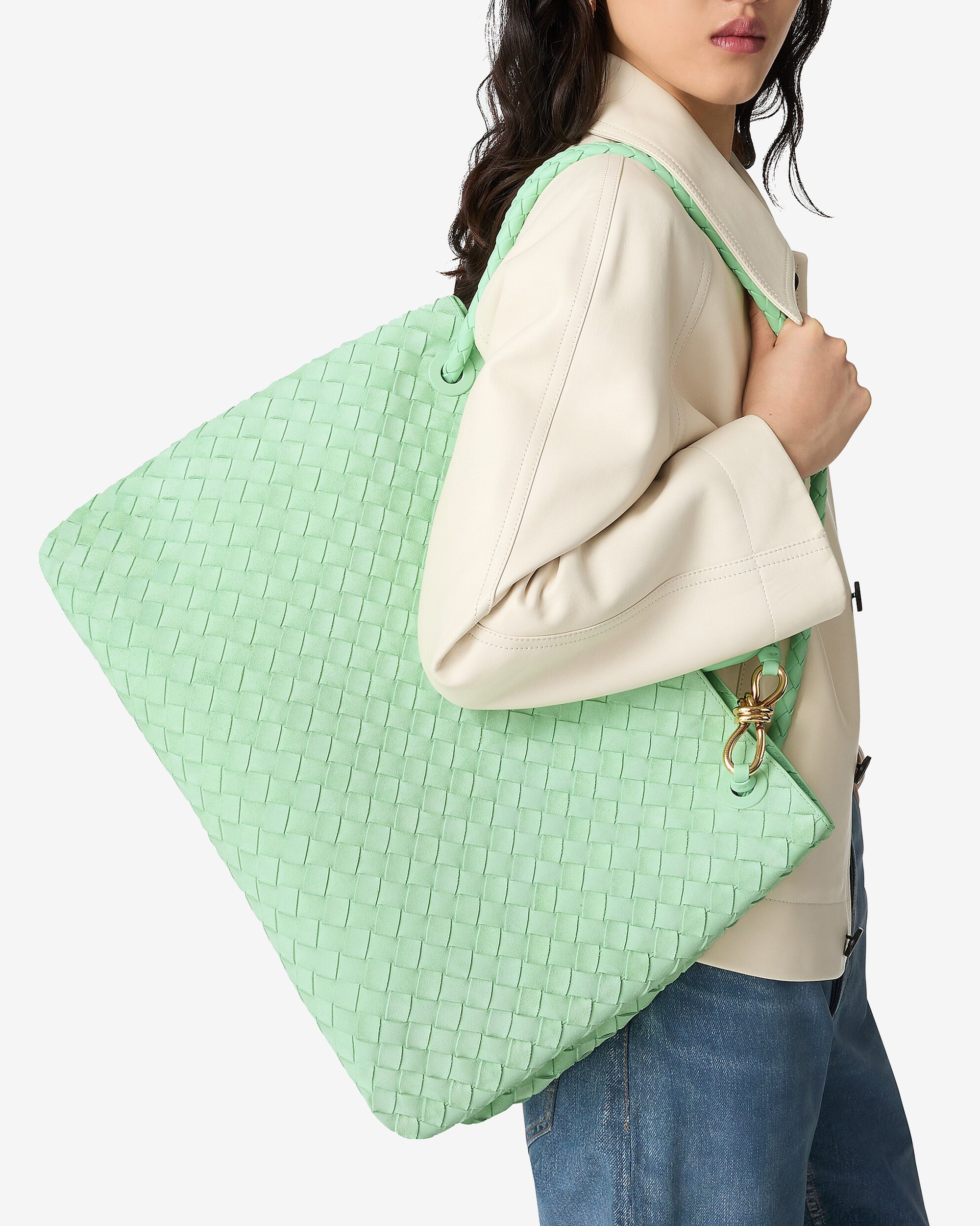 Top handle bag in Intrecciato suede with signature knot detail and sliding cross-body strap.