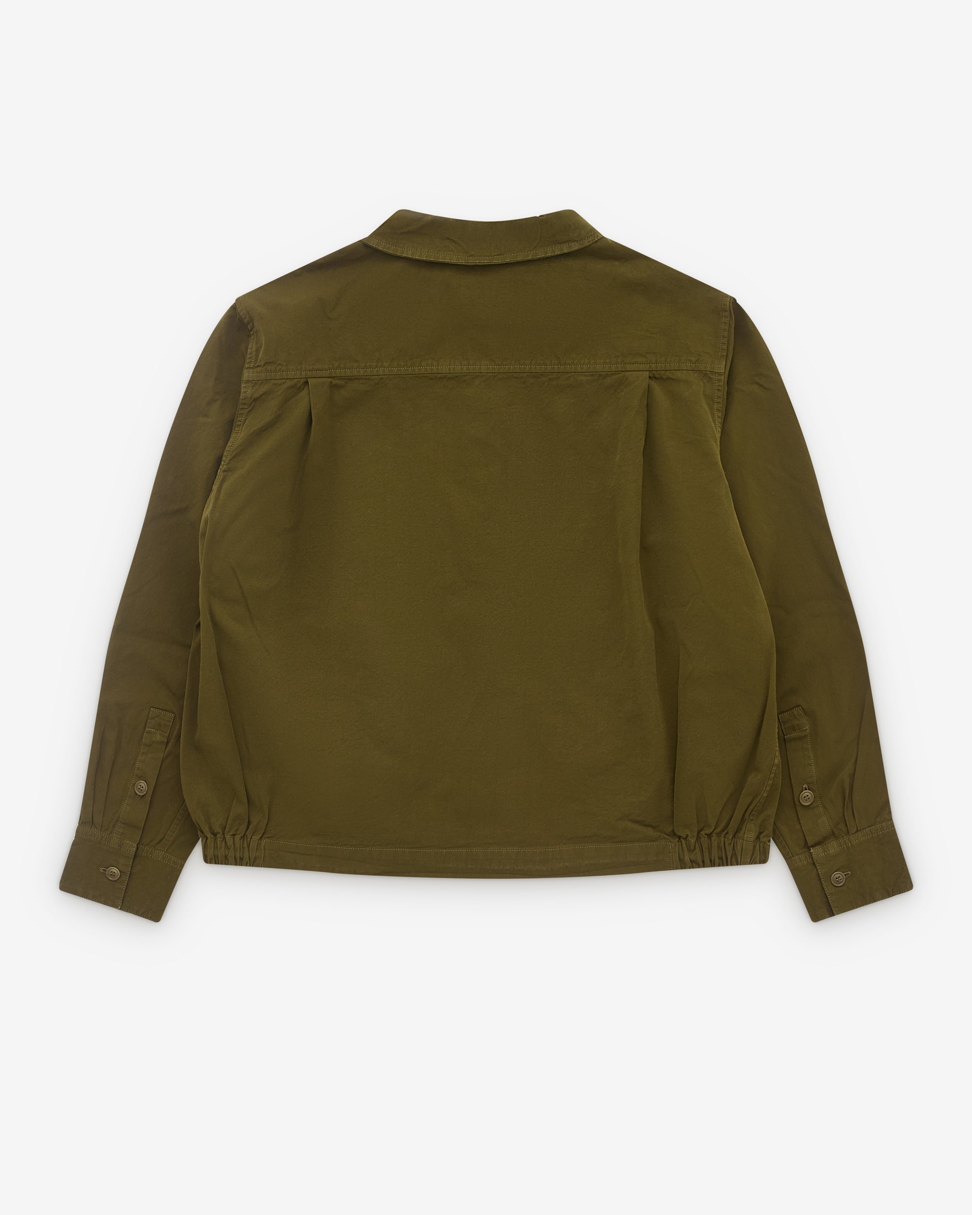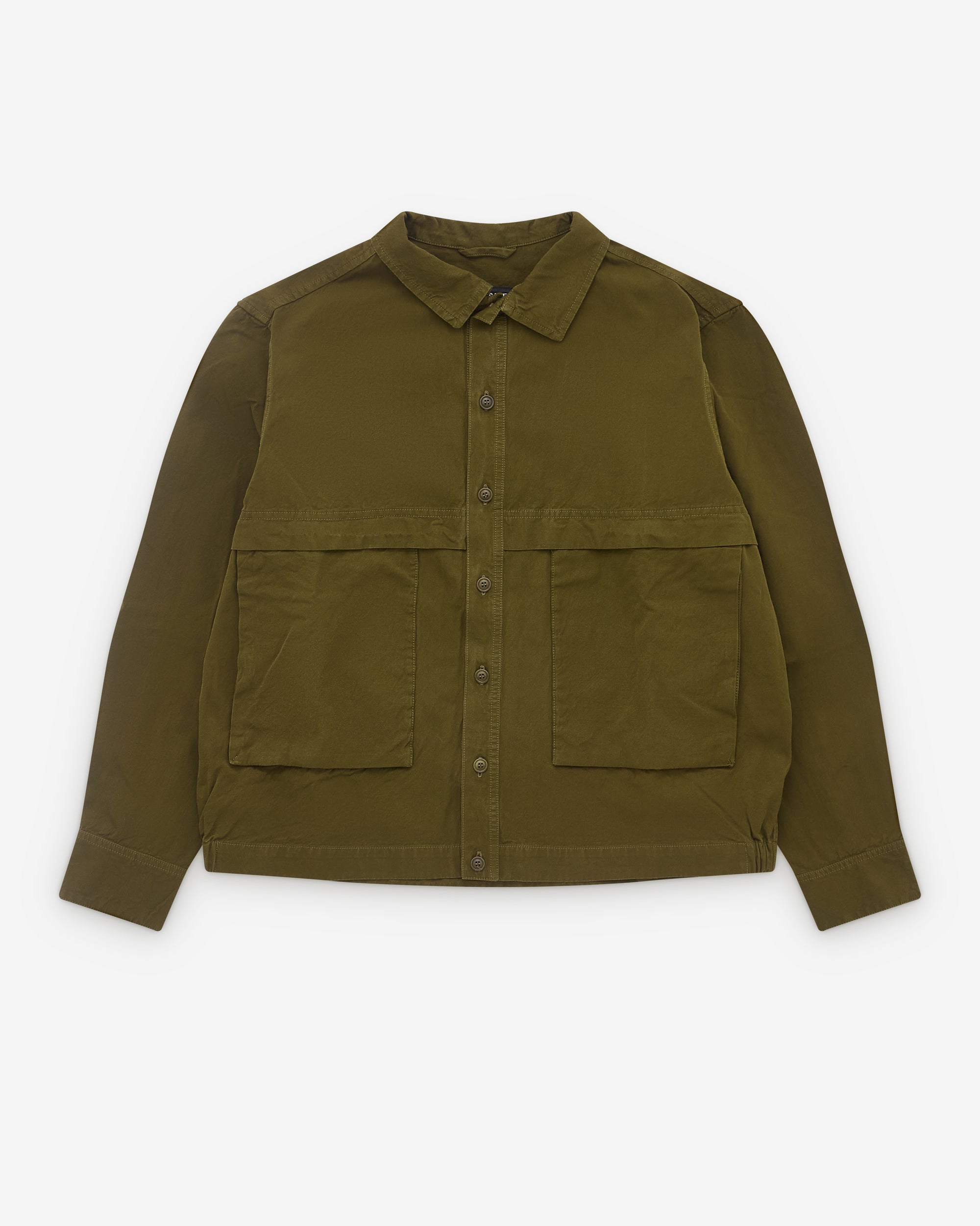 Point collarButton fasteningLarge patch pocketsElasticated waistRear double box pleat