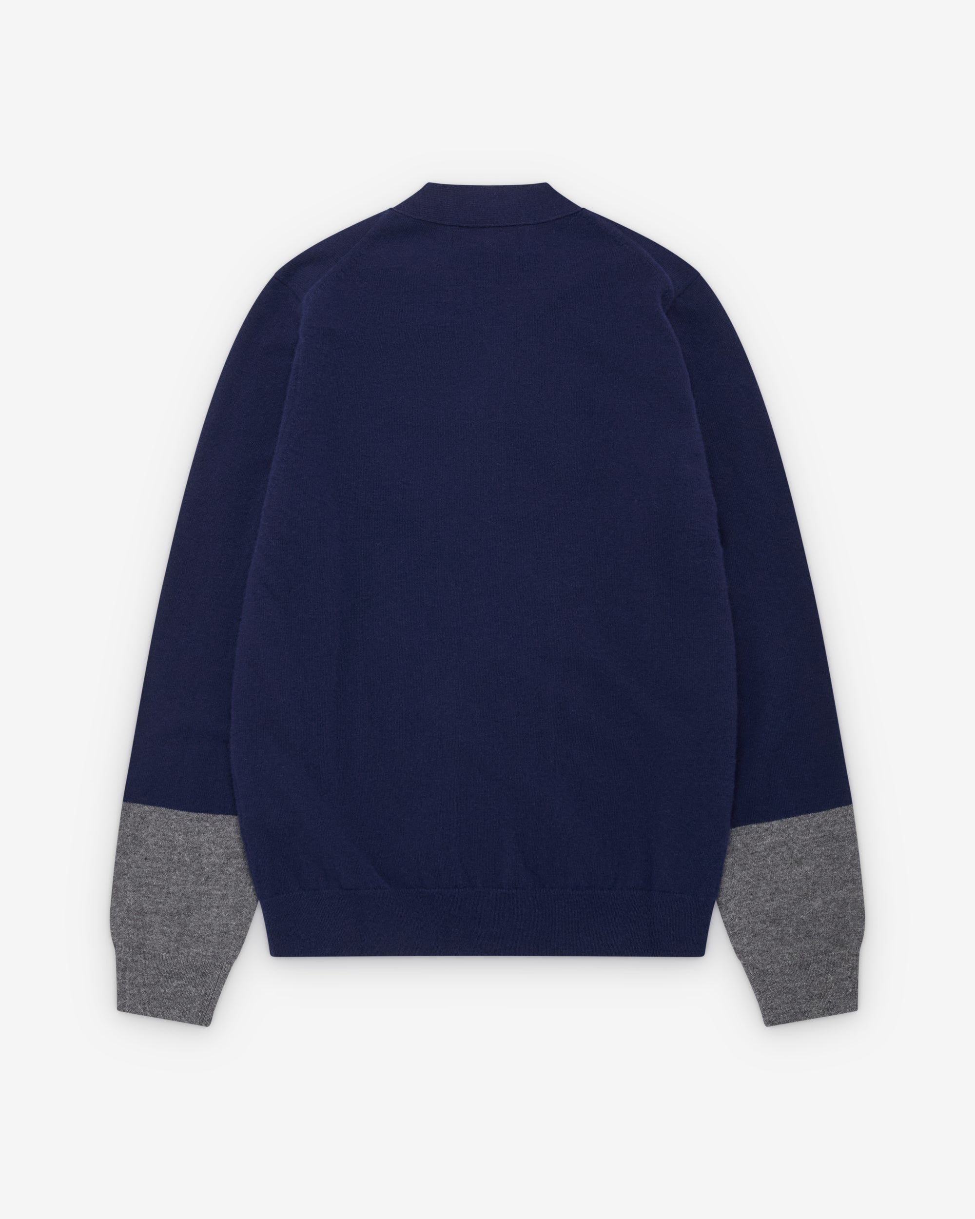V-neckButtoned centre frontRibbed collar, button placket, cuffs, hemContrast lower sleeves100% Lambs WoolMade in China