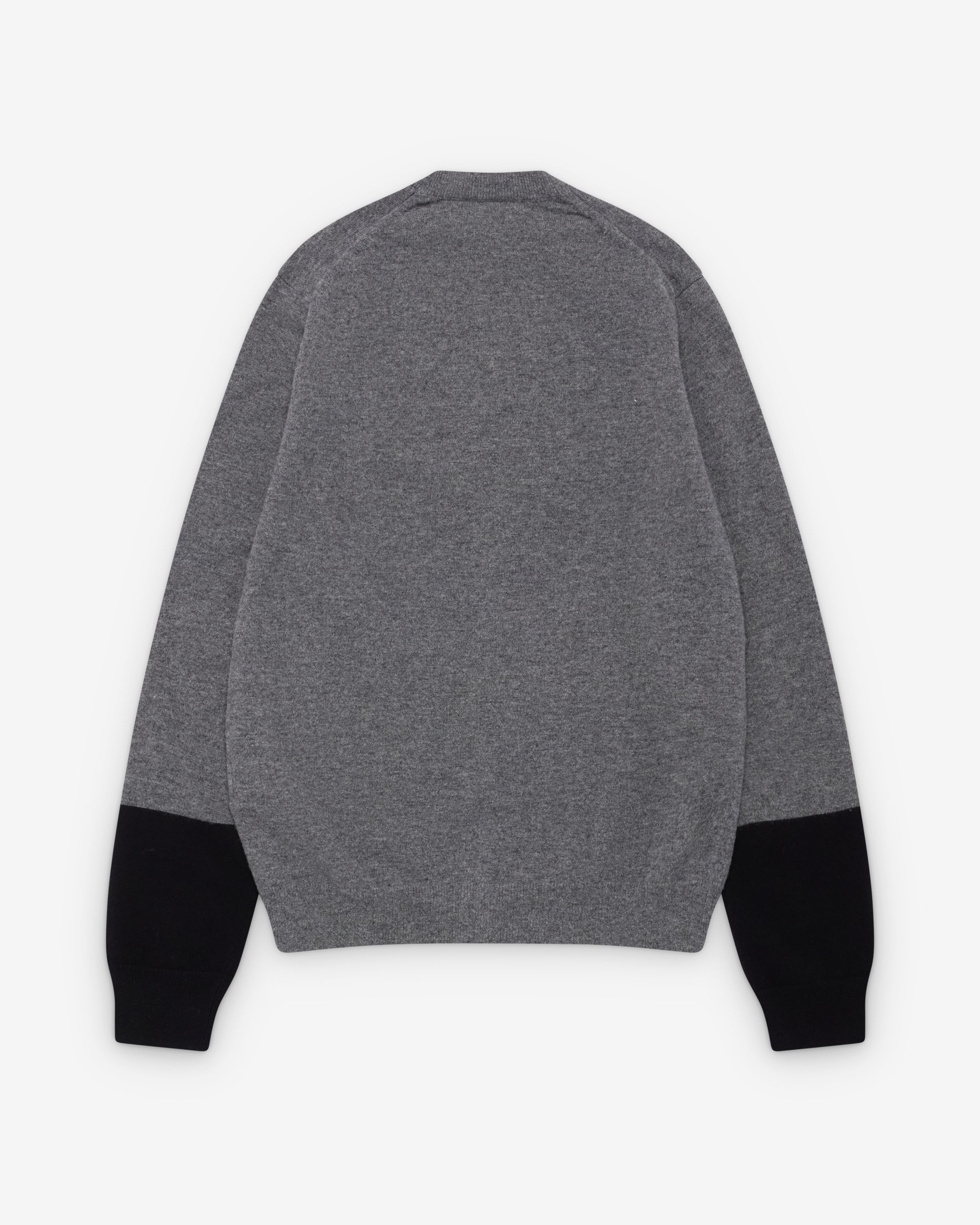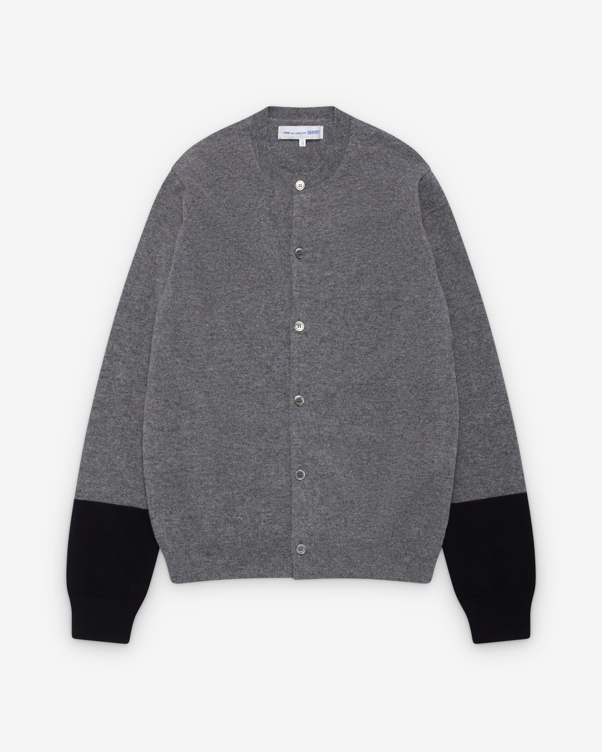 Comme des Garçons SHIRT Forever fully fashioned knit cardigan with a round neck, buttoned front, and contrast coloured lower sleeves. Round neckButtoned centre frontRibbed collar, cuffs, hemContrast lower sleeves100% Lambs WoolMade in China