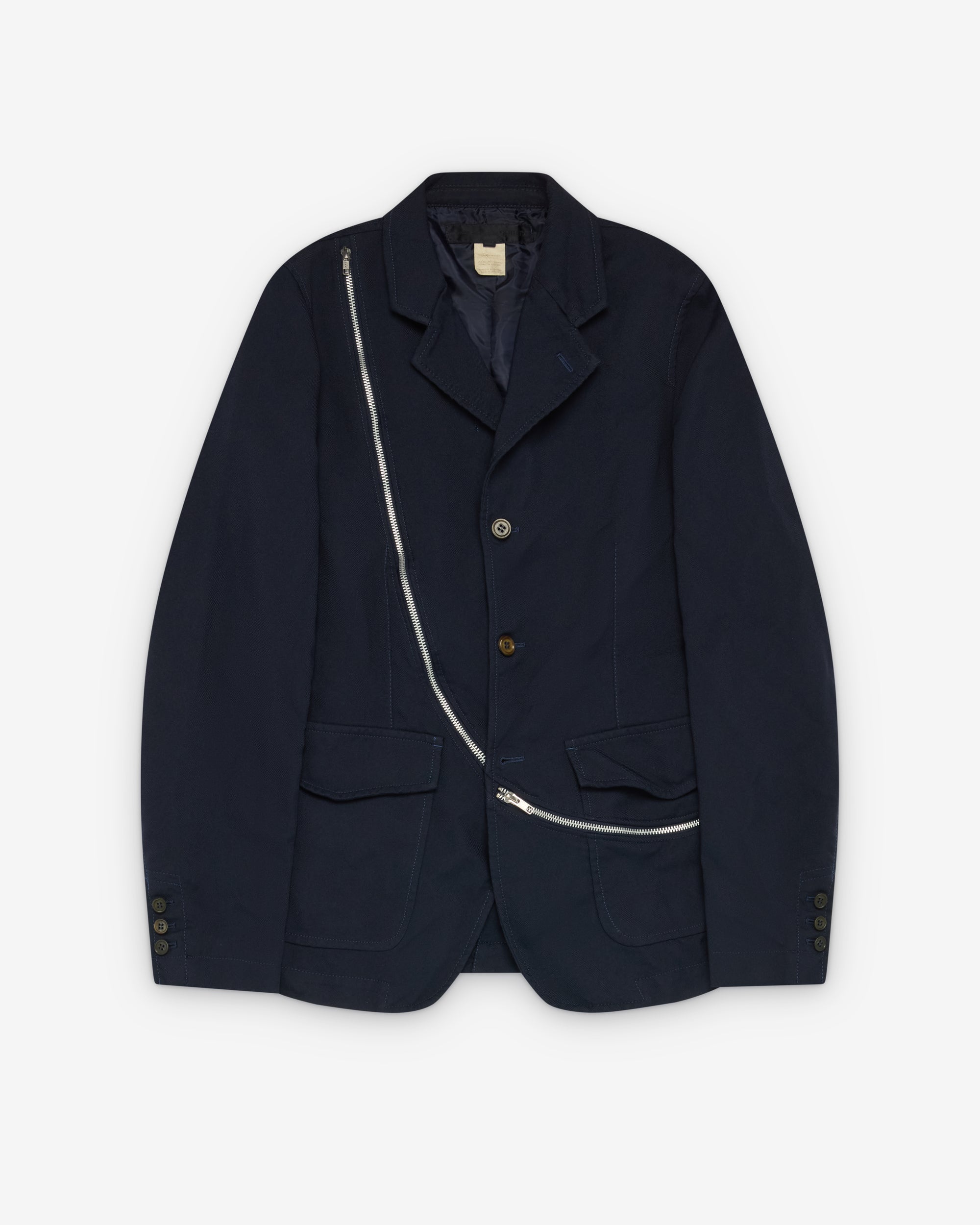 Single breasted blazerFront three button closureAdjustable zippers Two front flap close pocketsPartial internal liningSplit rear ventNotched lapel collar