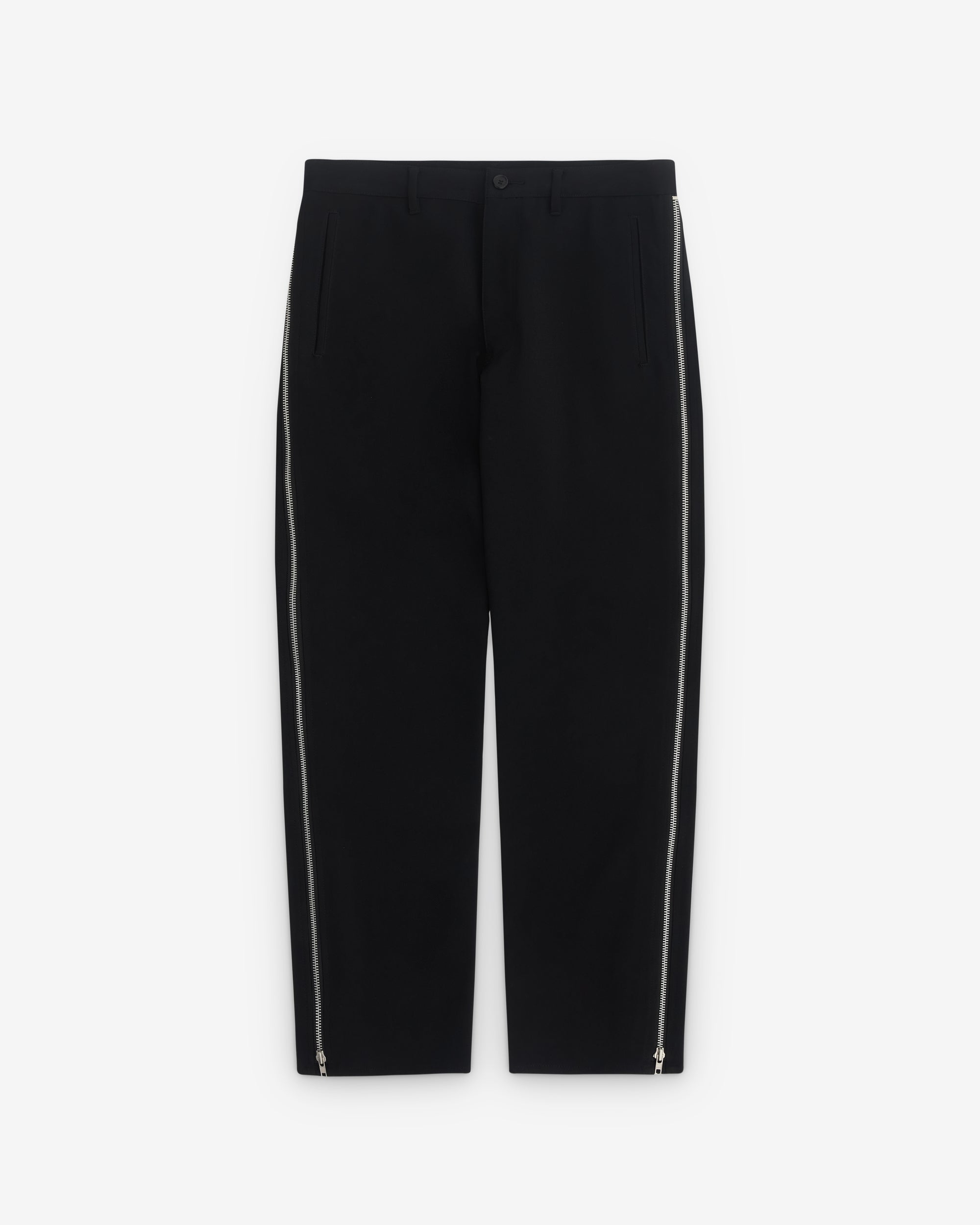 Button waist, zip flyFront slash pocketsAdjustable zippers at side legStraight cutTwo rear pockets