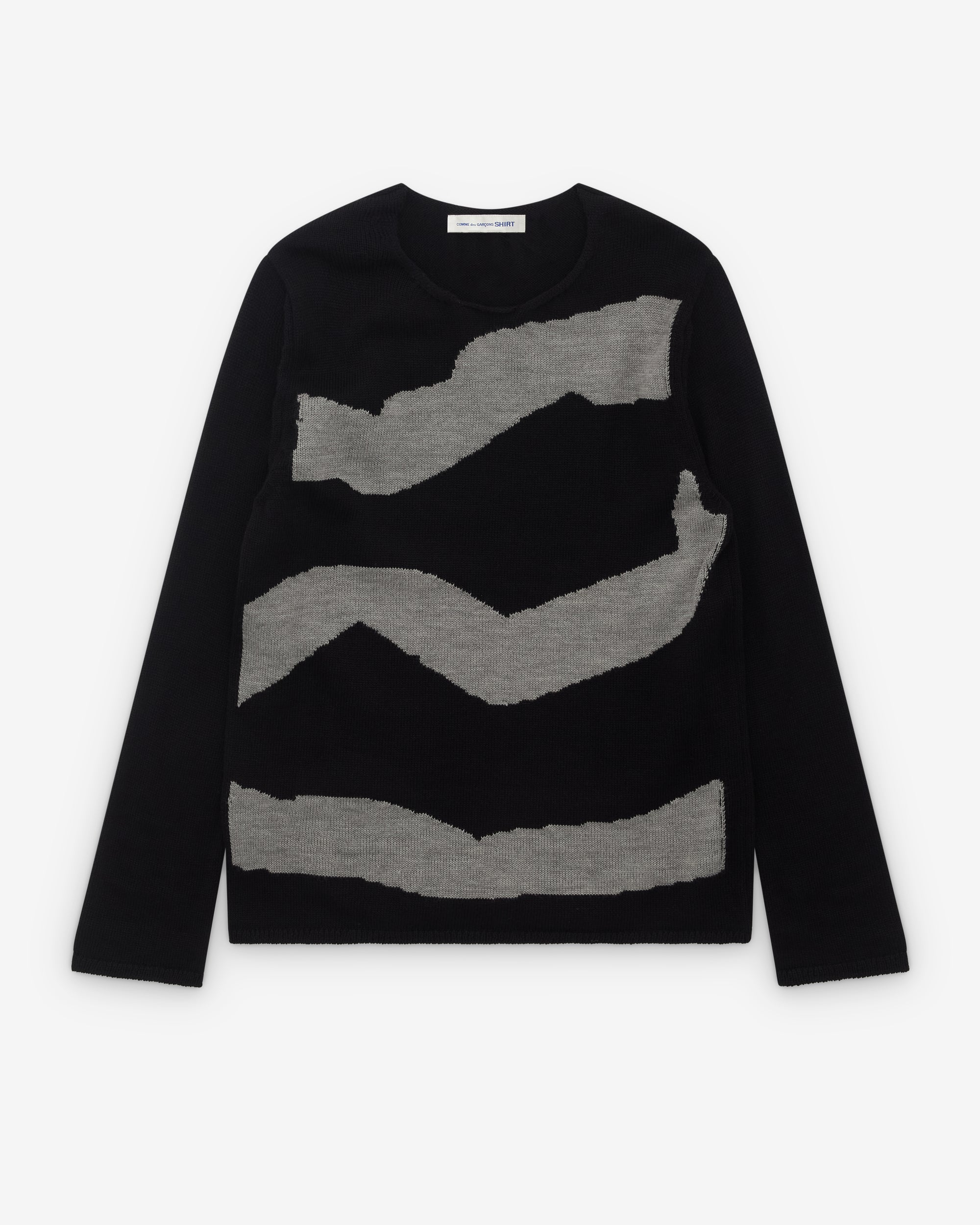 Raw hem rounded necklineFront intarsia knit designLong sleevesStraight hemRegular fitRib knit waistband and cuffs