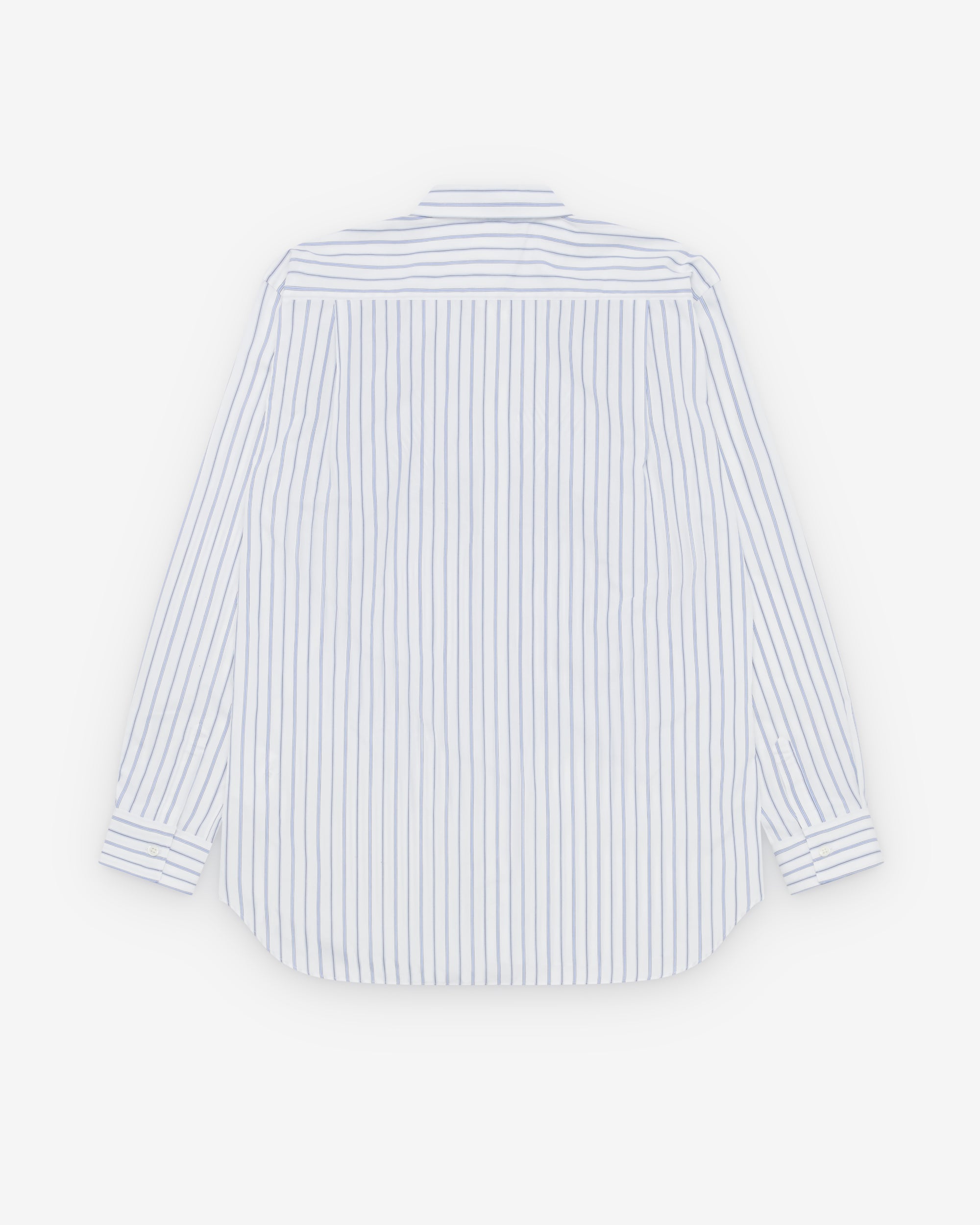 Classic point collarFront mother of pearl button placketShirttail curved hemButton close cuffsGeometric contrast pattern shapes
