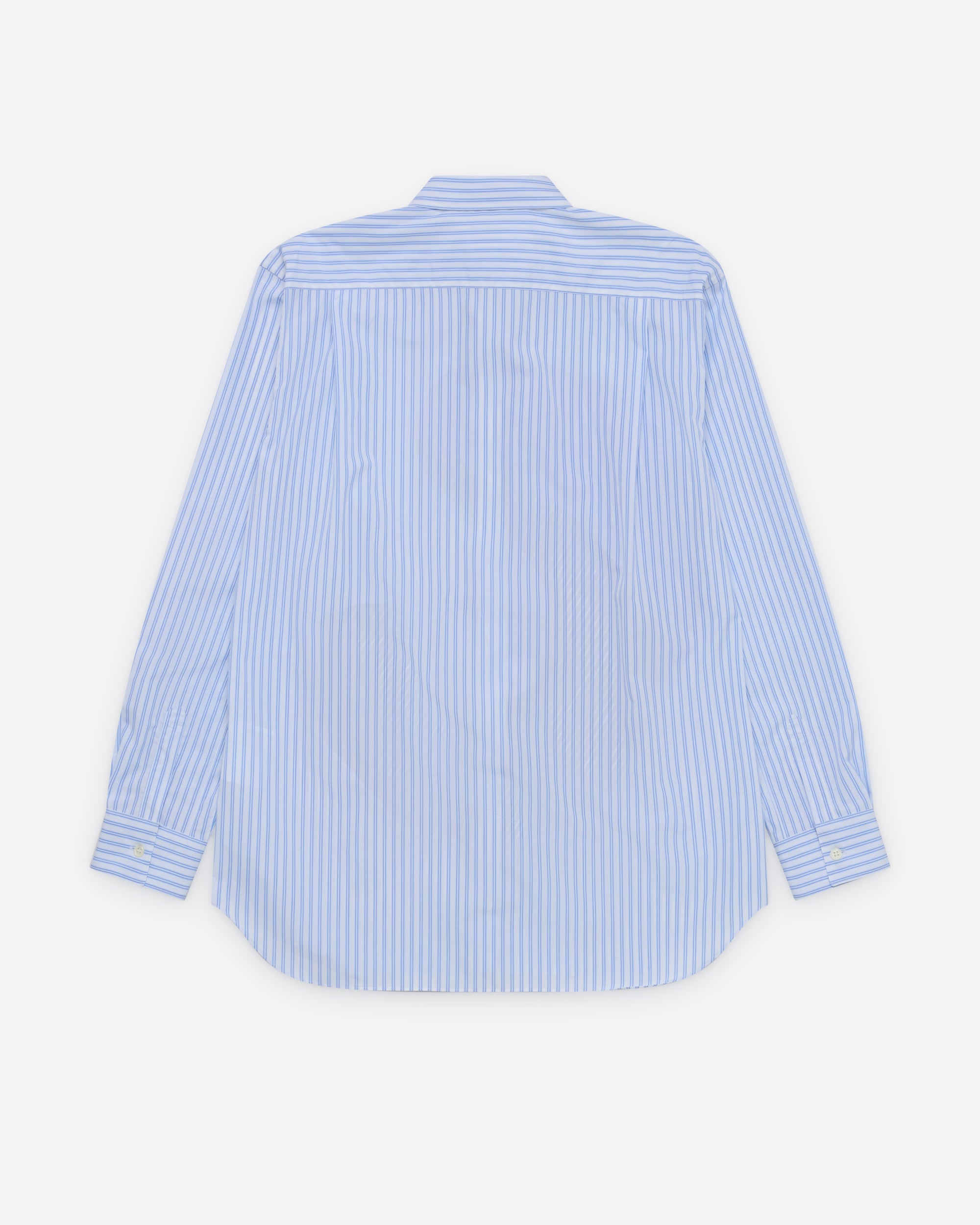 Classic point collarFront mother of pearl button placketShirttail curved hemButton close cuffsContrast stripe geometric pattern