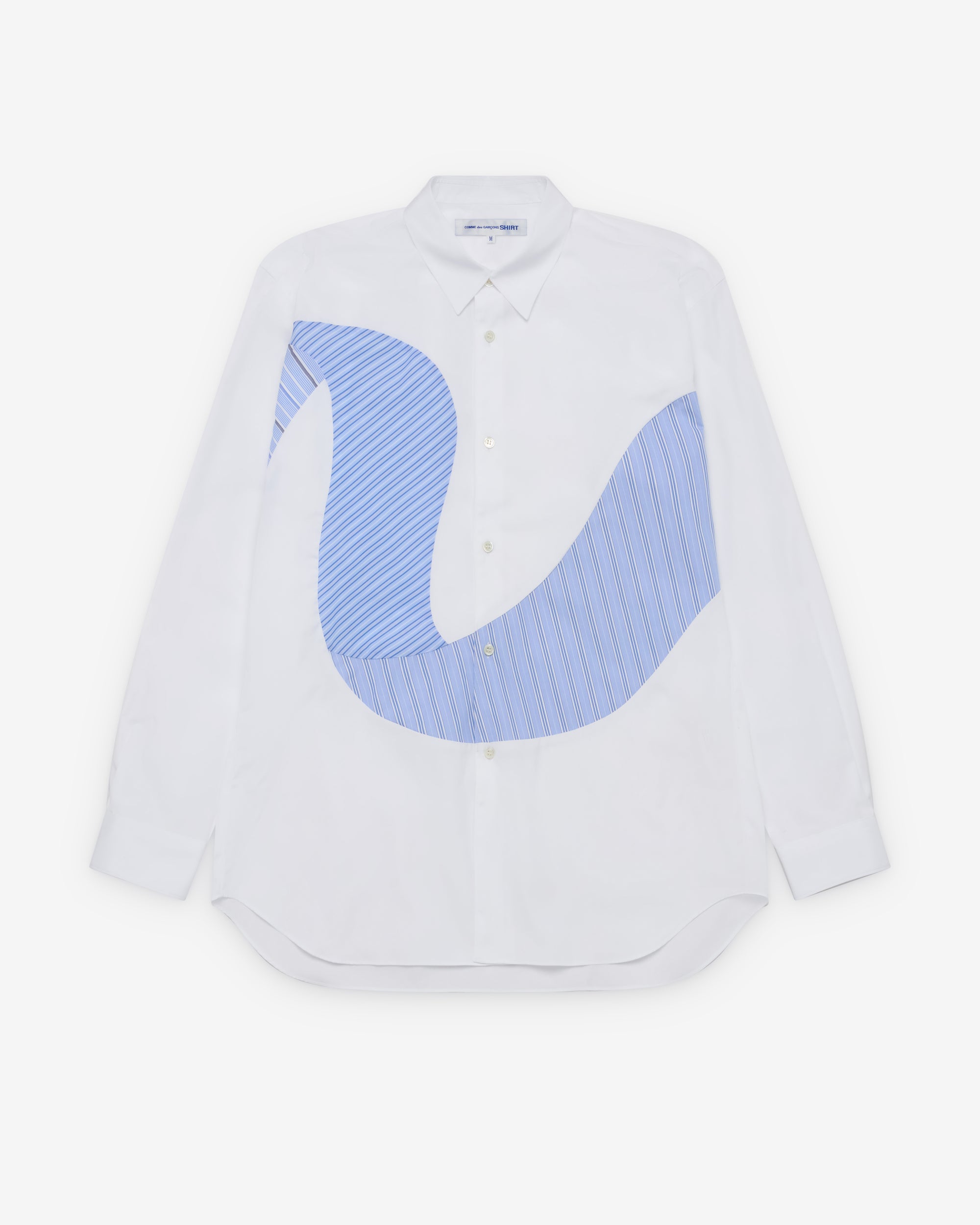 Classic point collarFront mother of pearl button placketShirttail curved hemButton close cuffsContrast stripe wave panels