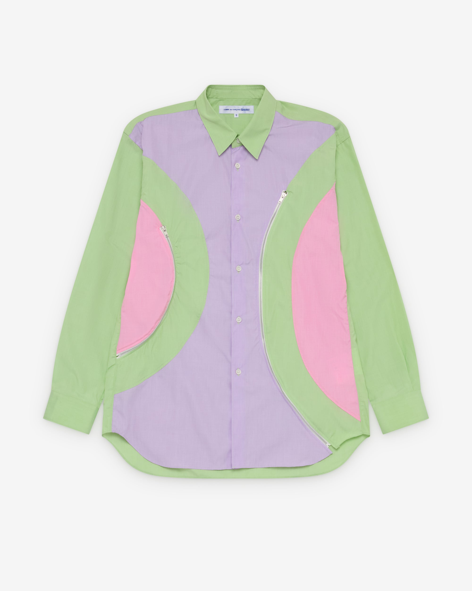 Classic point collarFront mother of pearl button placketShirttail curved hemAdjustable zippers at frontButton close cuffsContrast curved pattern panels