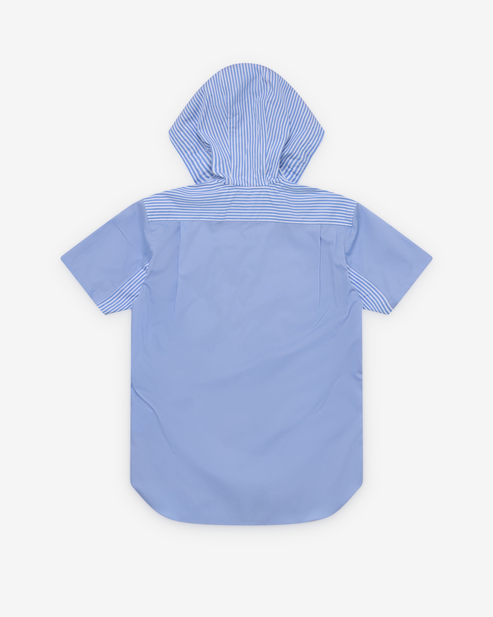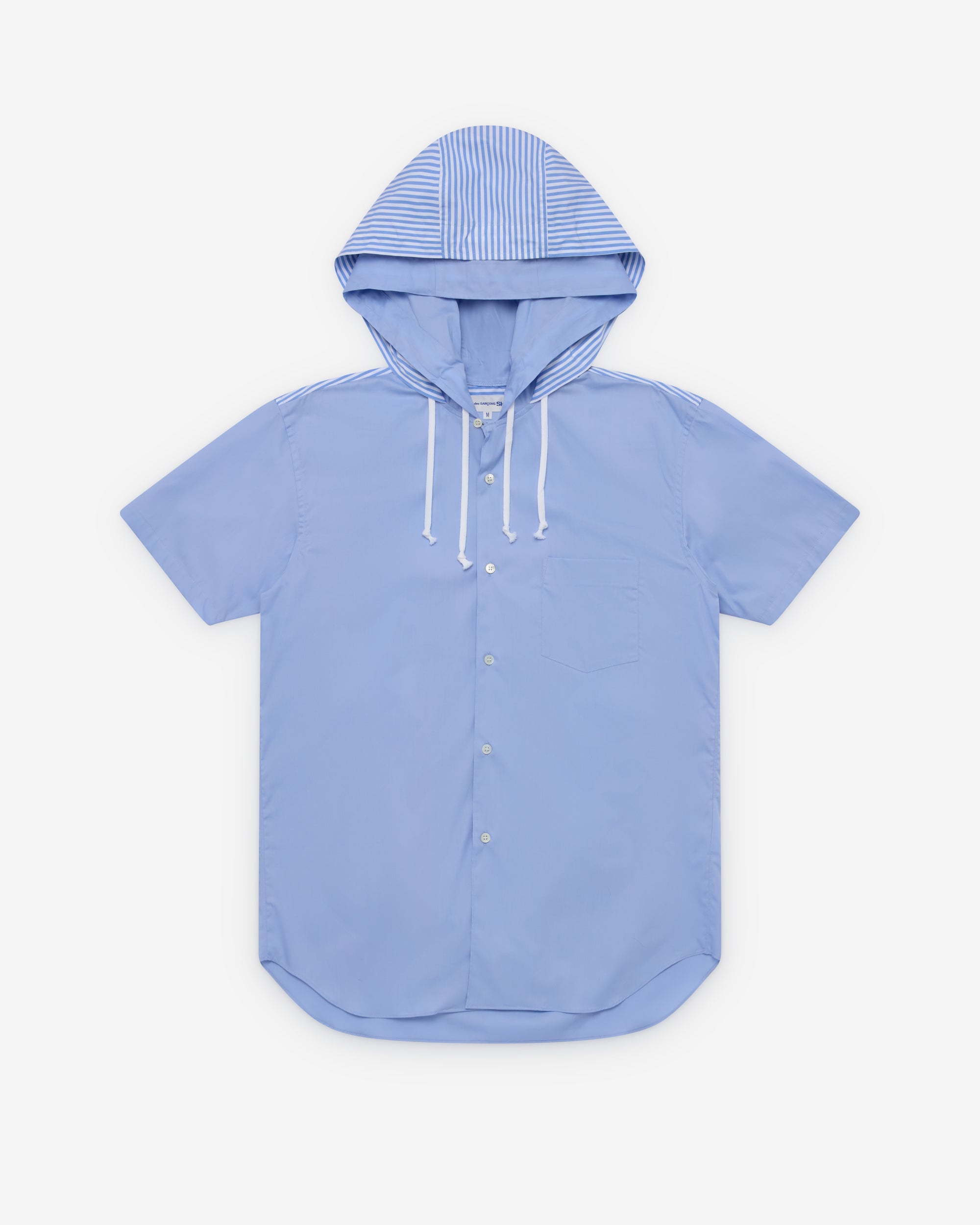 Hooded collarDual drawstringsShort sleevesFront button closureCurved shirttail hemChest pocket