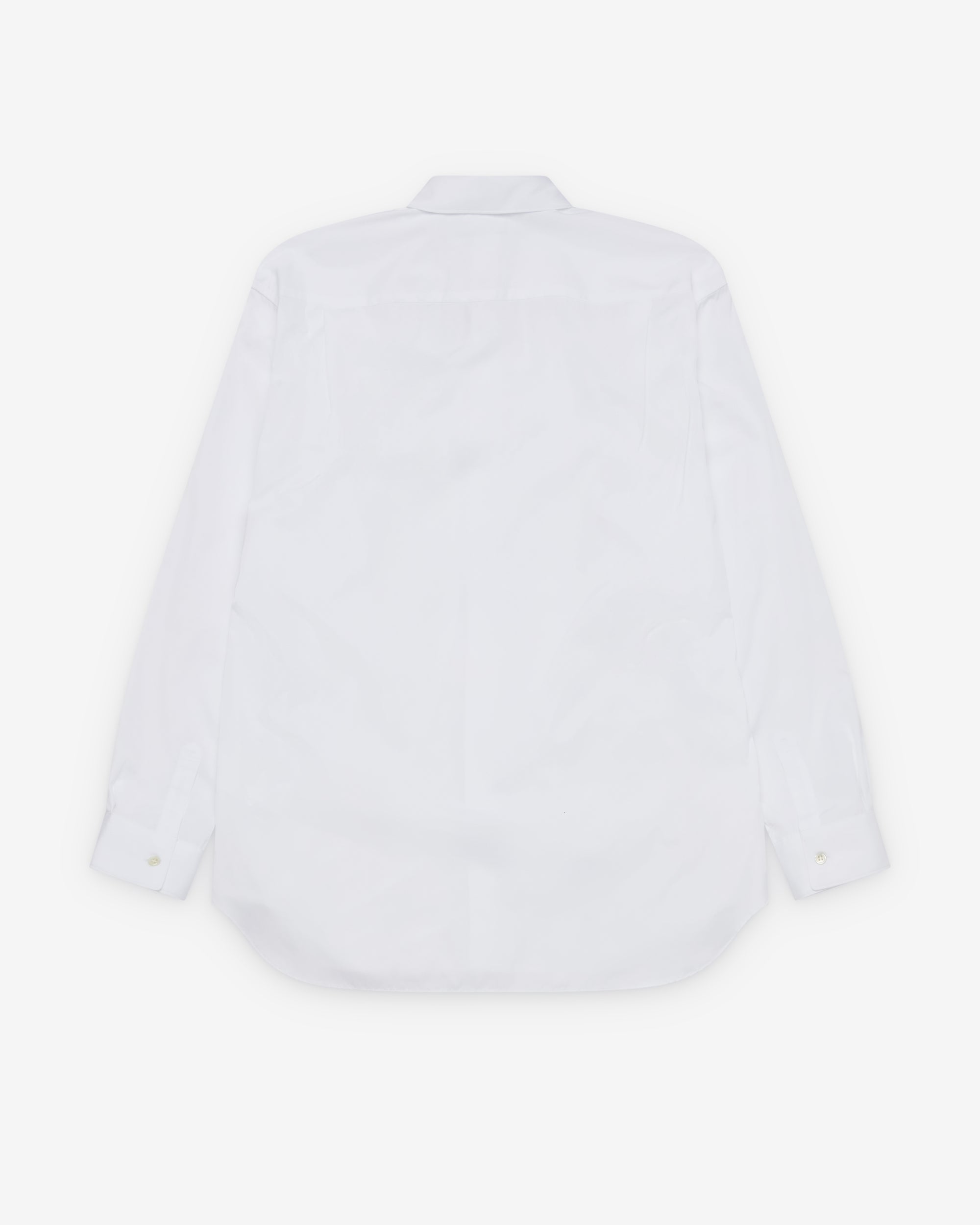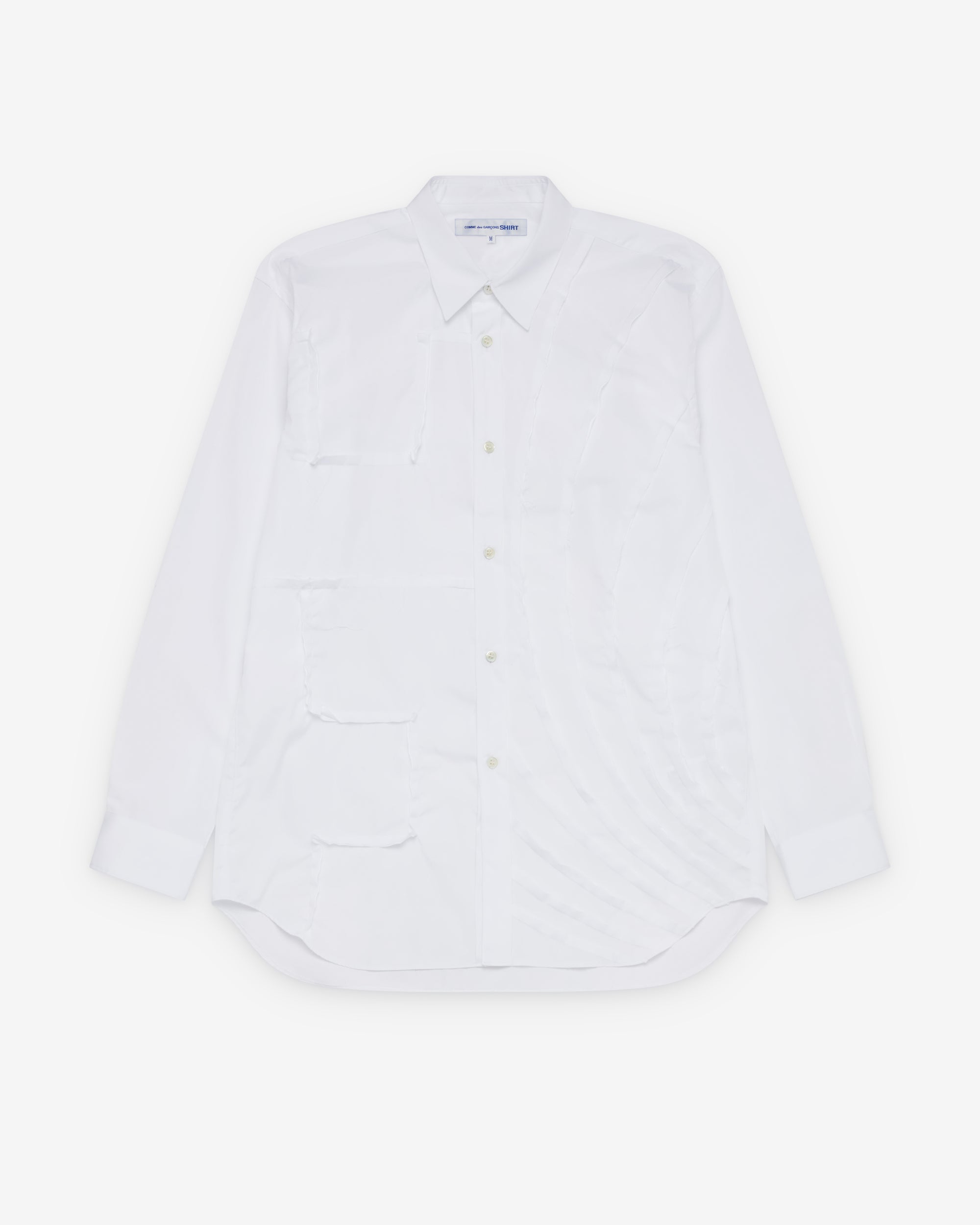 Classic point collarPanelled geometric overlaysFront mother of pearl button placketShirttail curved hemCotton poplin fabricButton close cuffs