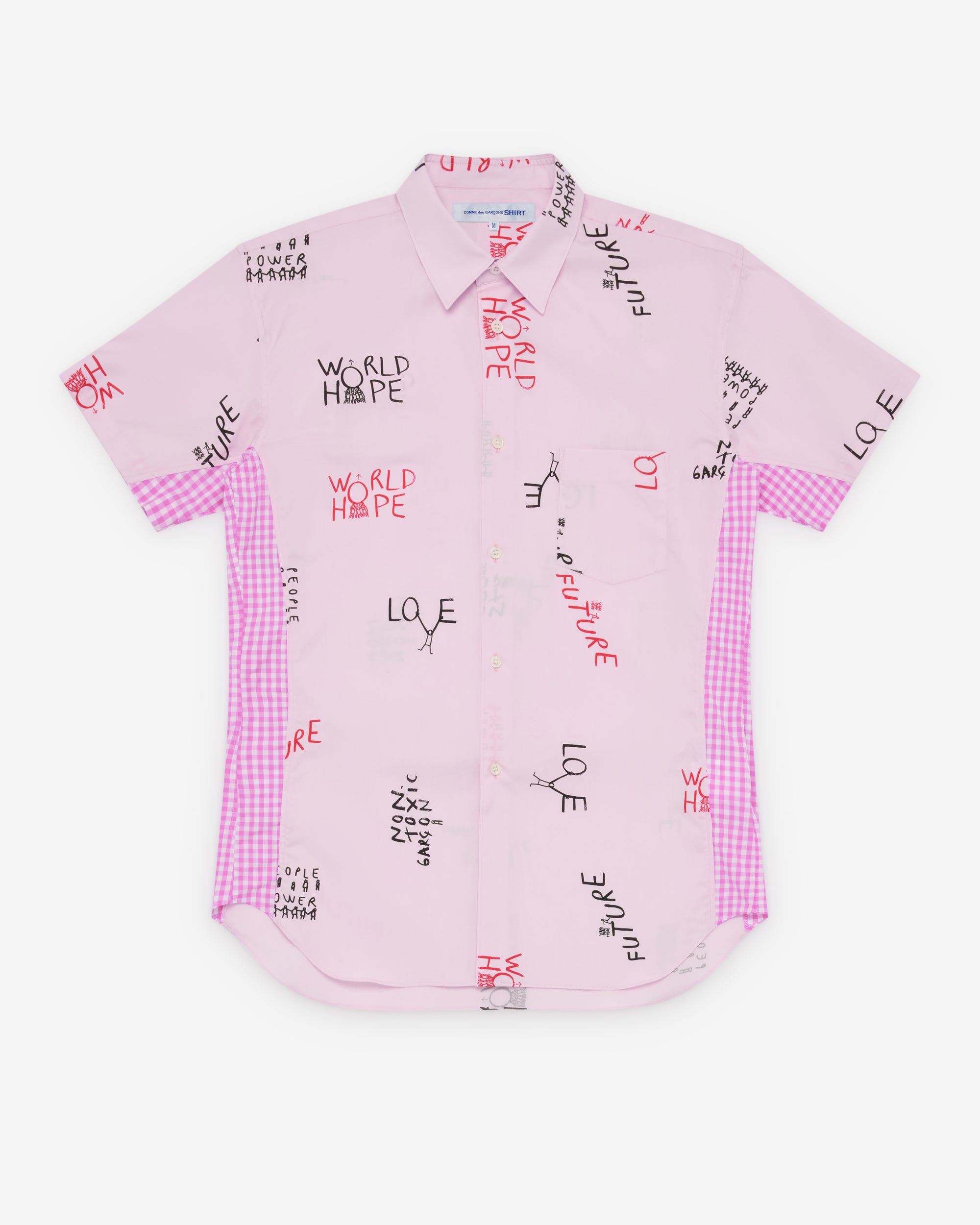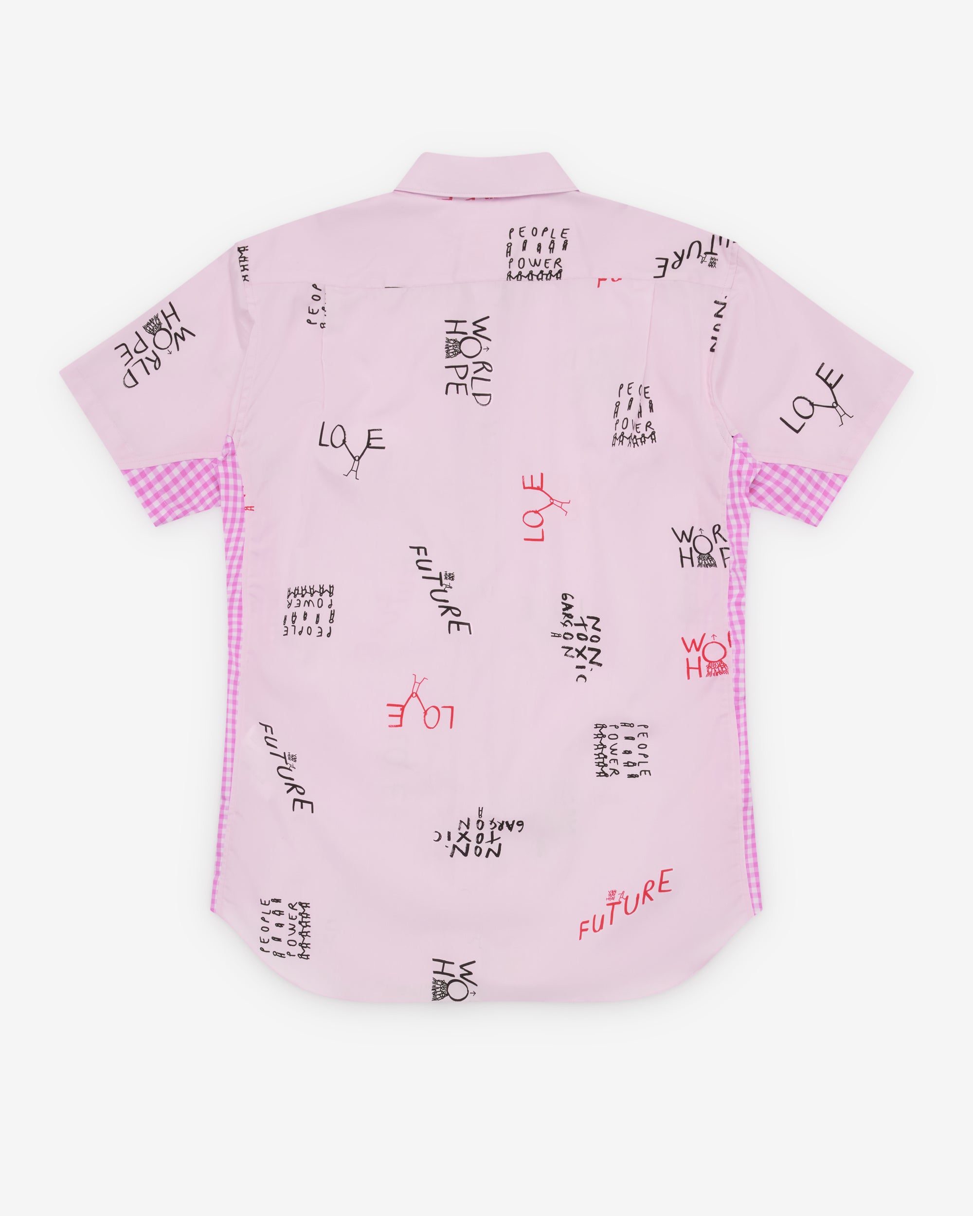 Classic point collarChest pocketSlogan print fabricGingham check side panelsCurved shirttail hem