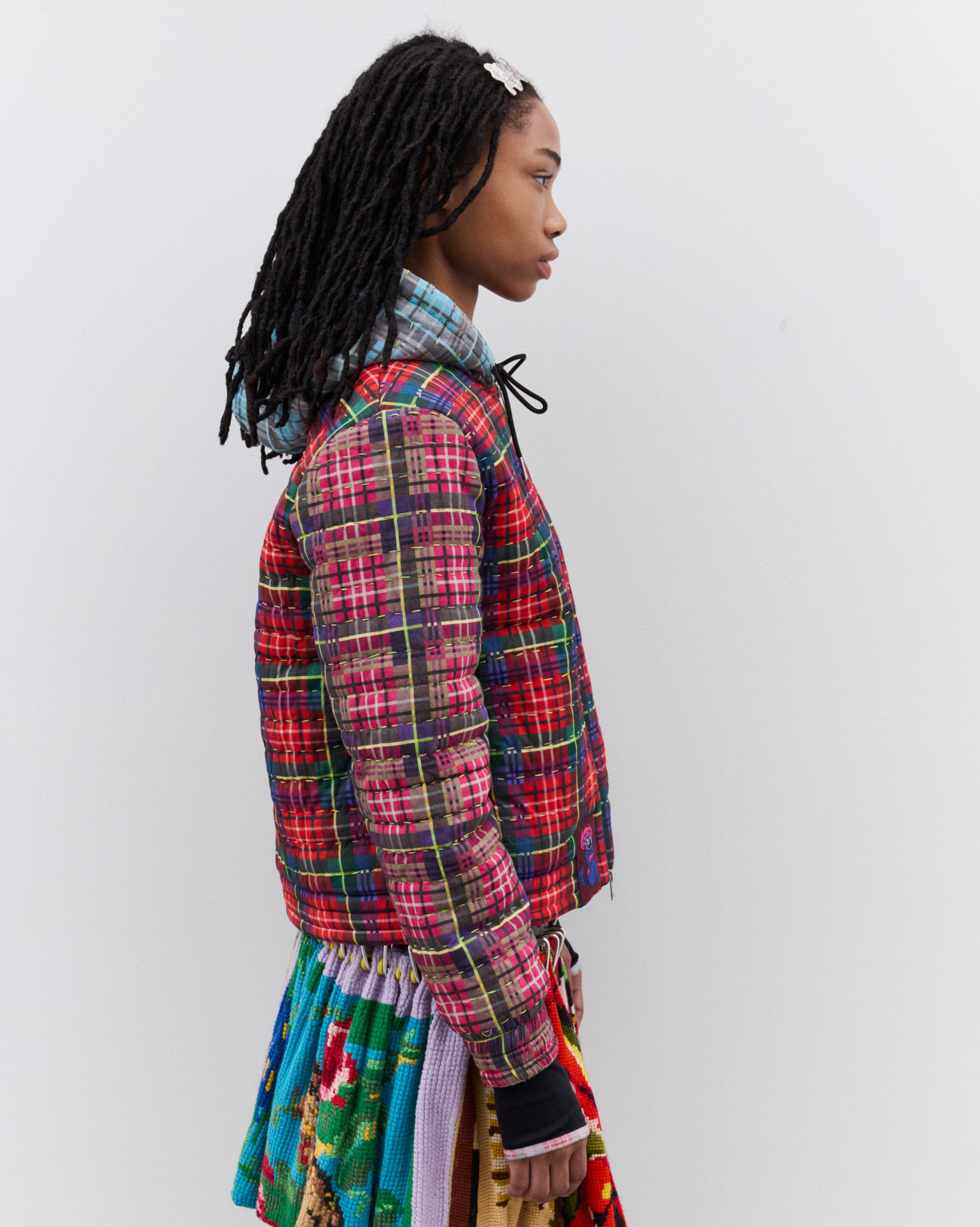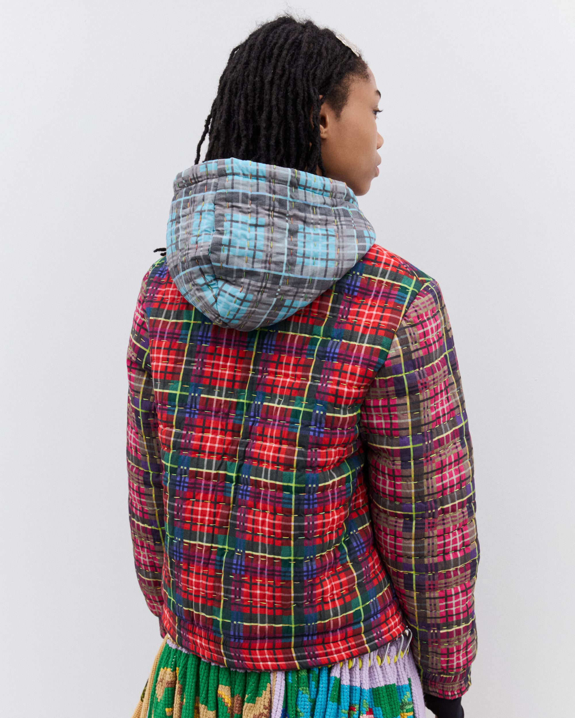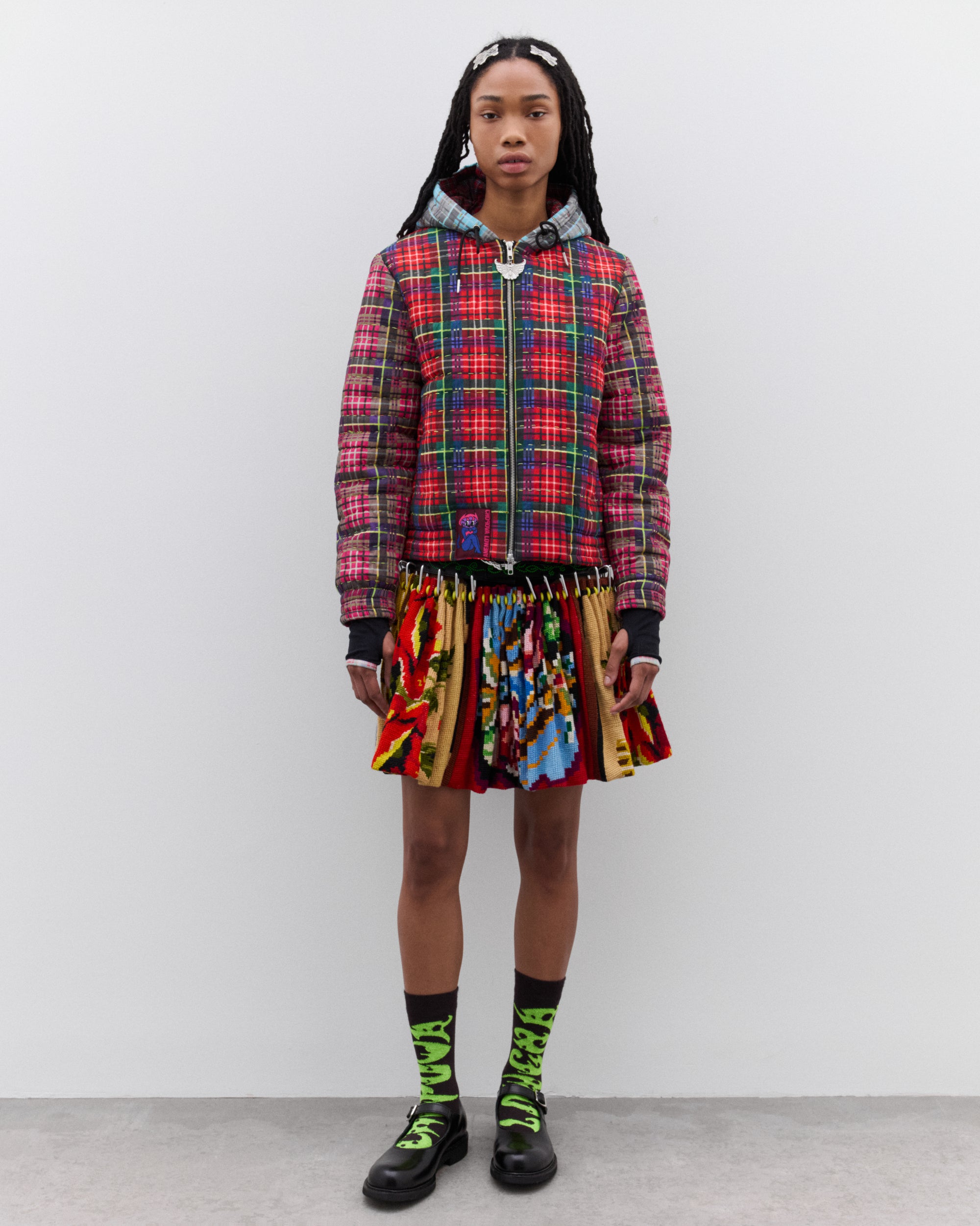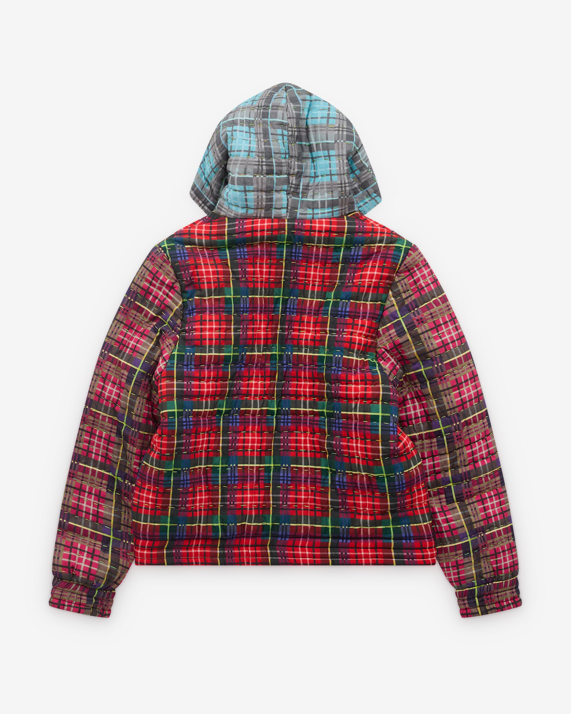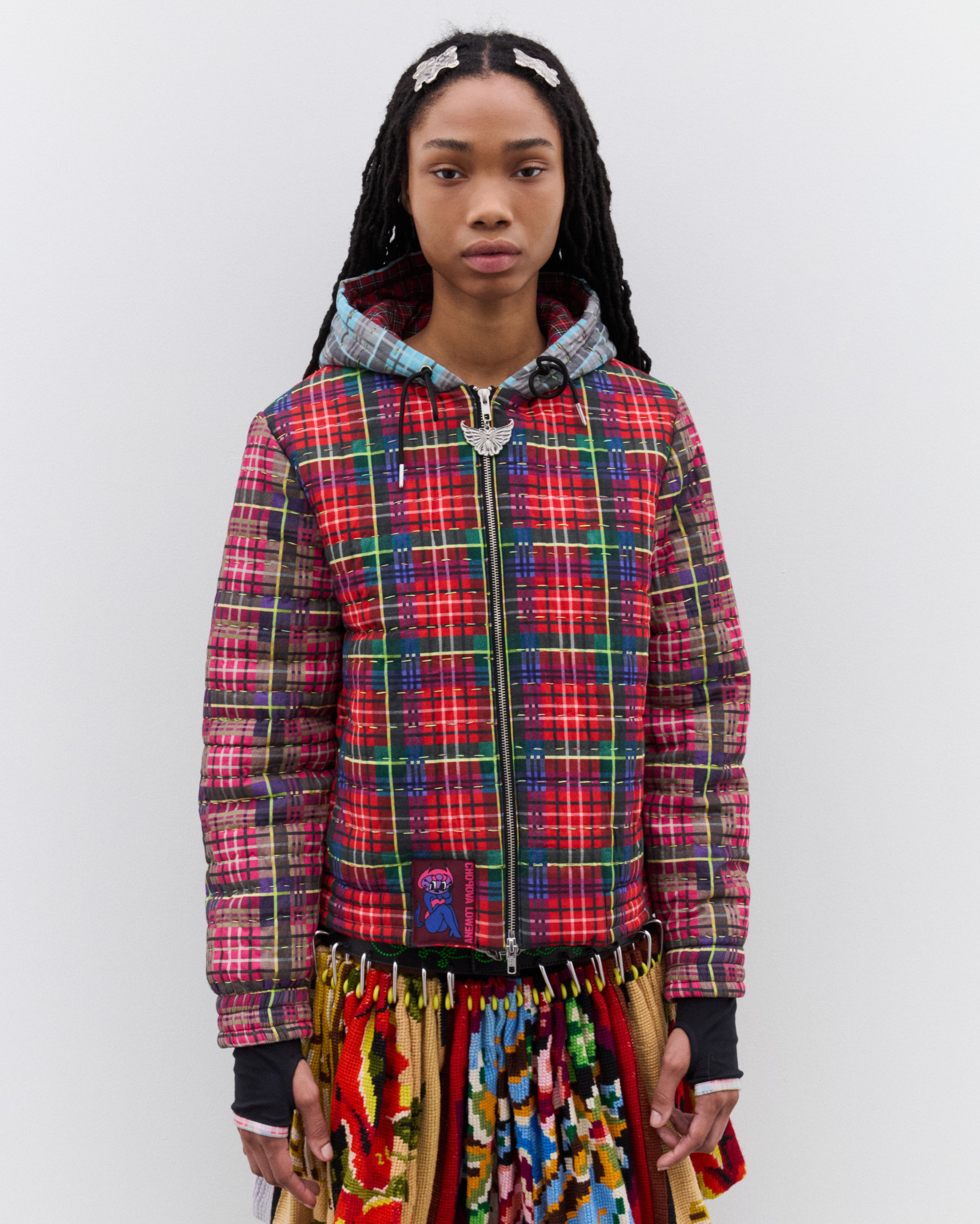 Double faced drawcord hoodContrasting tartanTwo way zip fastening with charm zip pullElasticated cuffsSewn-on logo patch at hem