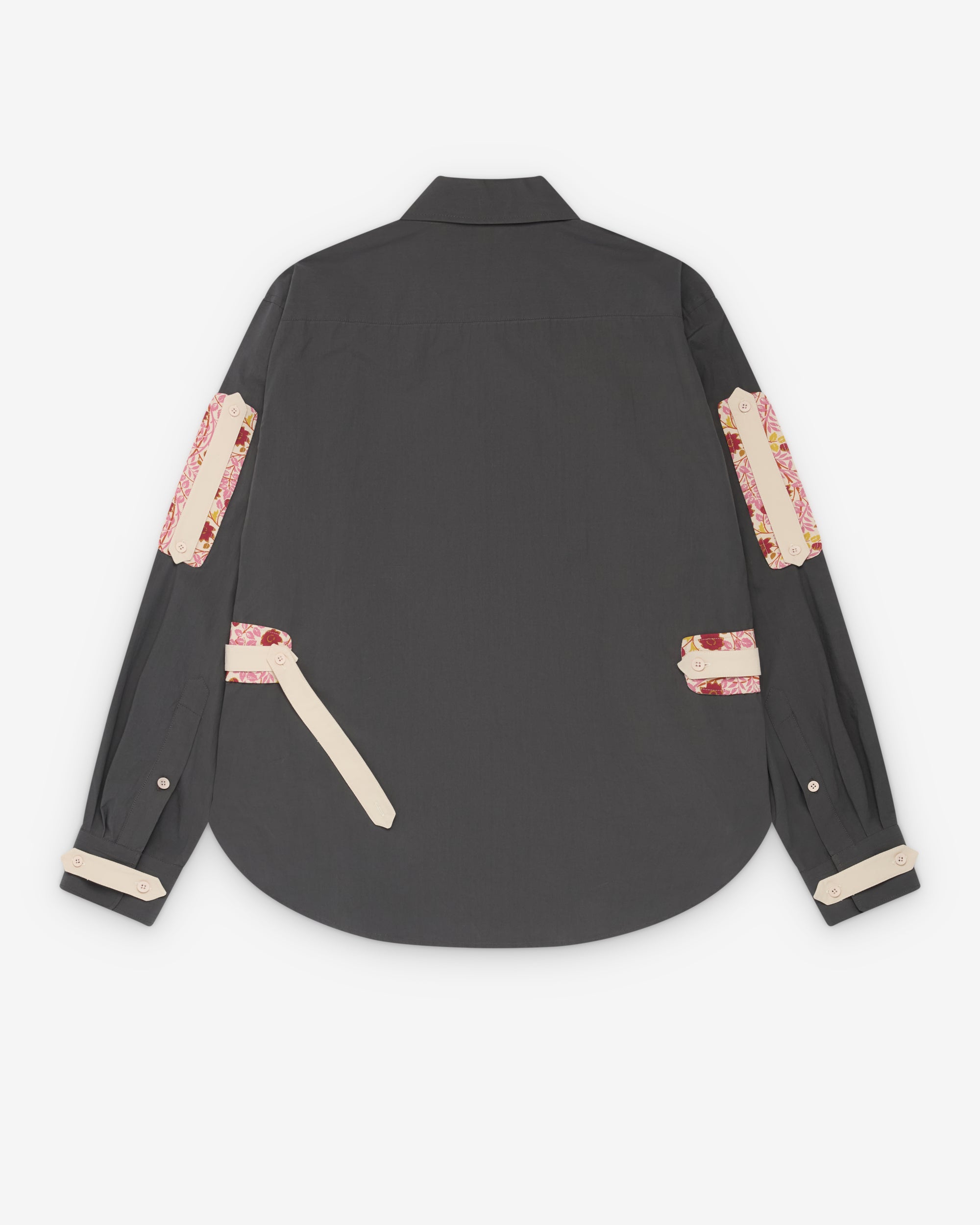 Point collarFront button closureRounded hemButton tab detailsLong sleevesButton cuffs