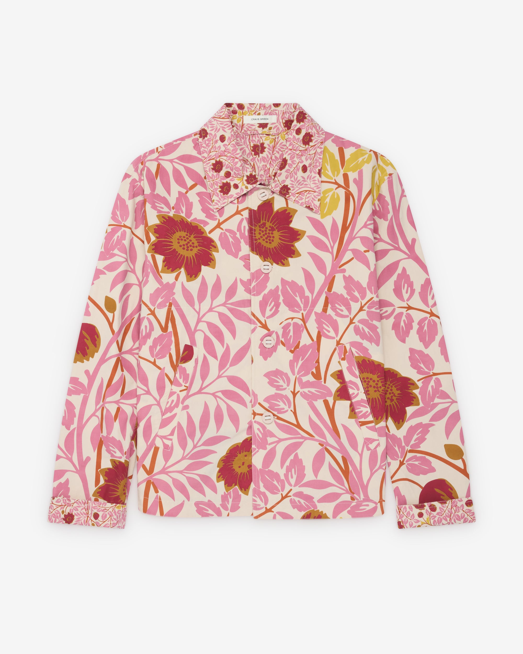 Spread collarAll over print fabric Button front closureFront chest pocketsUnlined