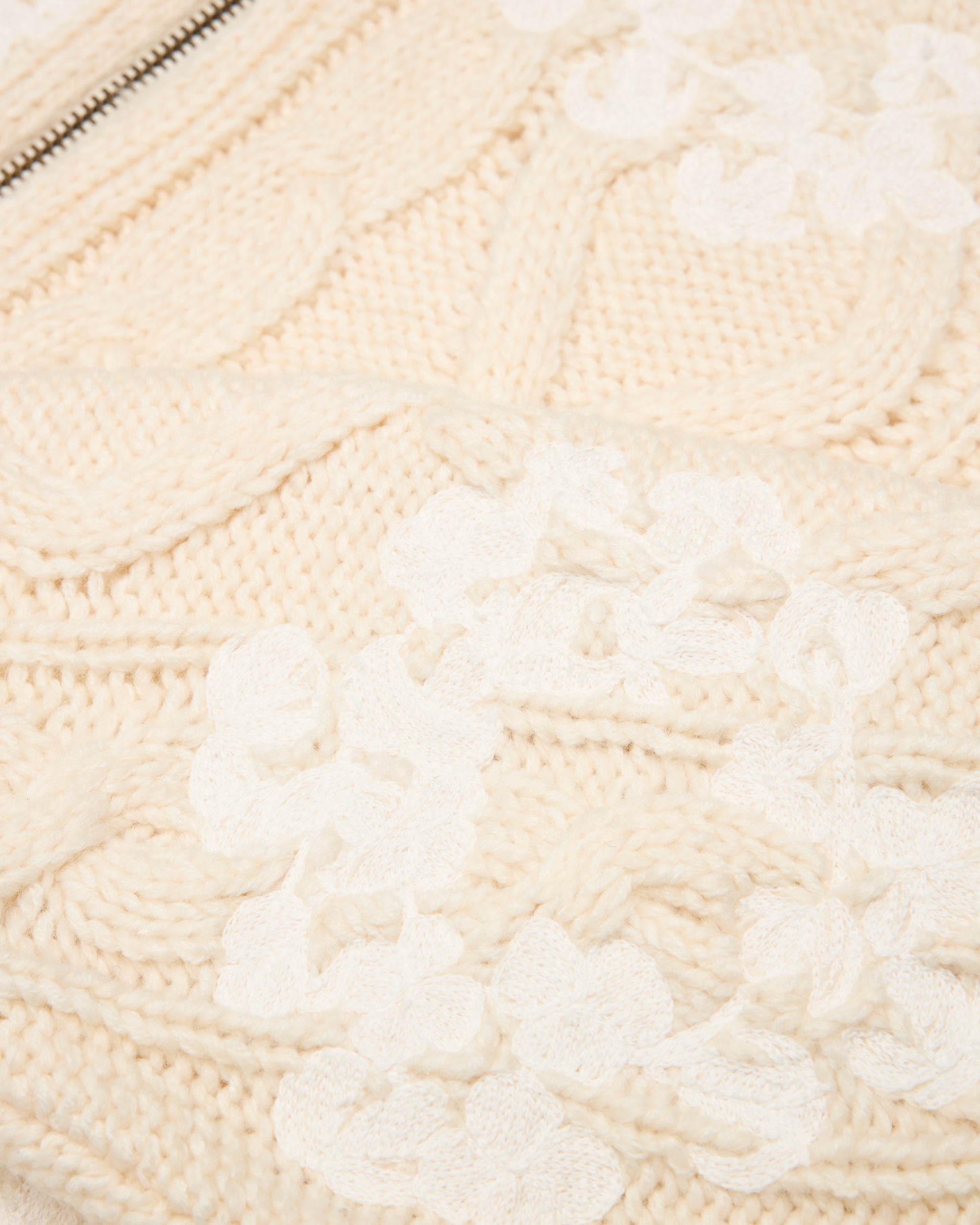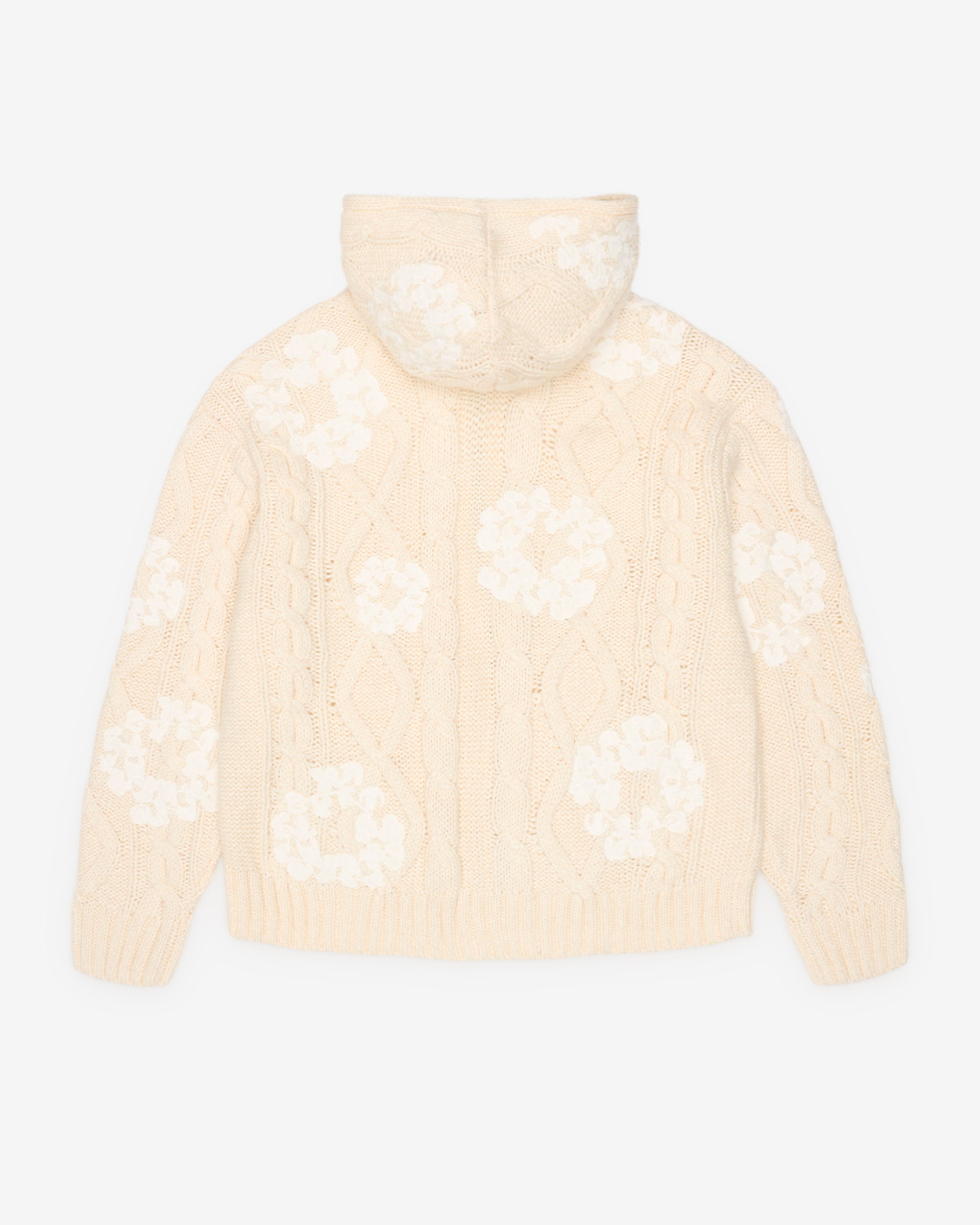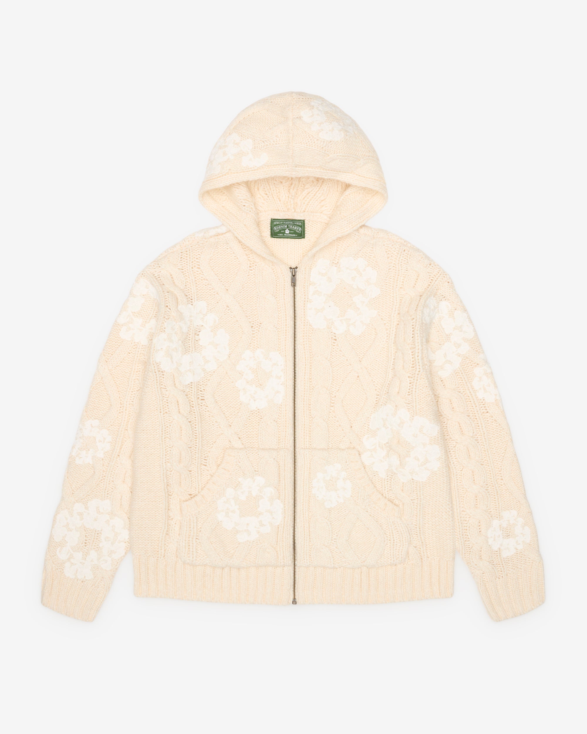 HoodedCable knit fabricZip up closurePrinted wreathe graphics