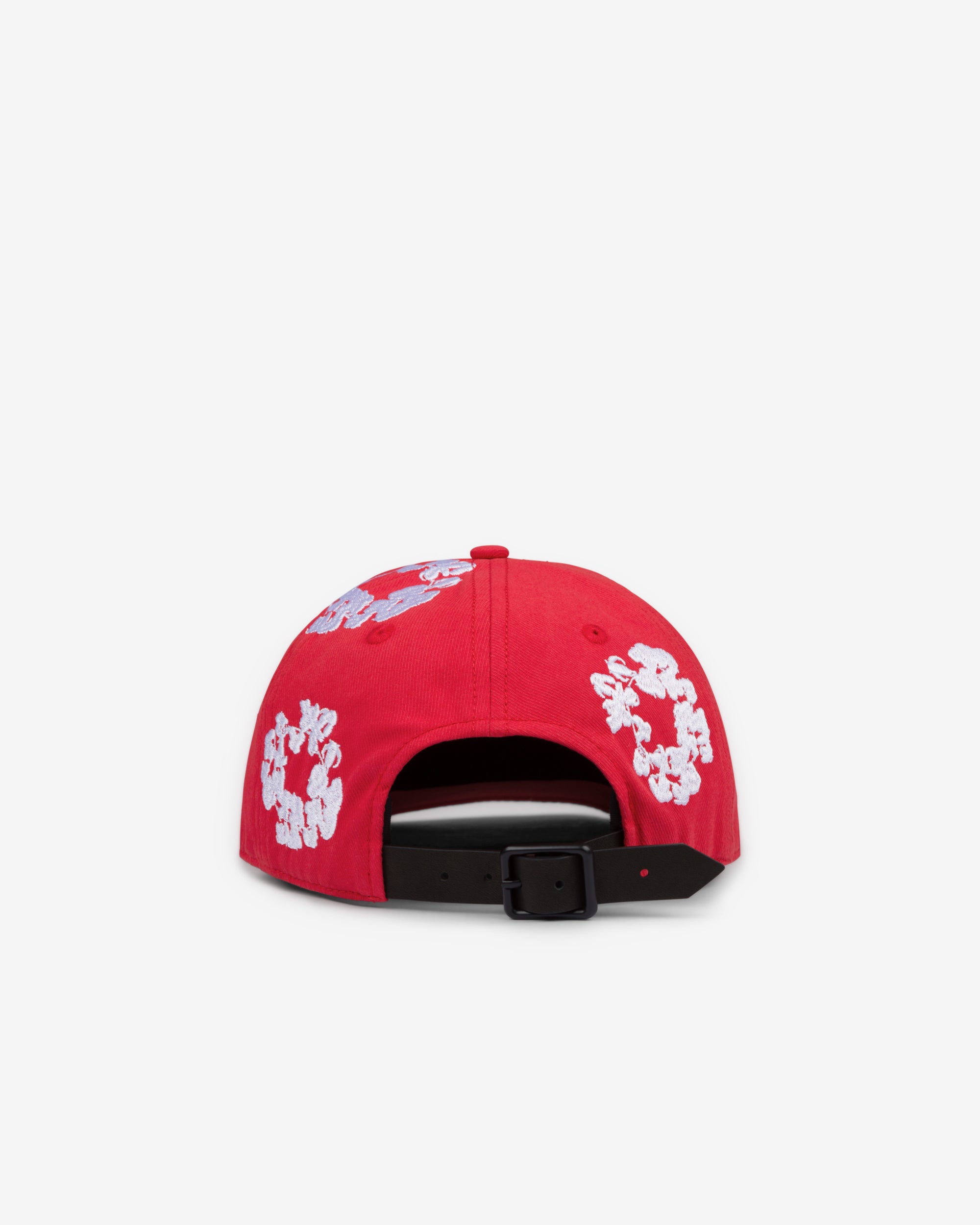 Features all over chainstitch embroidered Cotton Wreath motifLeather strapback Stitched eyelets 6-panel shape100% Cotton Made in China