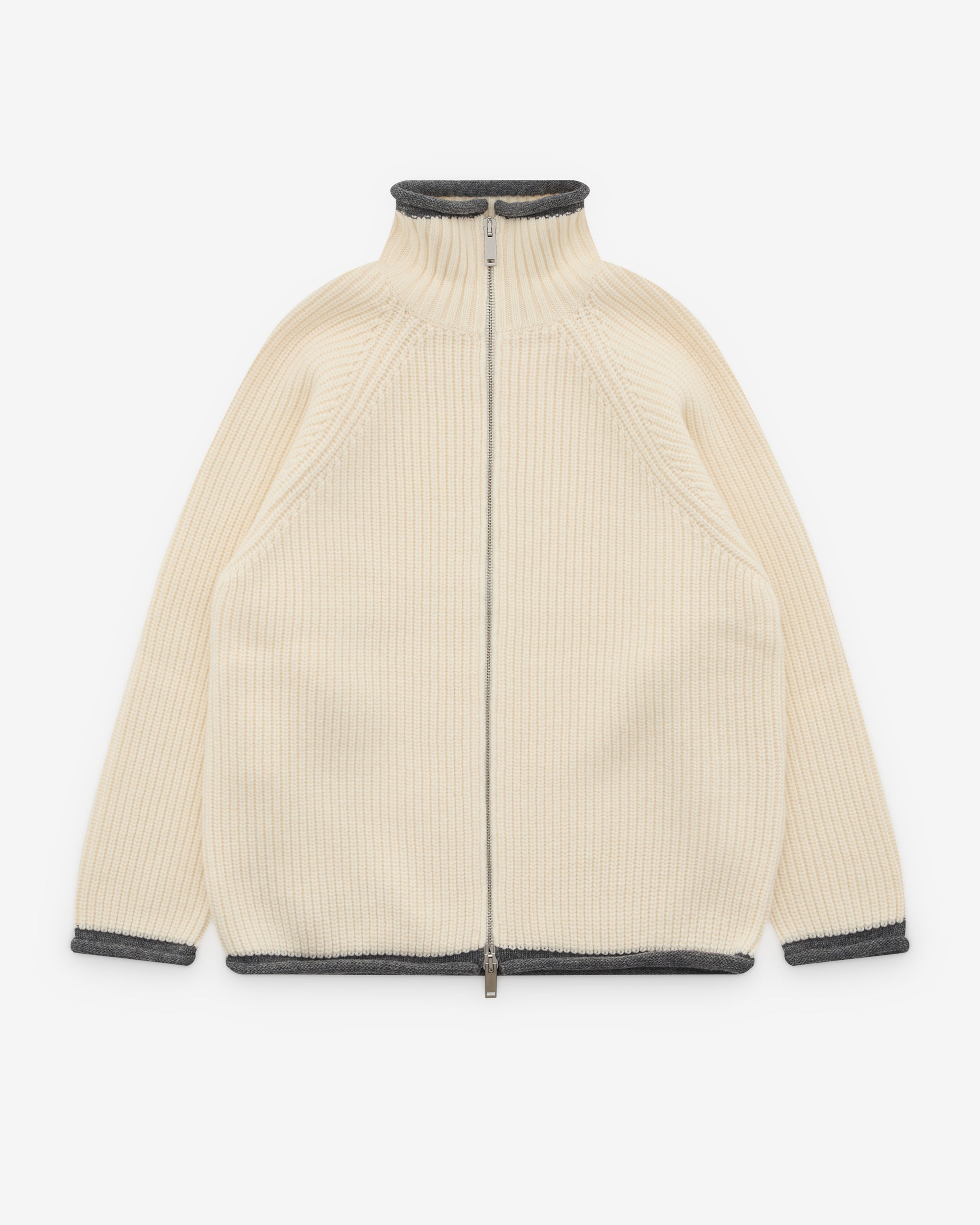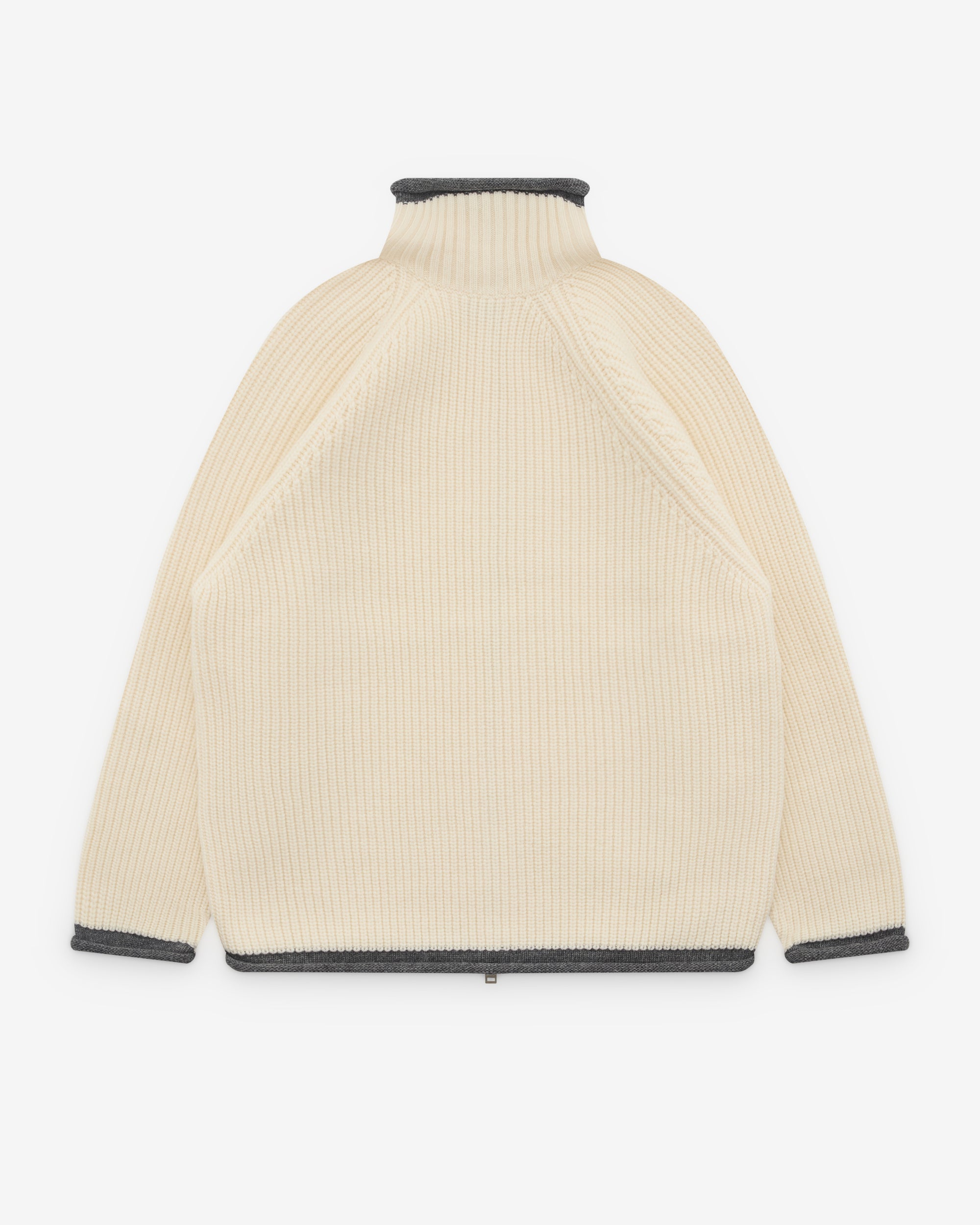Funnel neck collarFull zip closureRoll up hemsRaglan shouldersHeavy wool knit