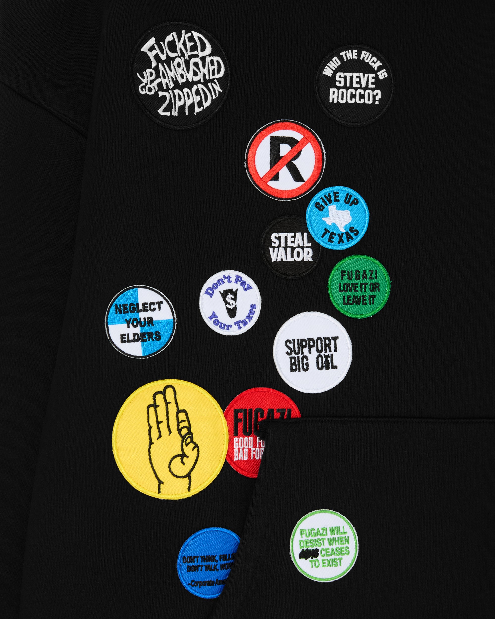 Button hoodGraphic patches at frontFront kangaroo pocketRibbed cuffs and hem