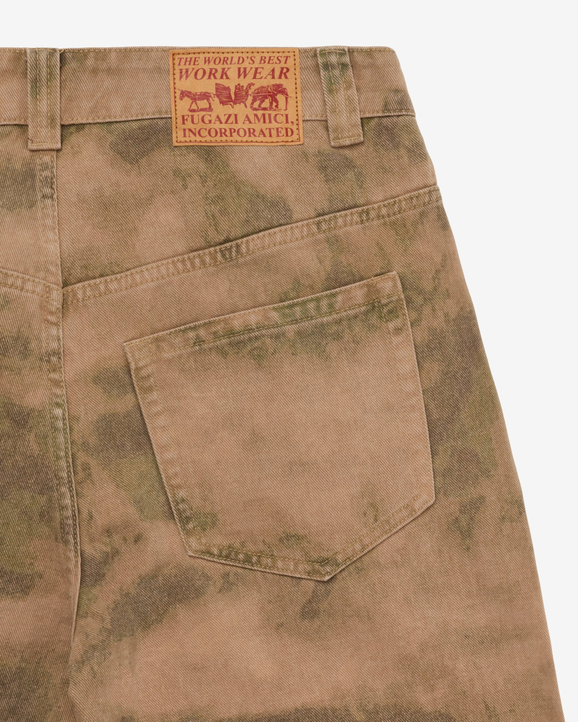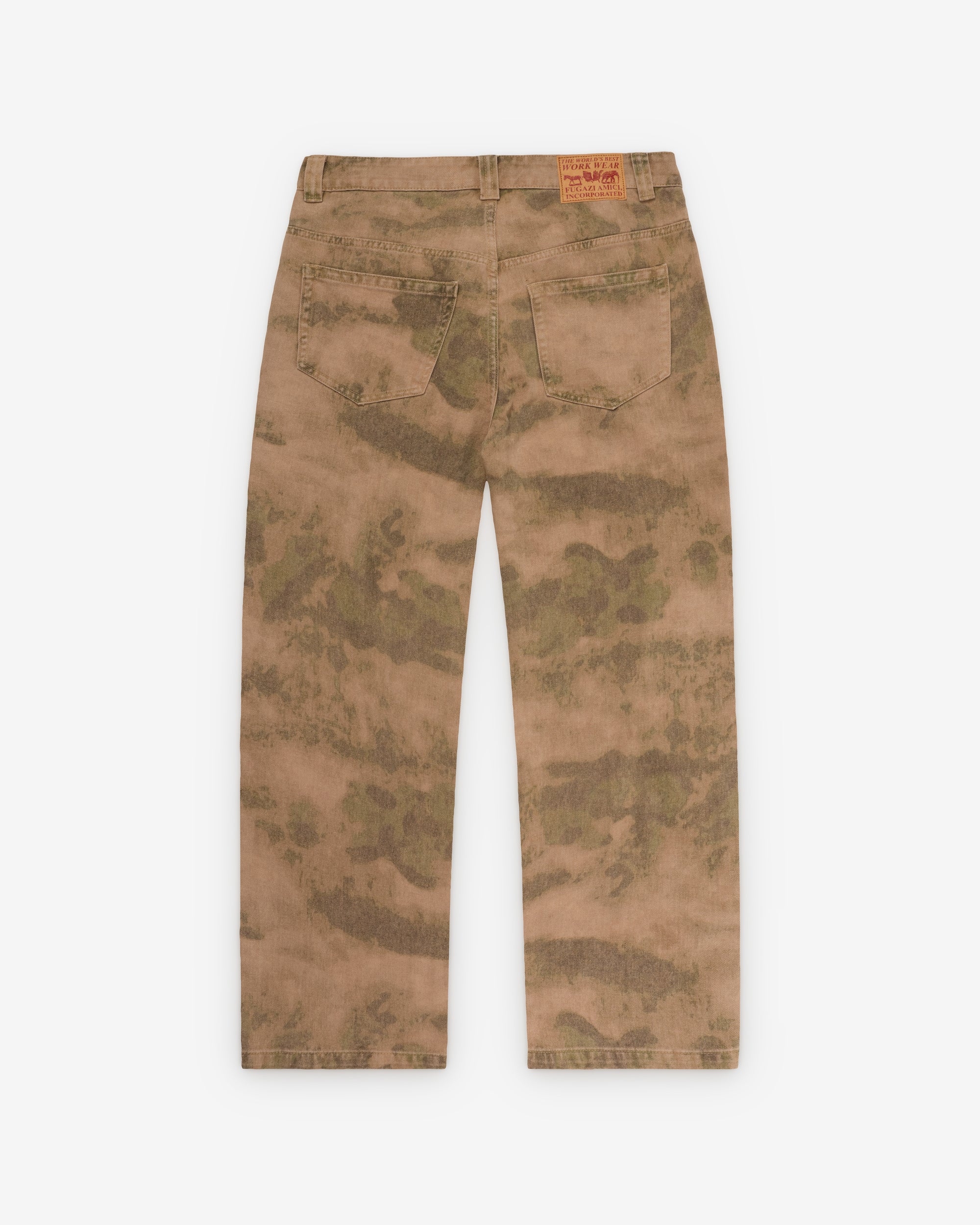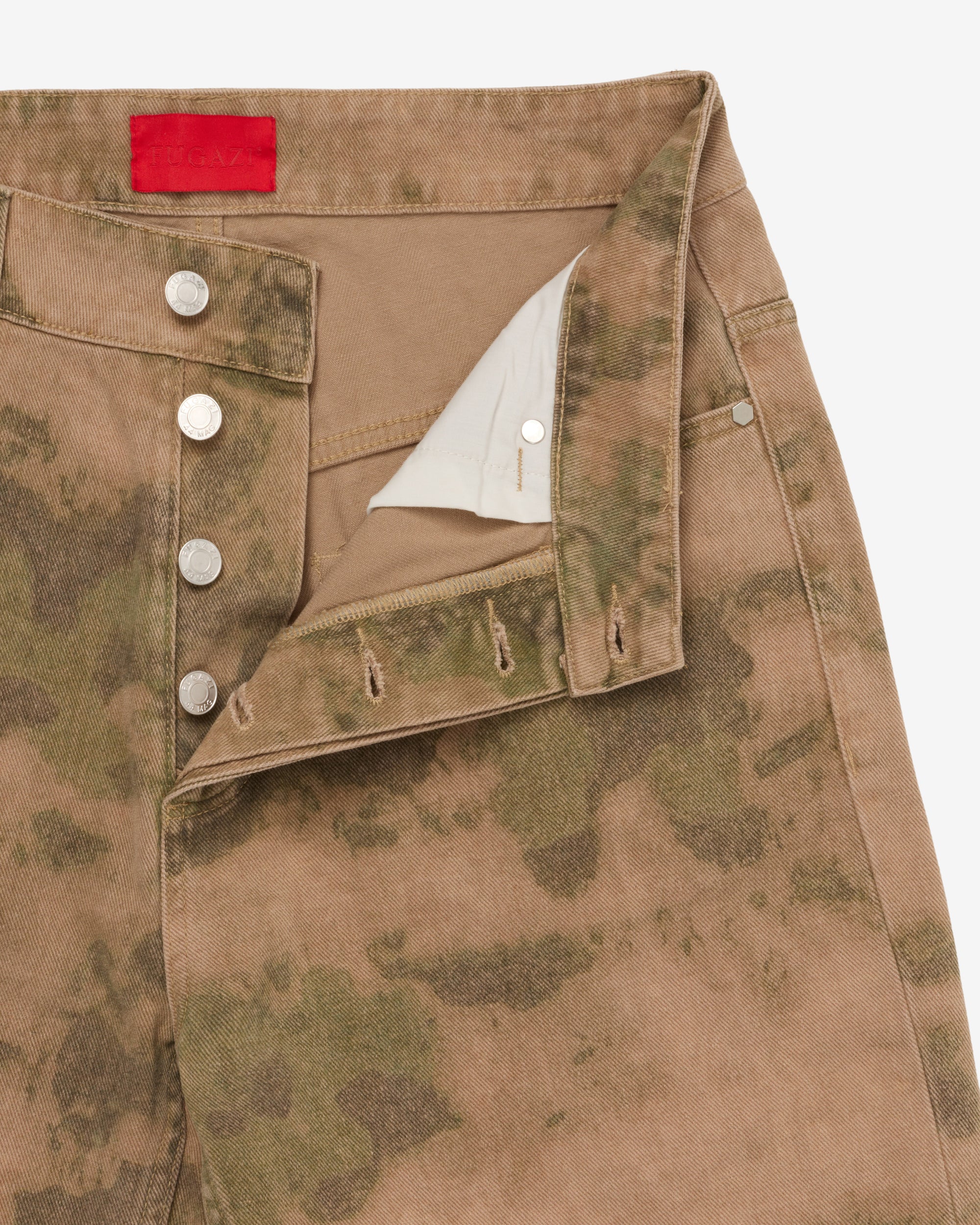 Button waist and flyLoose fitCamo print fabricFive pocket construction Leather patch at rear waist bandBelt loops