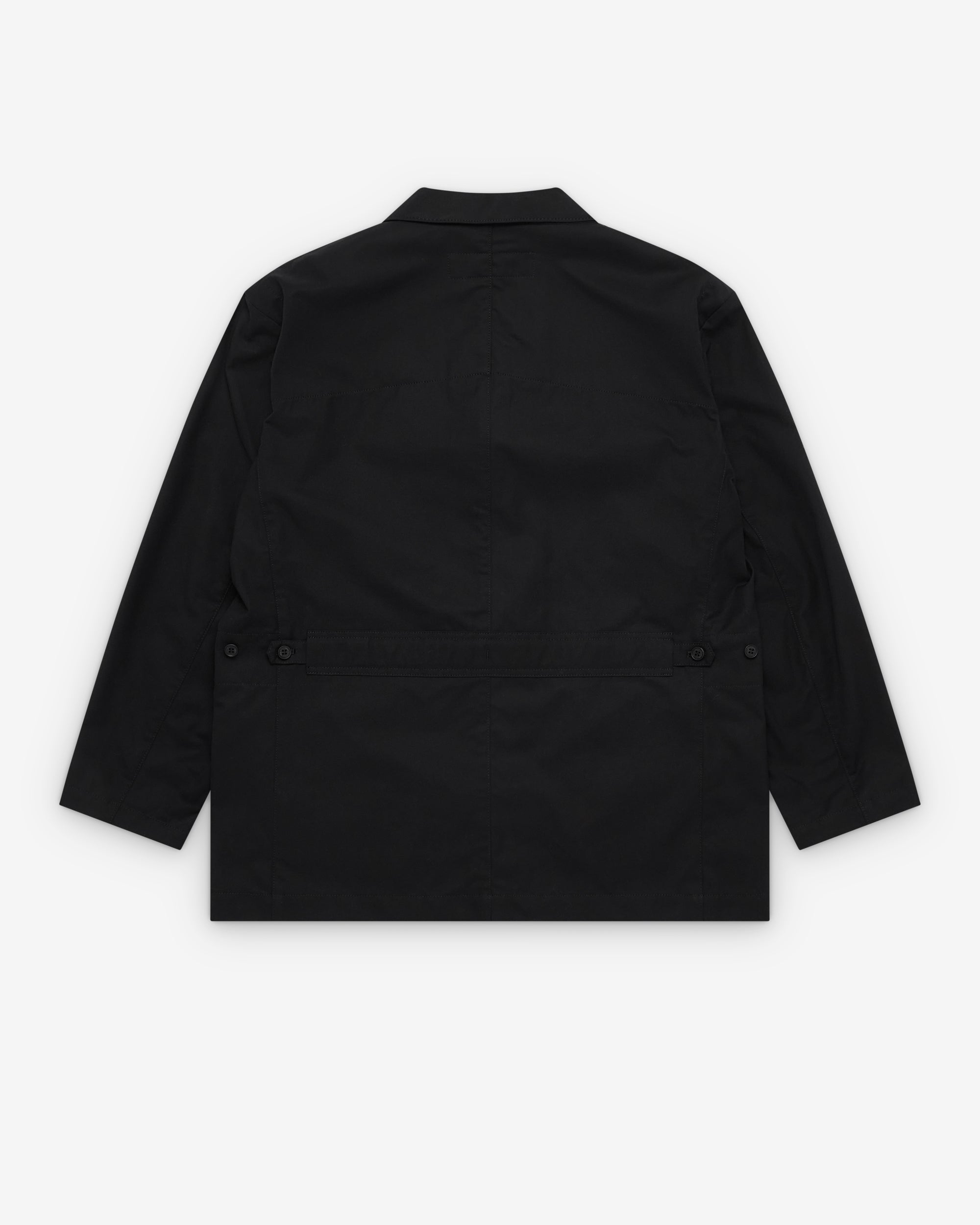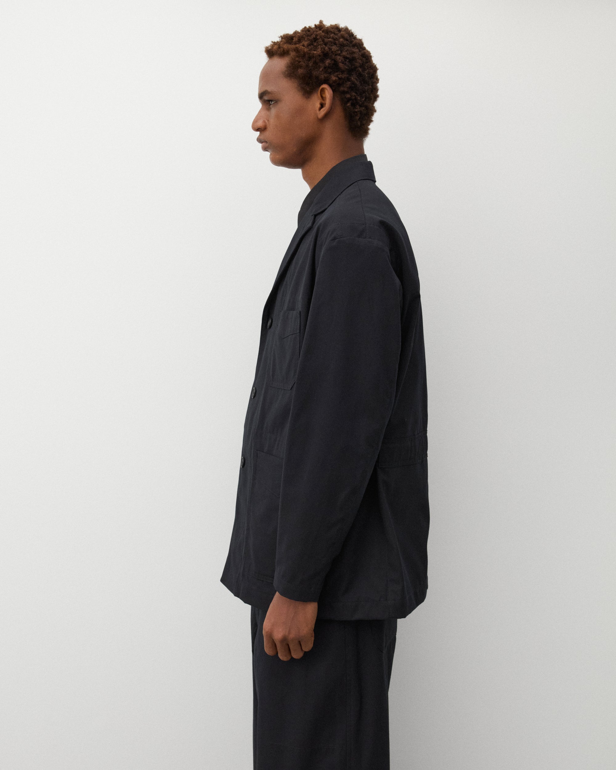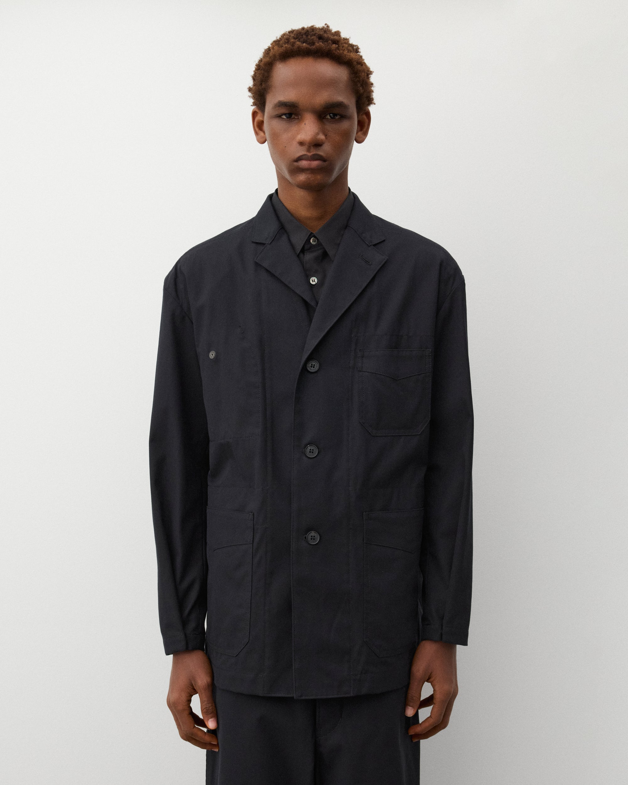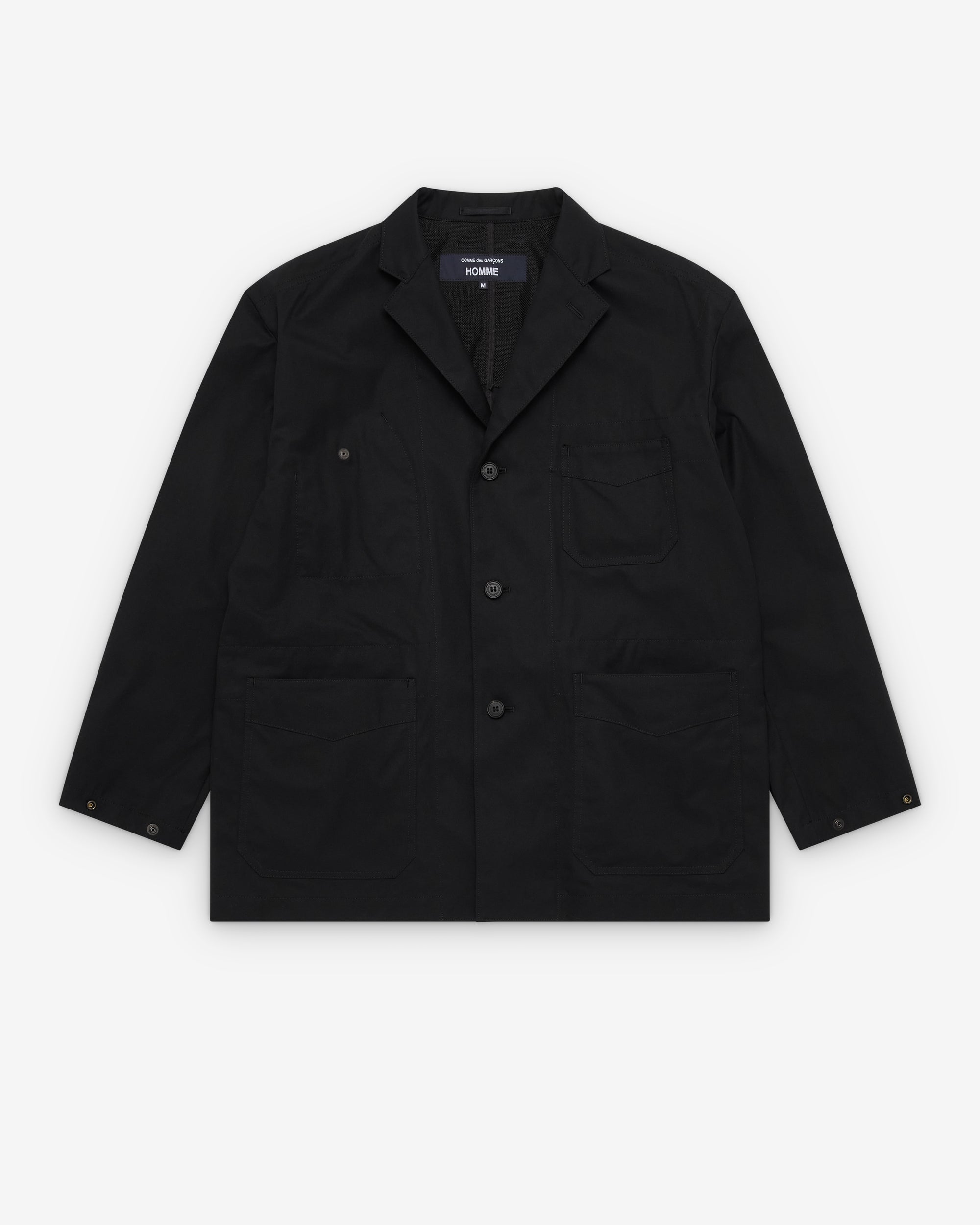 Open collarNotched lapelThree button closureChest pocketTwo front pocketsInternal zip close pocketsPress stud adjustable cuffs