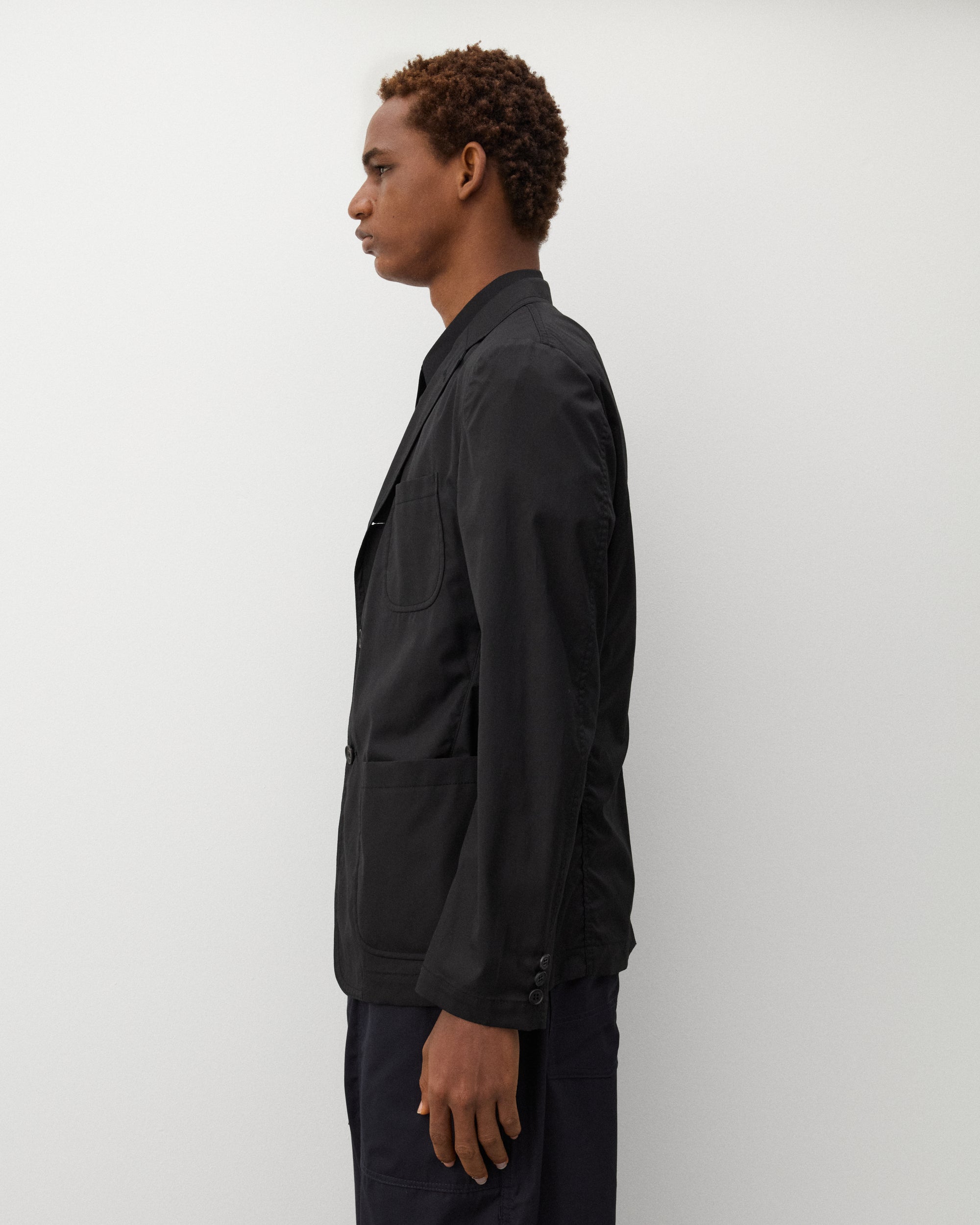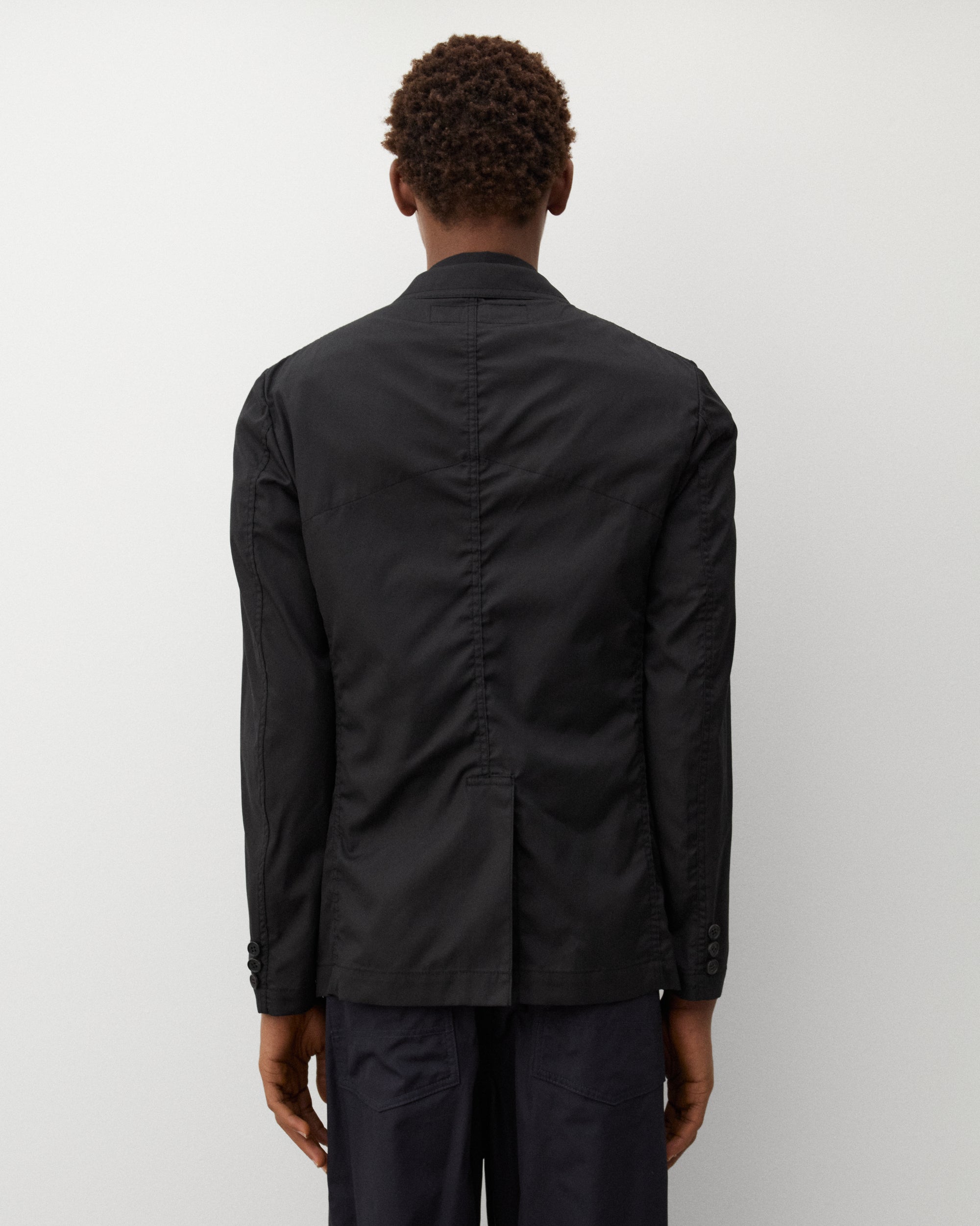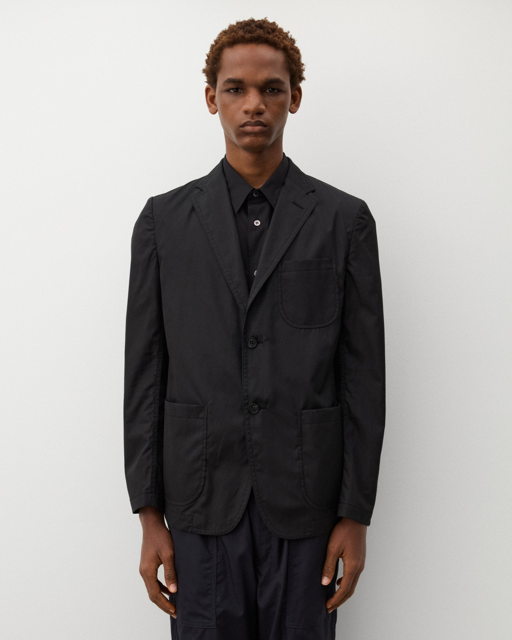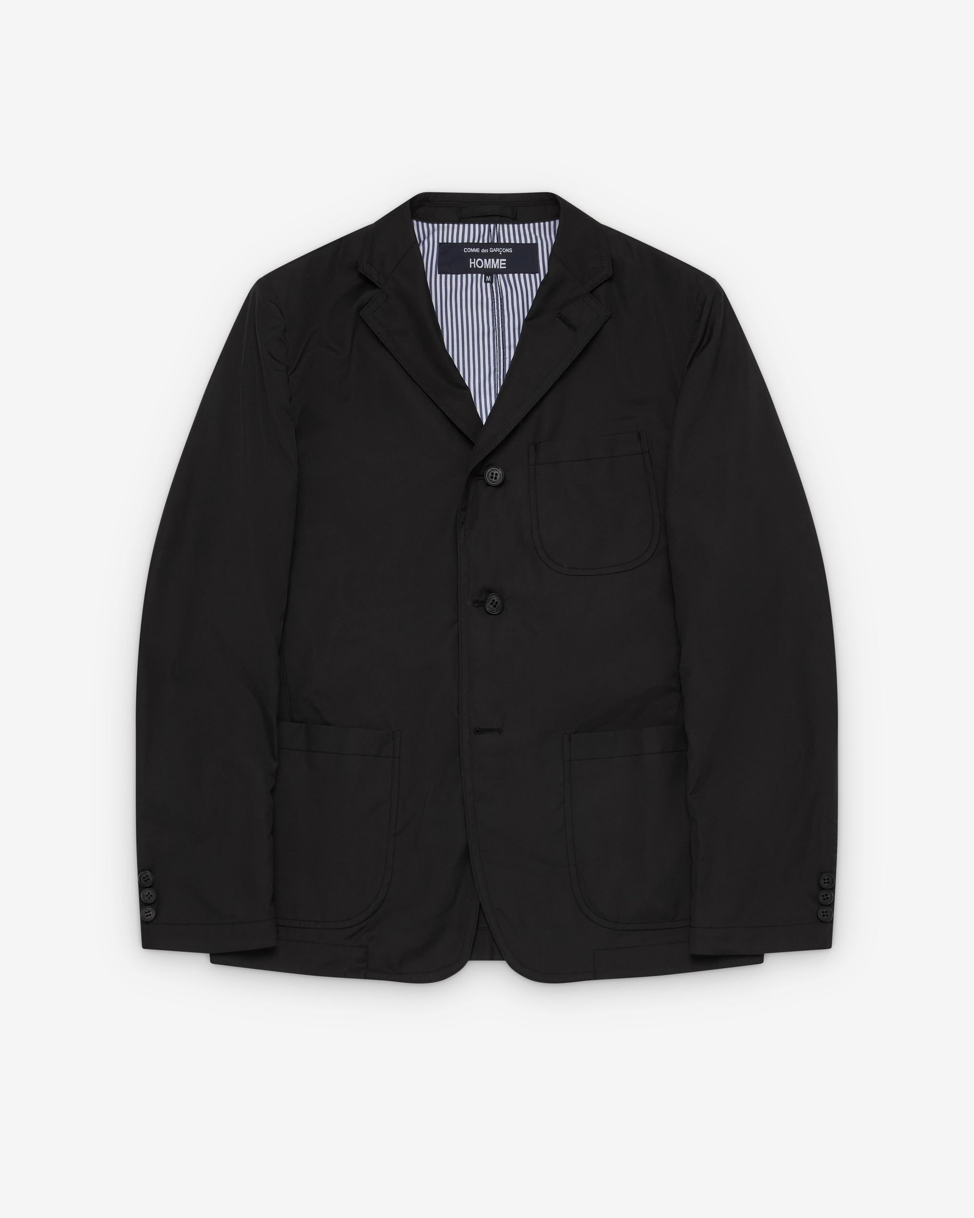 Three button closureSingle breastedNotched lapel collarChest pocketTwo front patch pocketsPartial internal lining Lightweight cotton fabricSplit rear hem