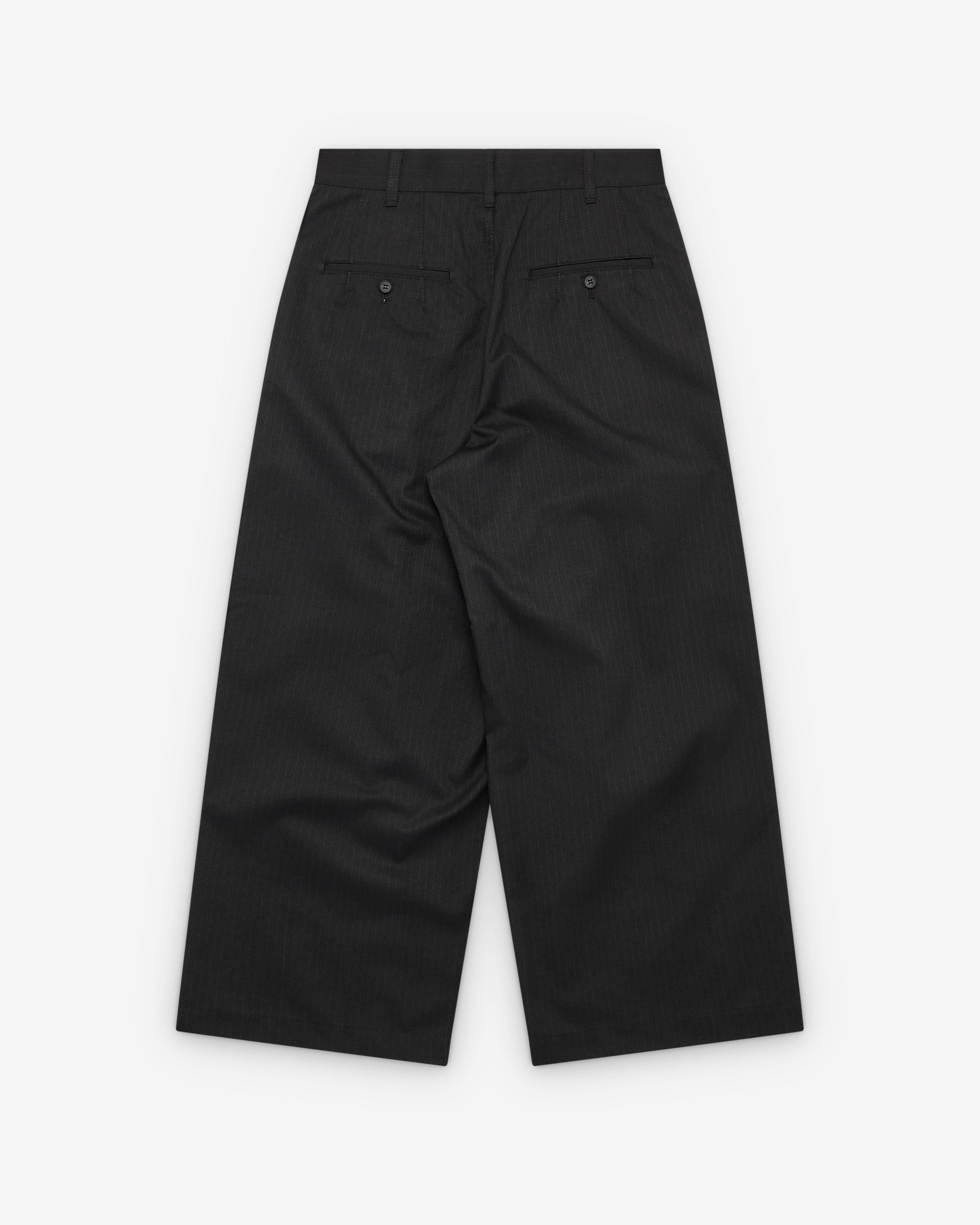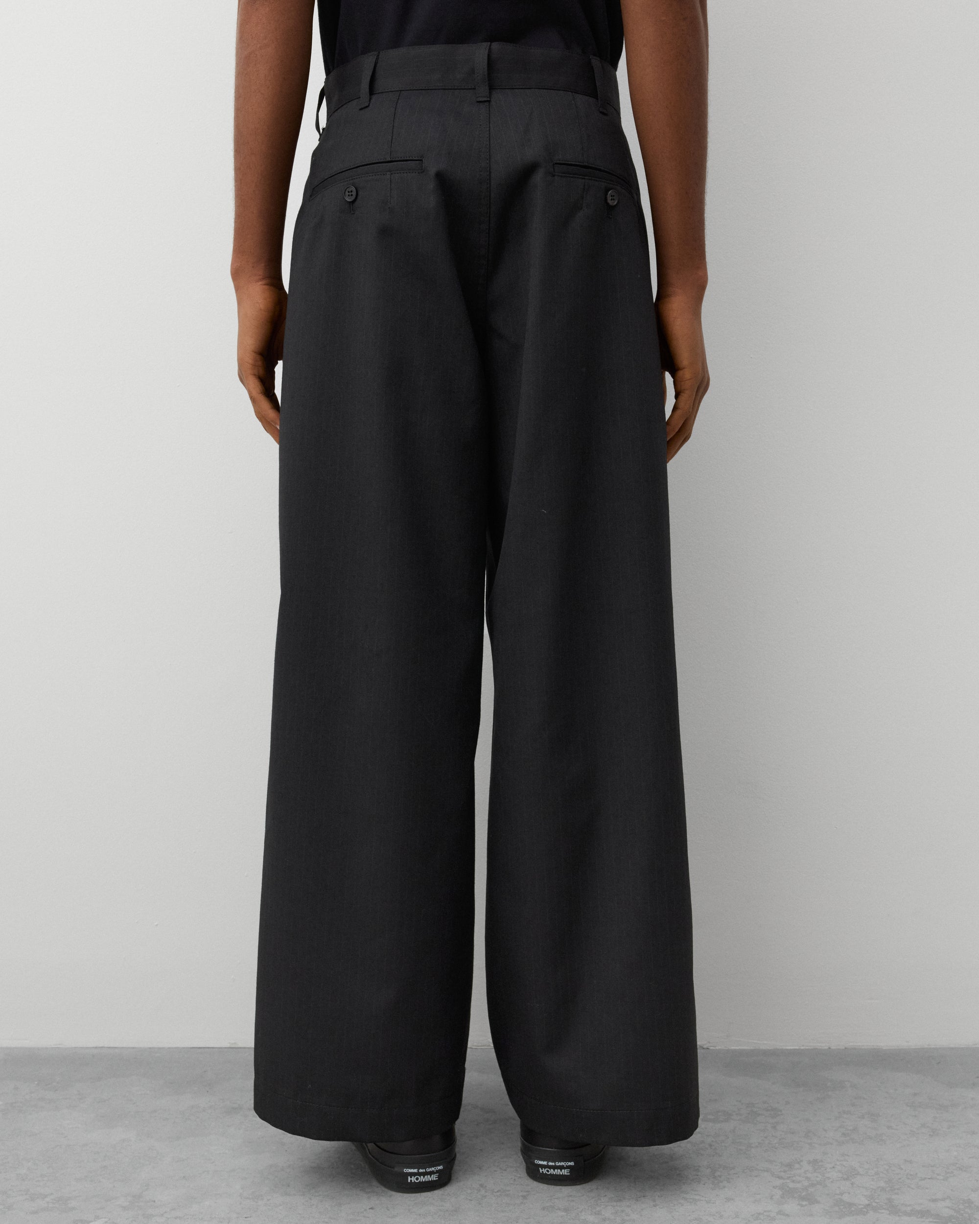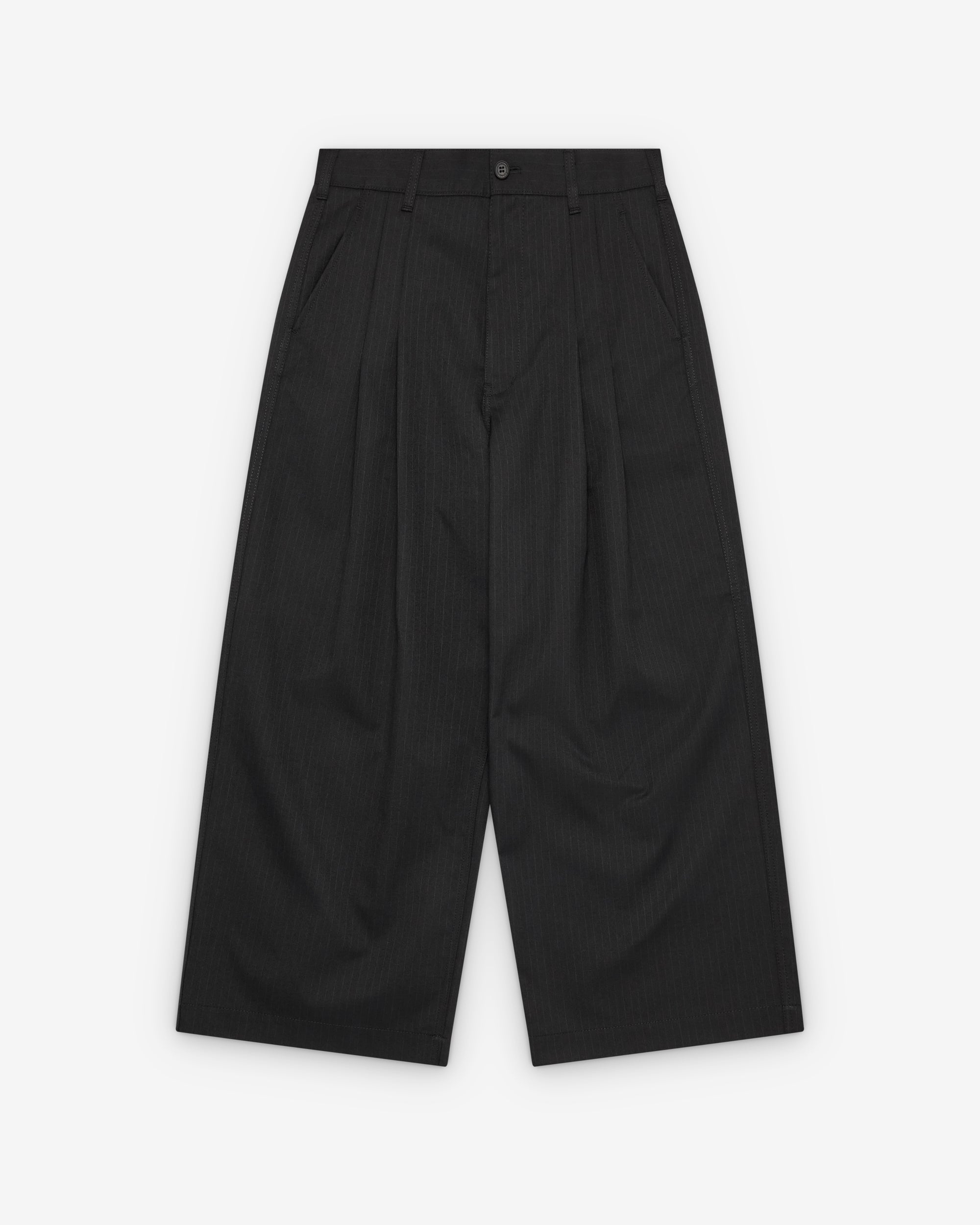 Double pleated frontButton waist, zip flySide slip pocketsWide legTwo rear pockets