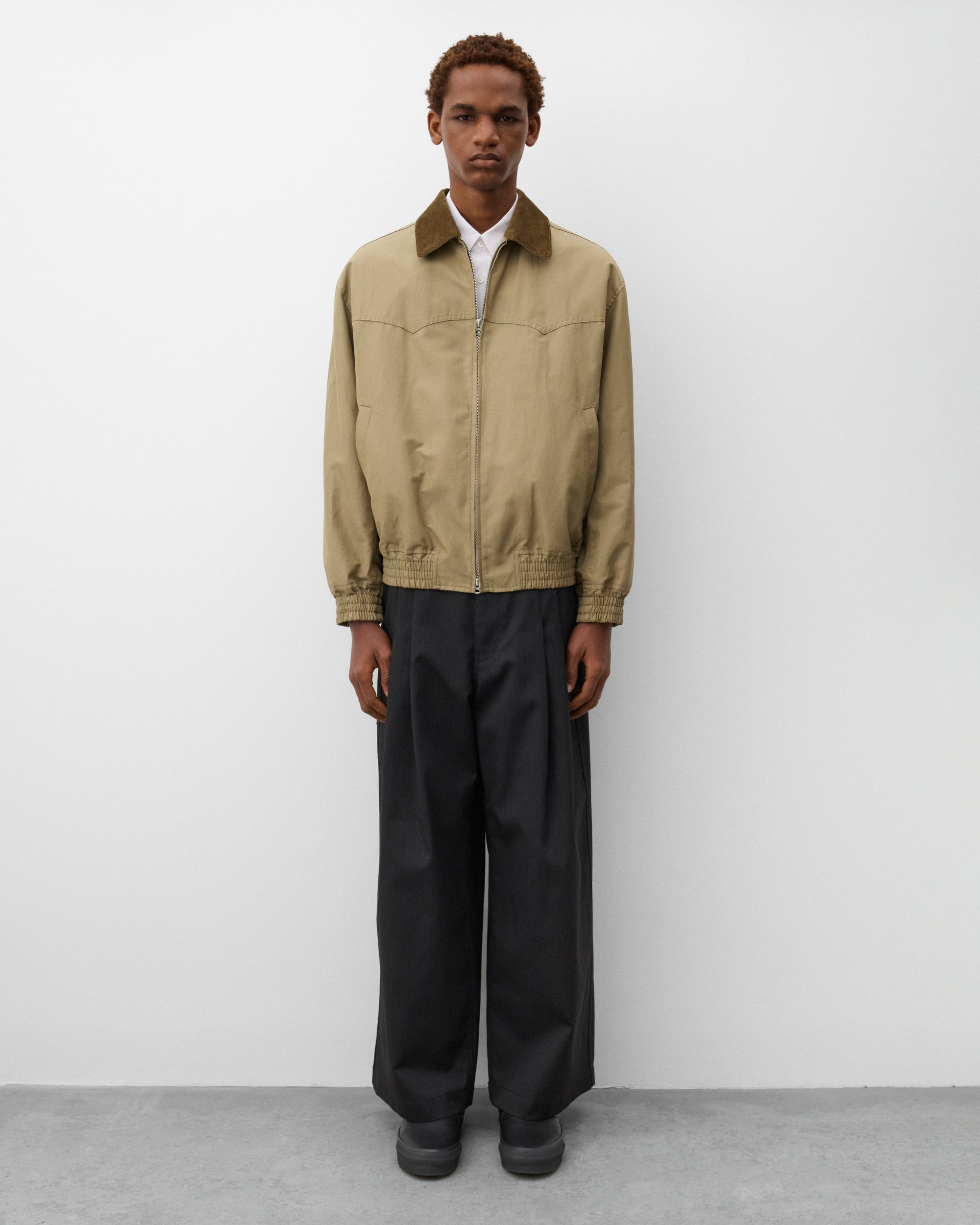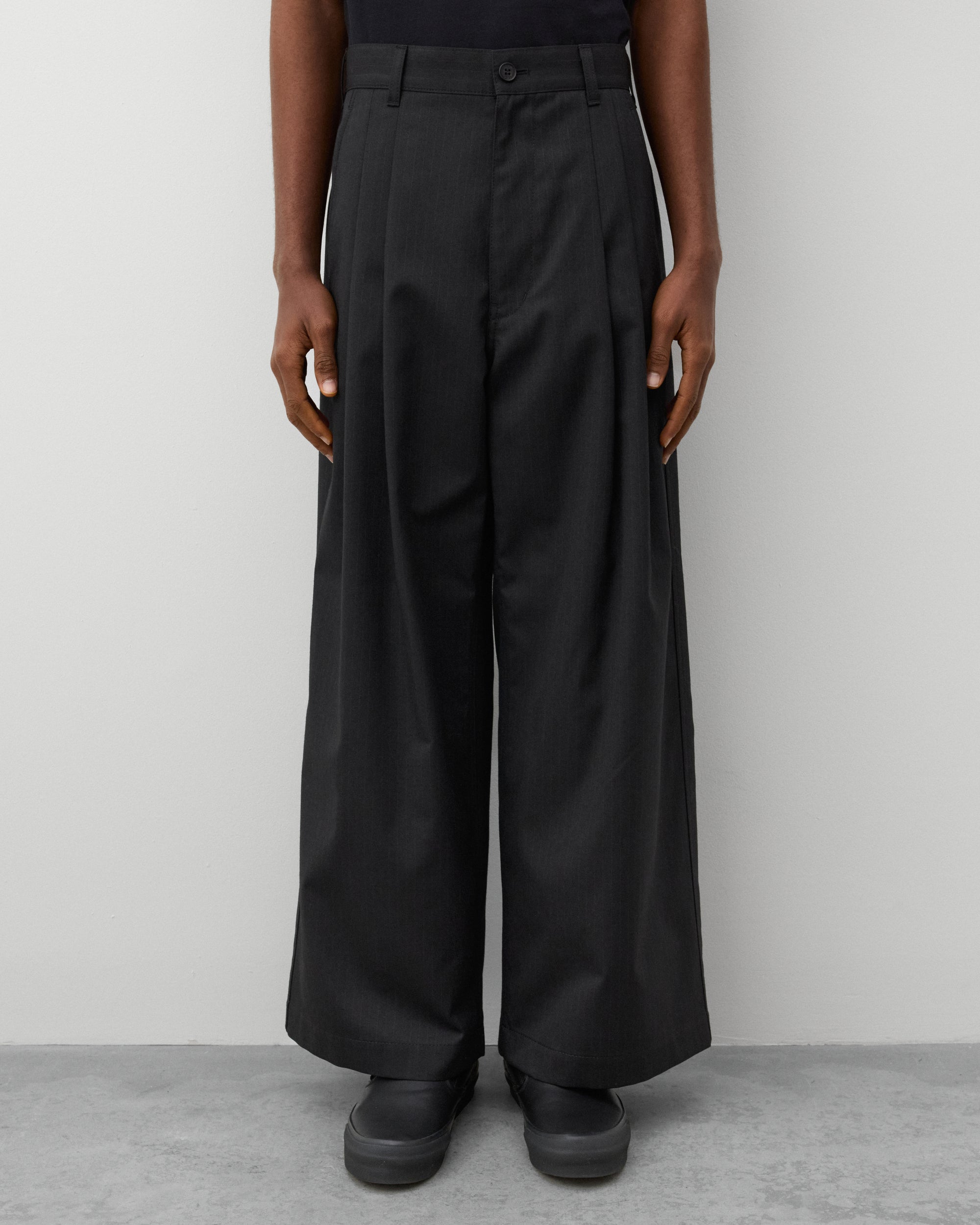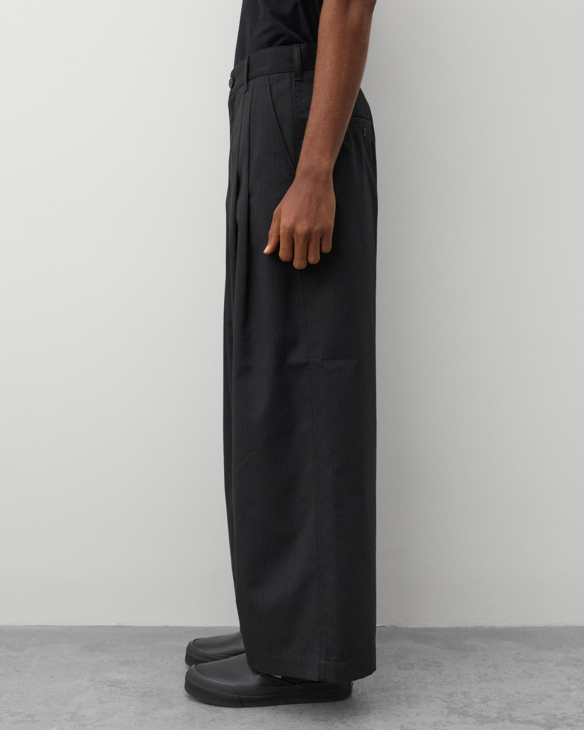 Double pleated frontButton waist, zip flySide slip pocketsWide legTwo rear pockets