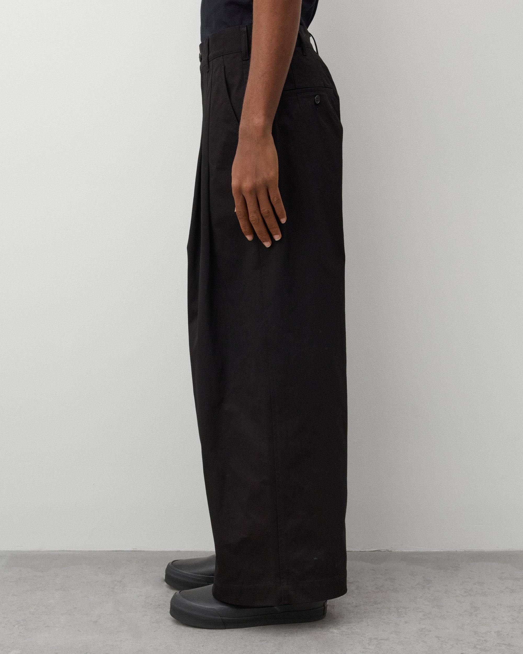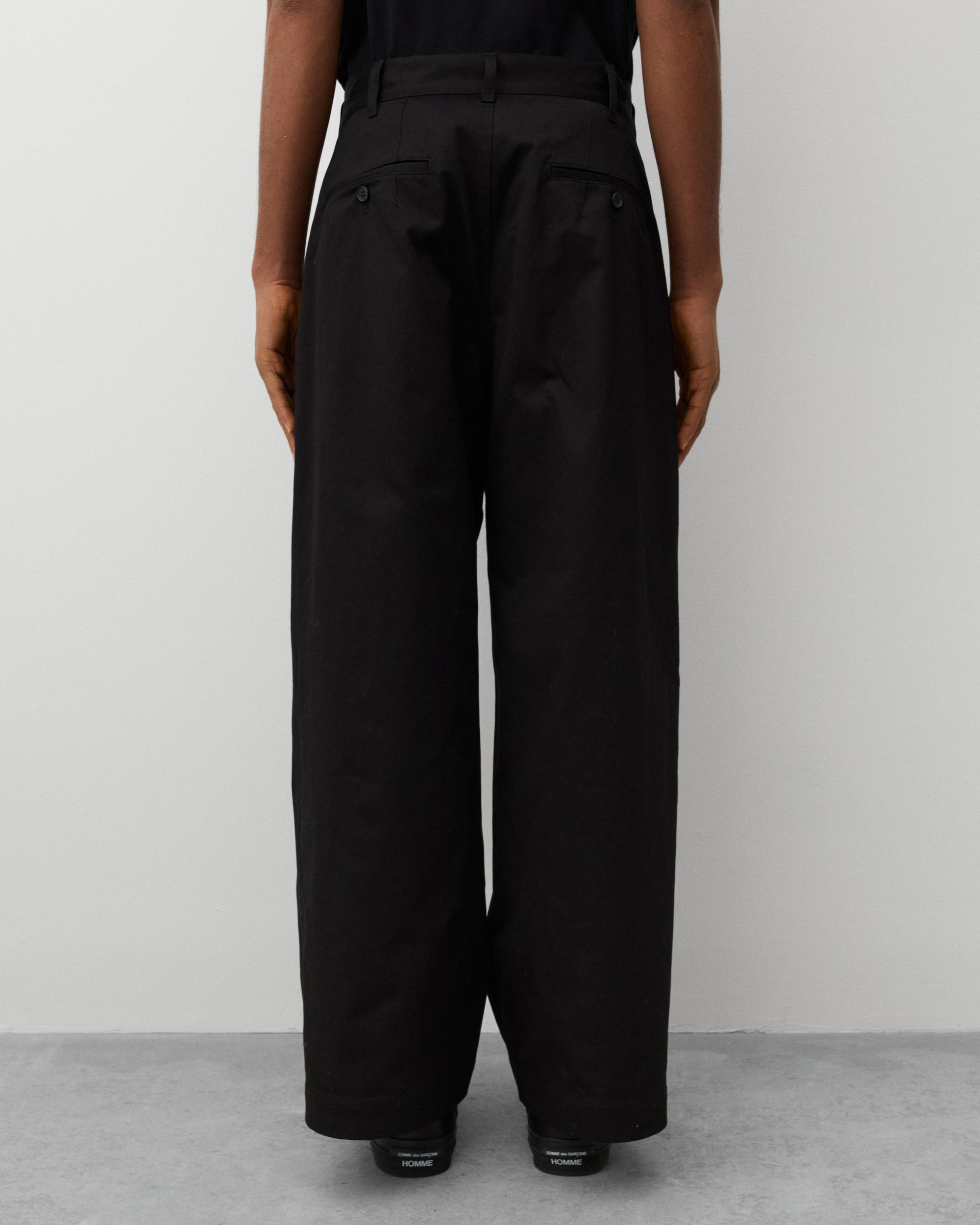 Button waist, zip flyDoublet pleated frontWide legSide seam pocketsTwo button close back pockets