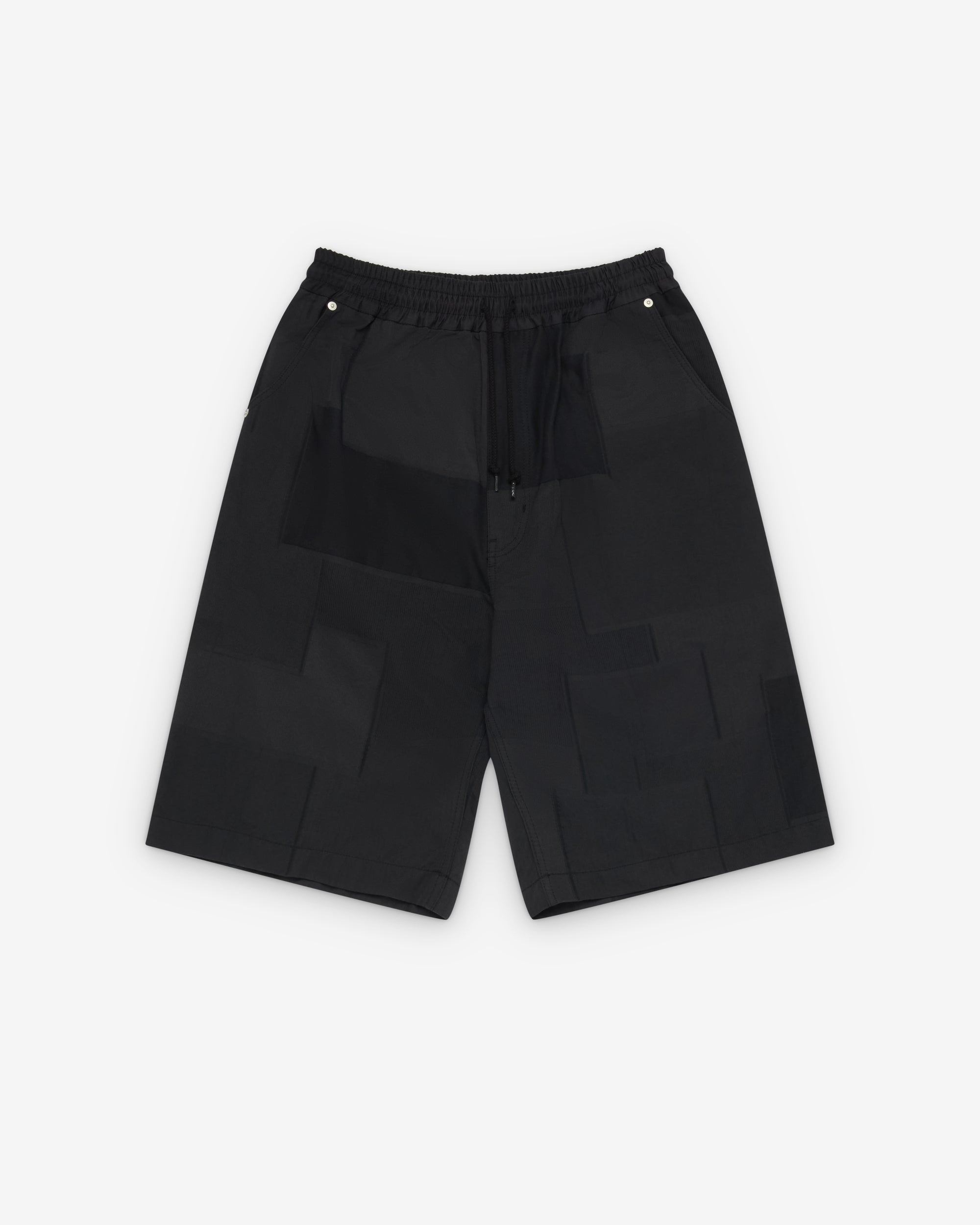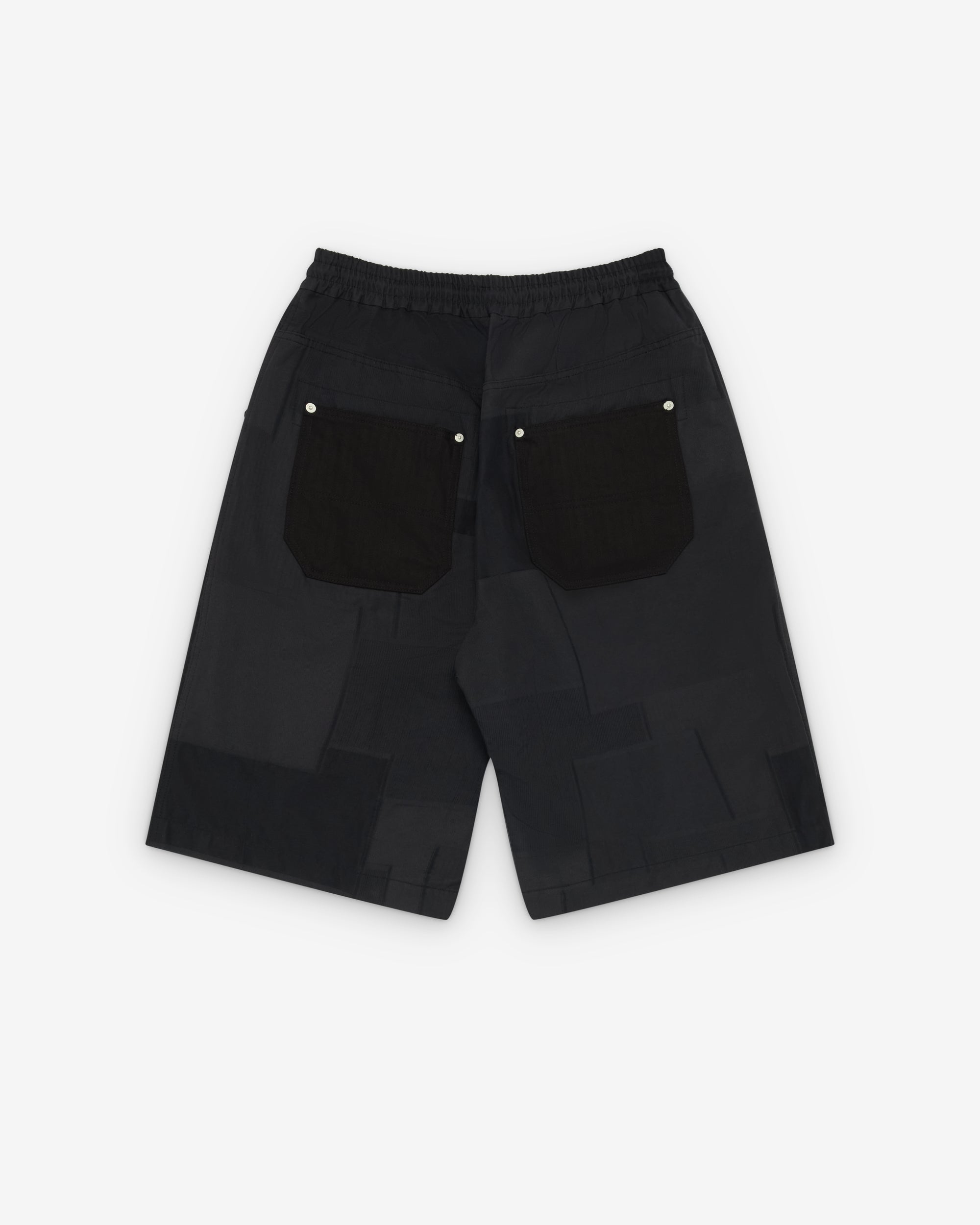 Drawstring waist bandSide seam pocketsMetal rivet detailWide legPatchwork fabric Knee length