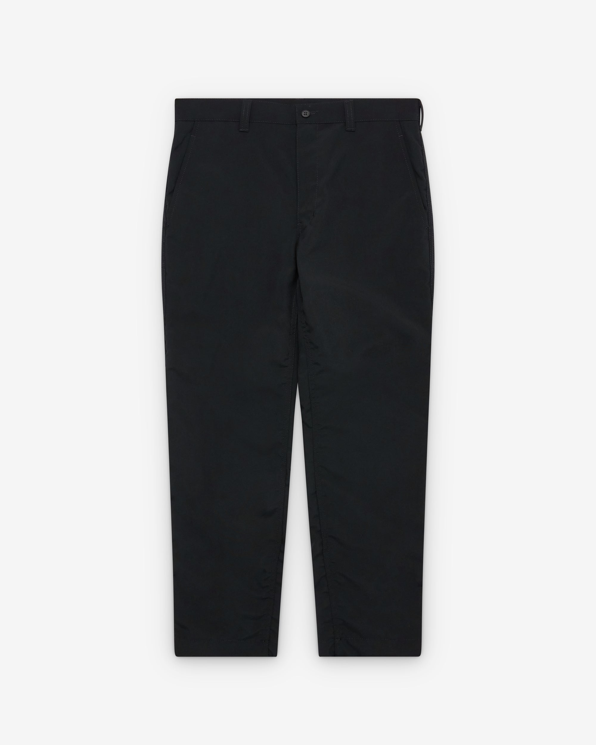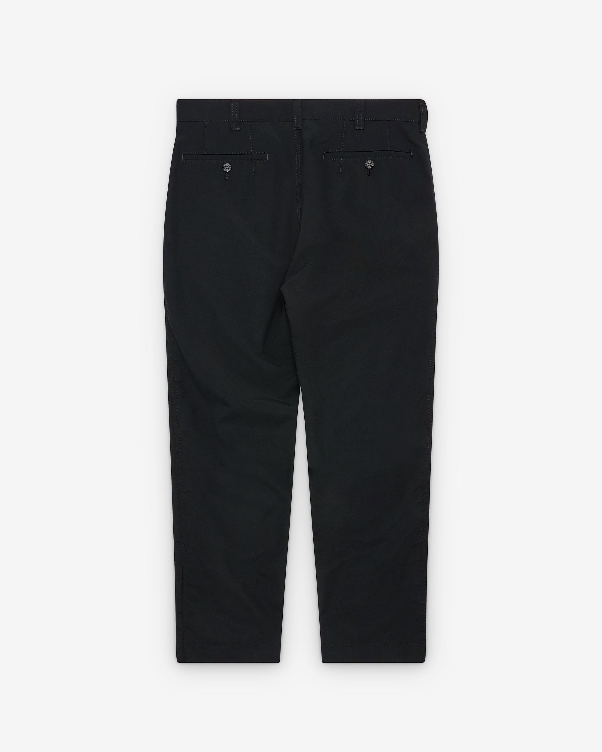 Button waist, zip flyAngled slash pocketsSlim legTwo back pockets