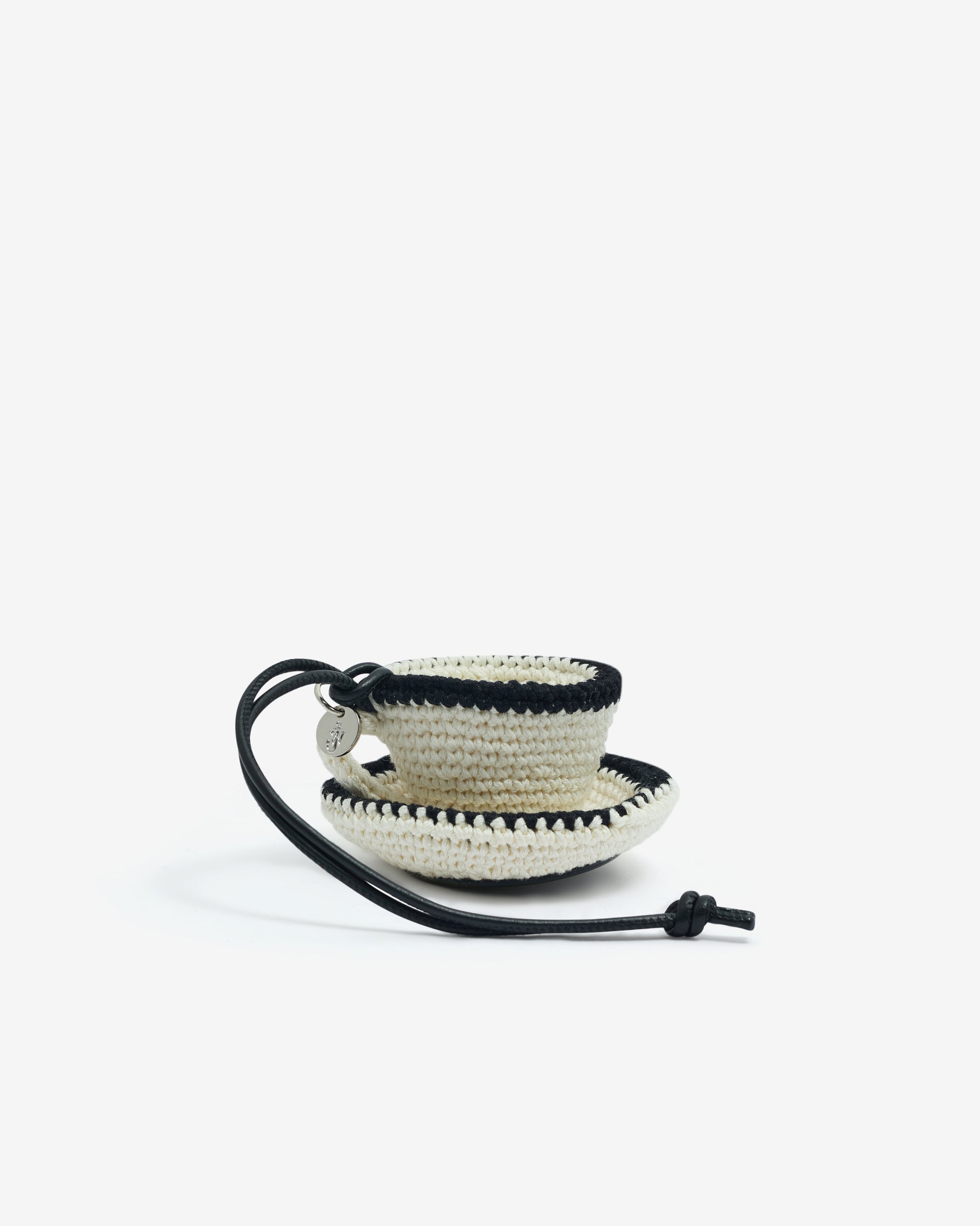 Hand-crocheted mercerised cotton yarn tea-cup charm with contrasting coloured details