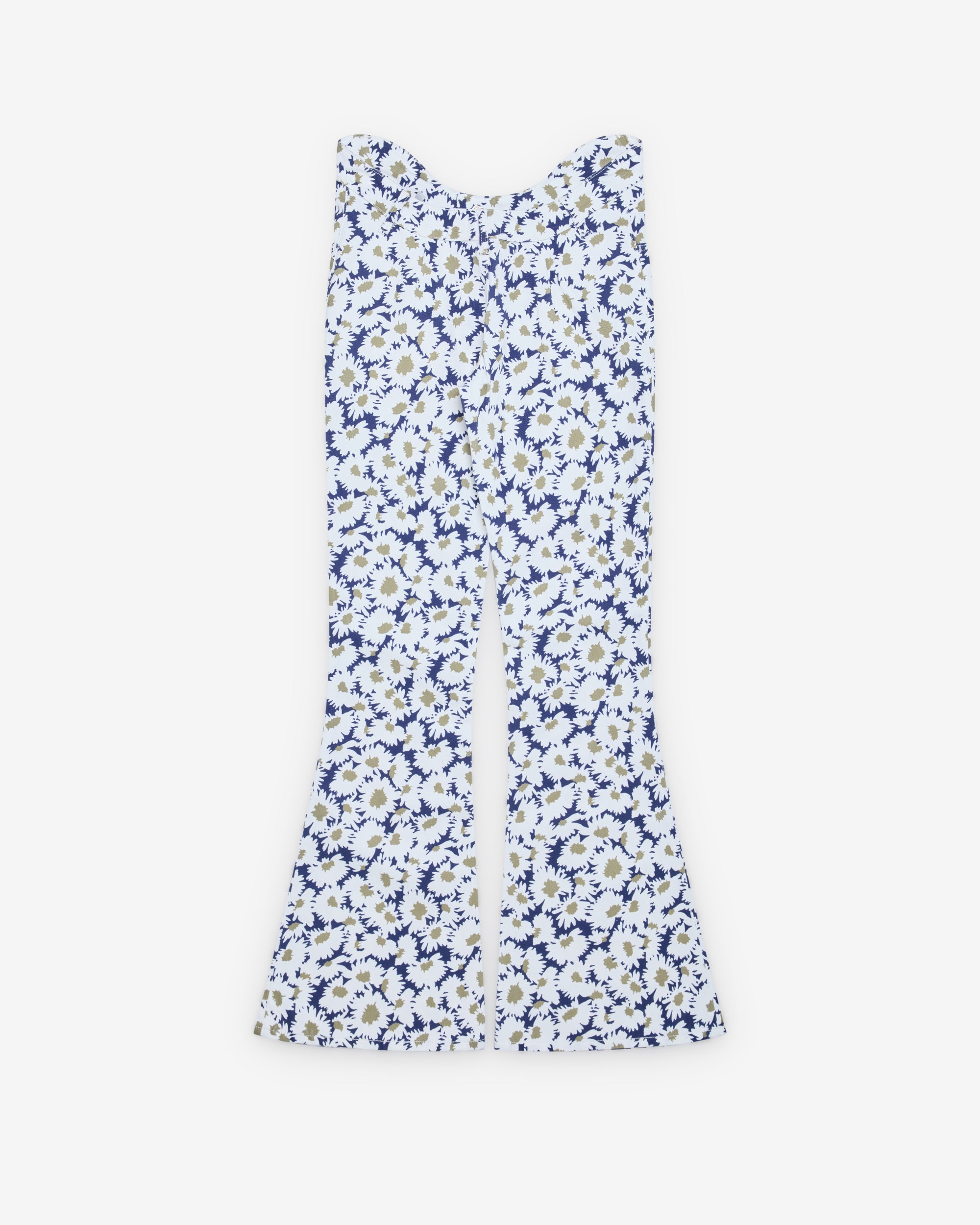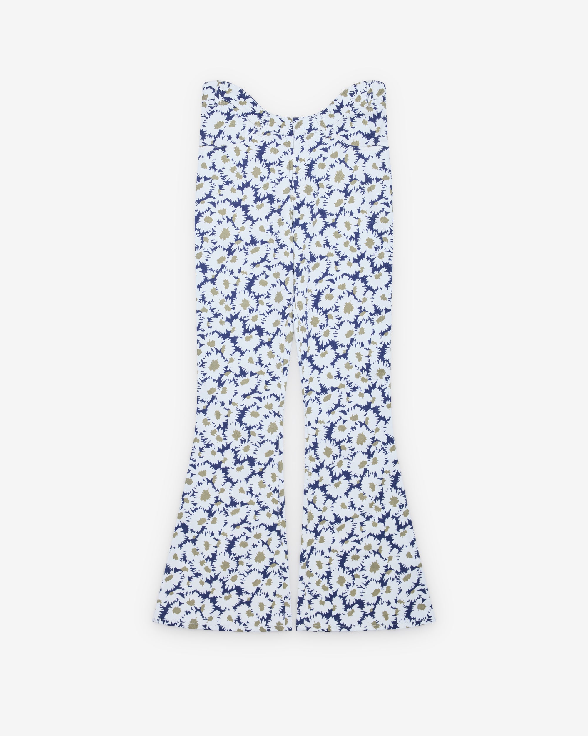 Bootcut styleMid-rise curved waistNavy-blue floral printFour belt loops100% CottonMade in Italy
