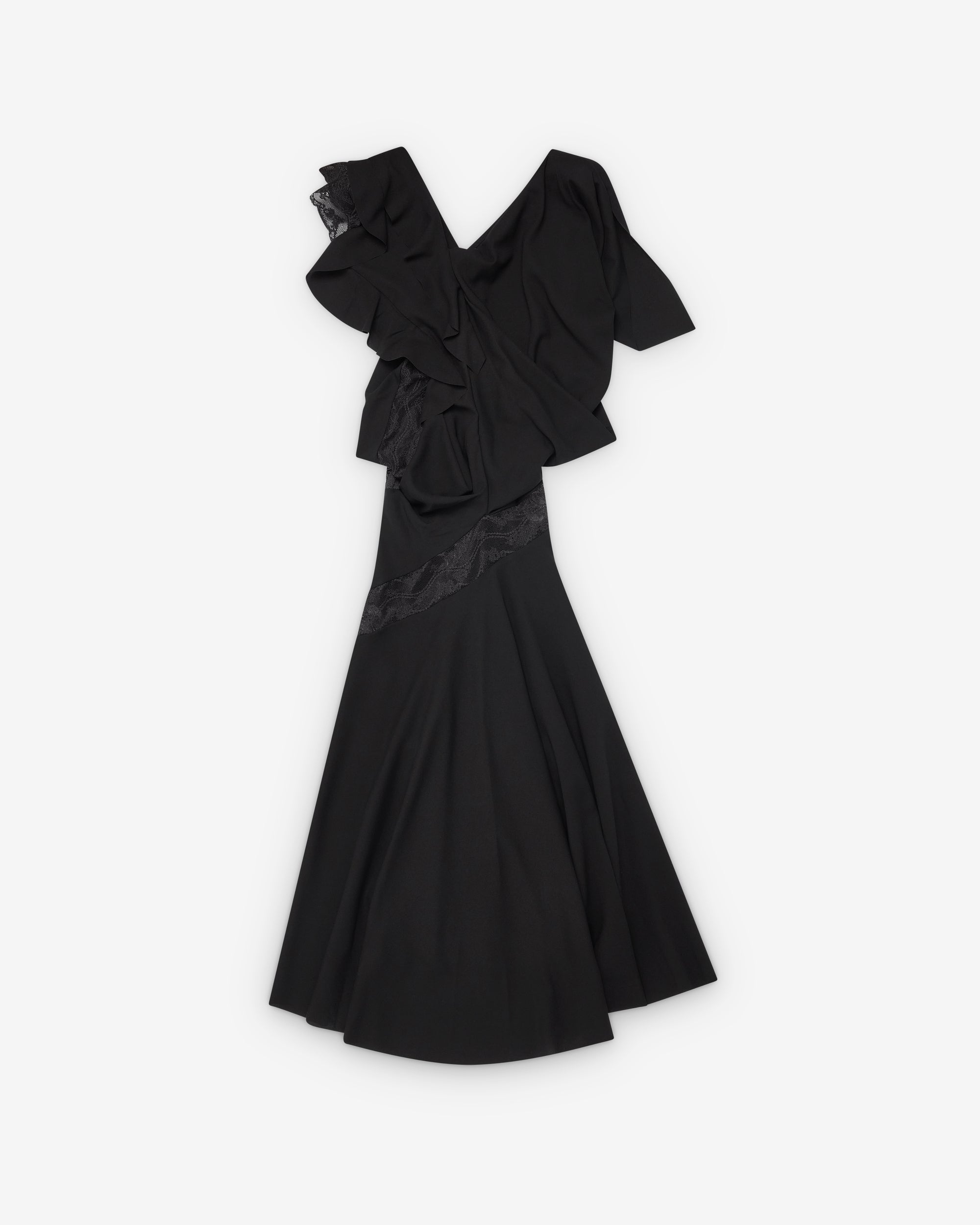 V-neckline and backLace trim detailsFitted waistPleated skirtFlared, midi length skirt