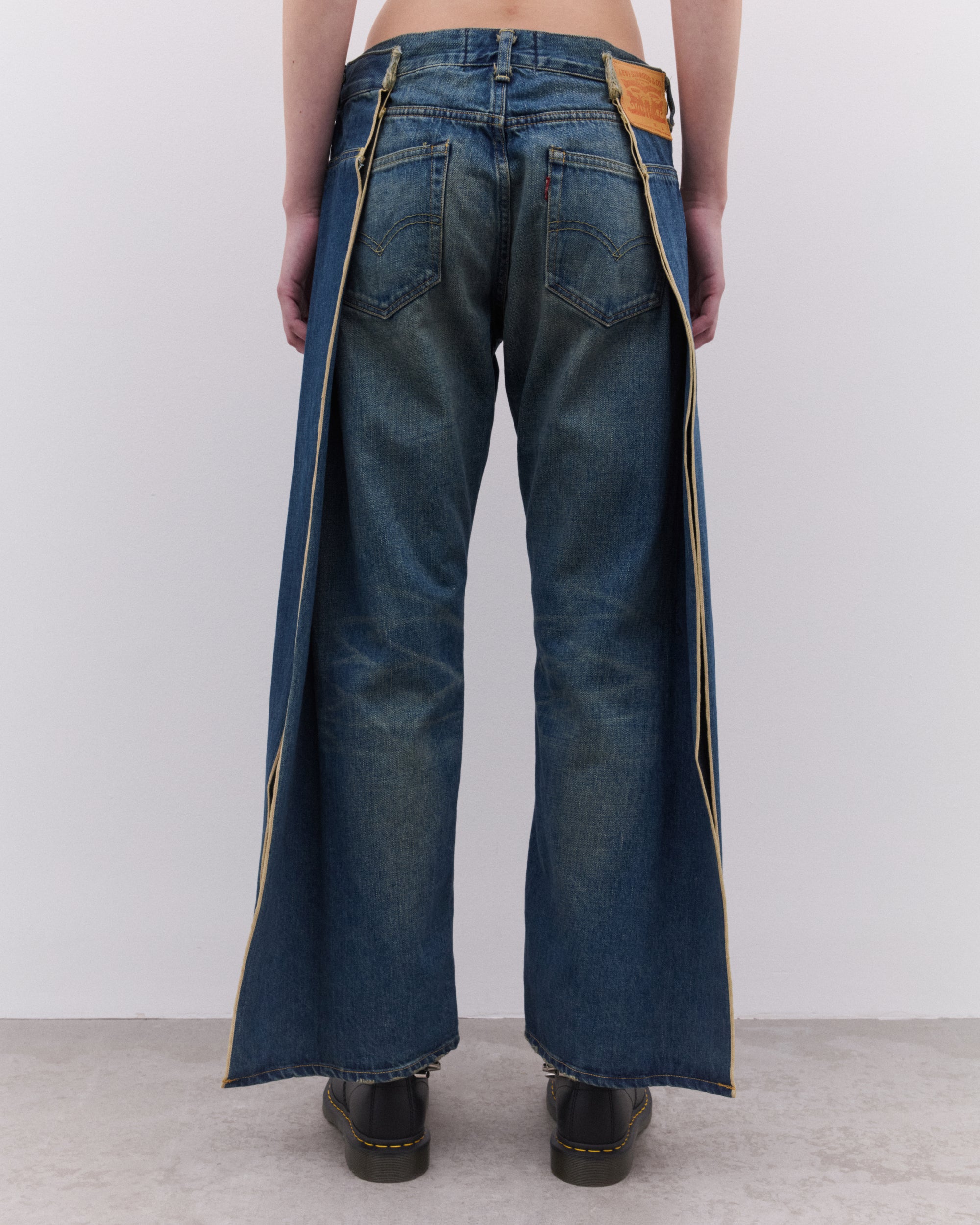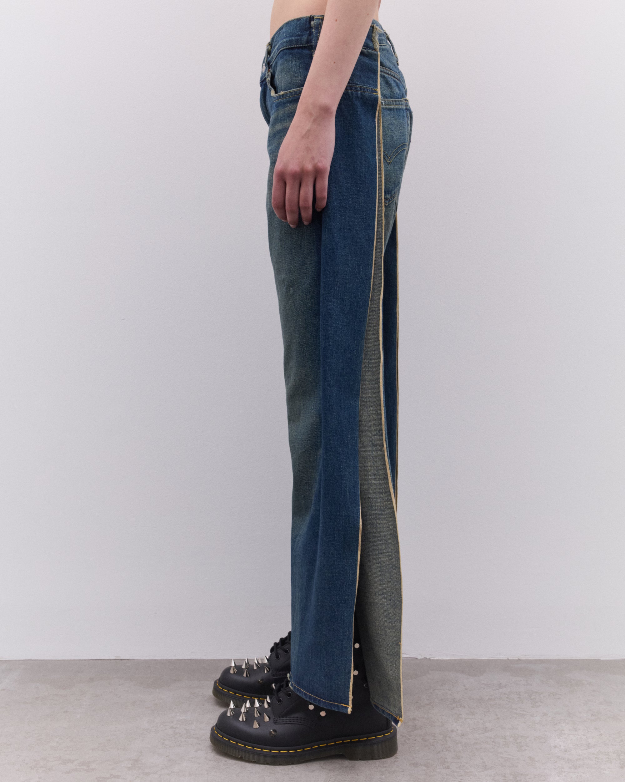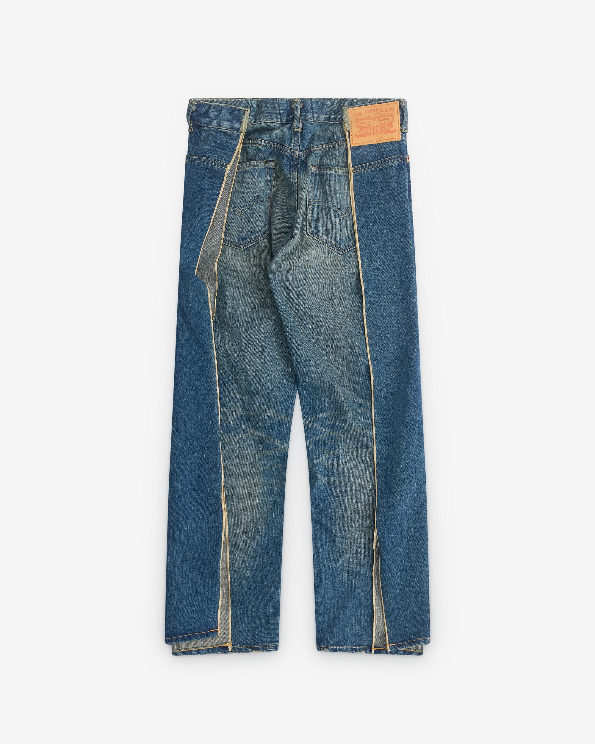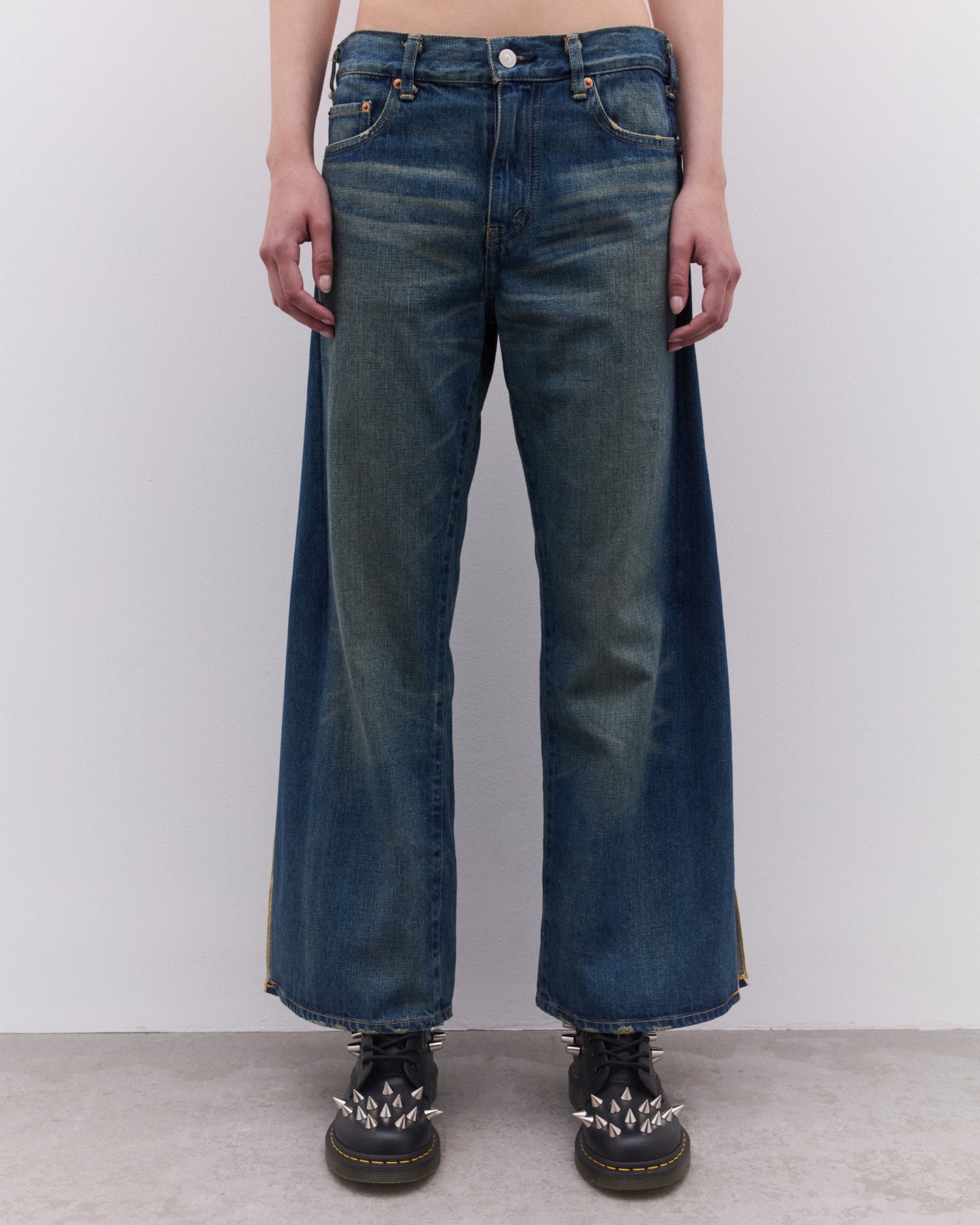 Straight legWashed finishRear fodled open seam5 pocket constructionButton and zip fly fastening