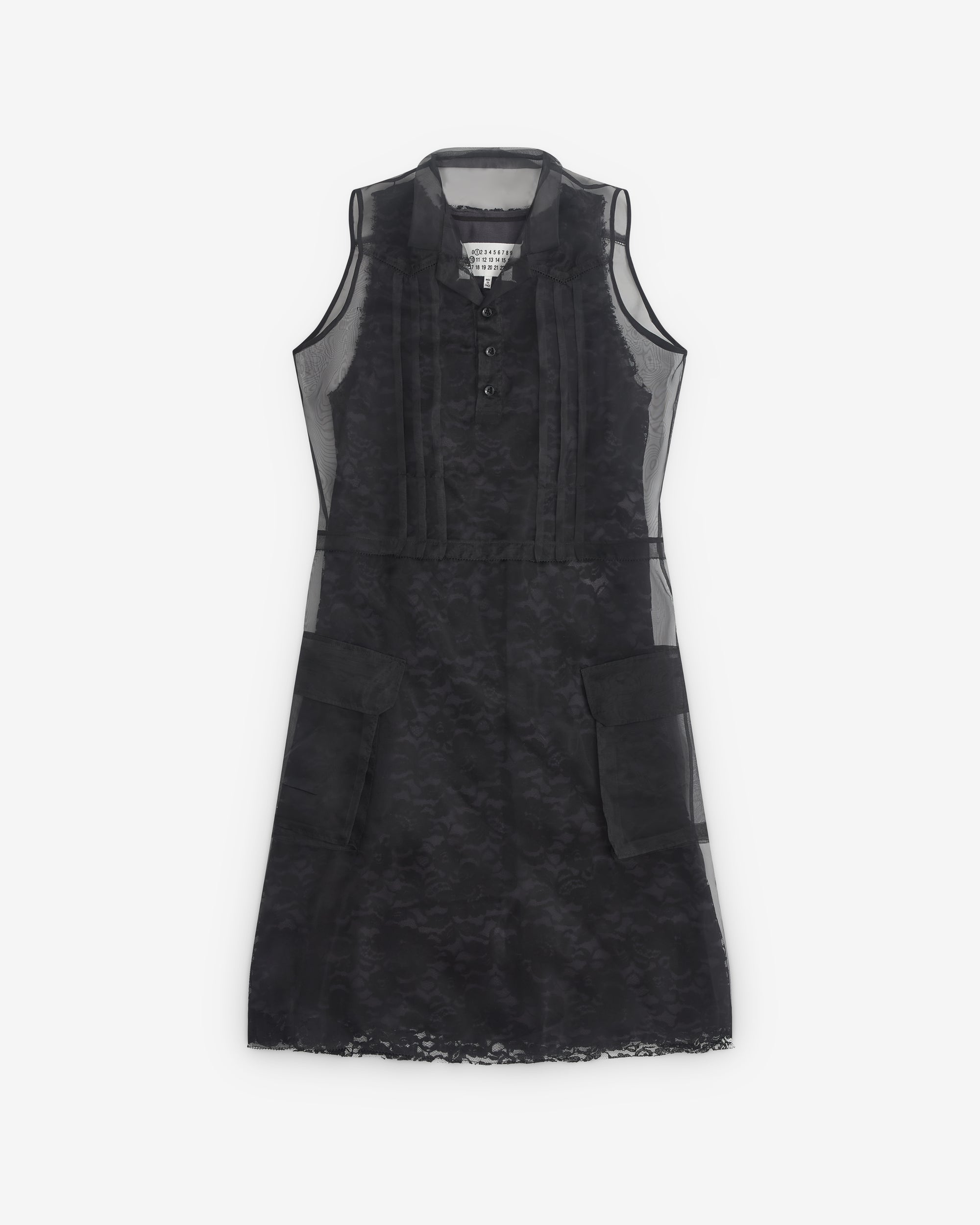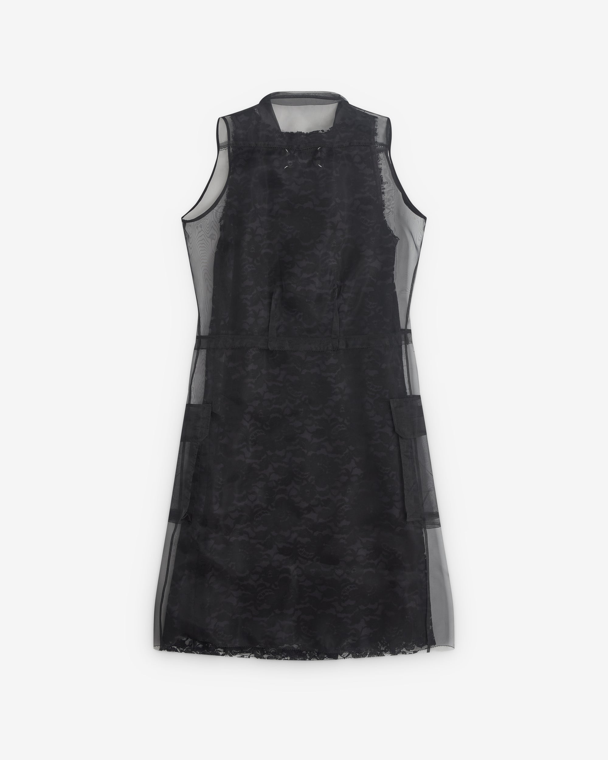 Sleeveless dress in sheer polyester organza with lace underlayer